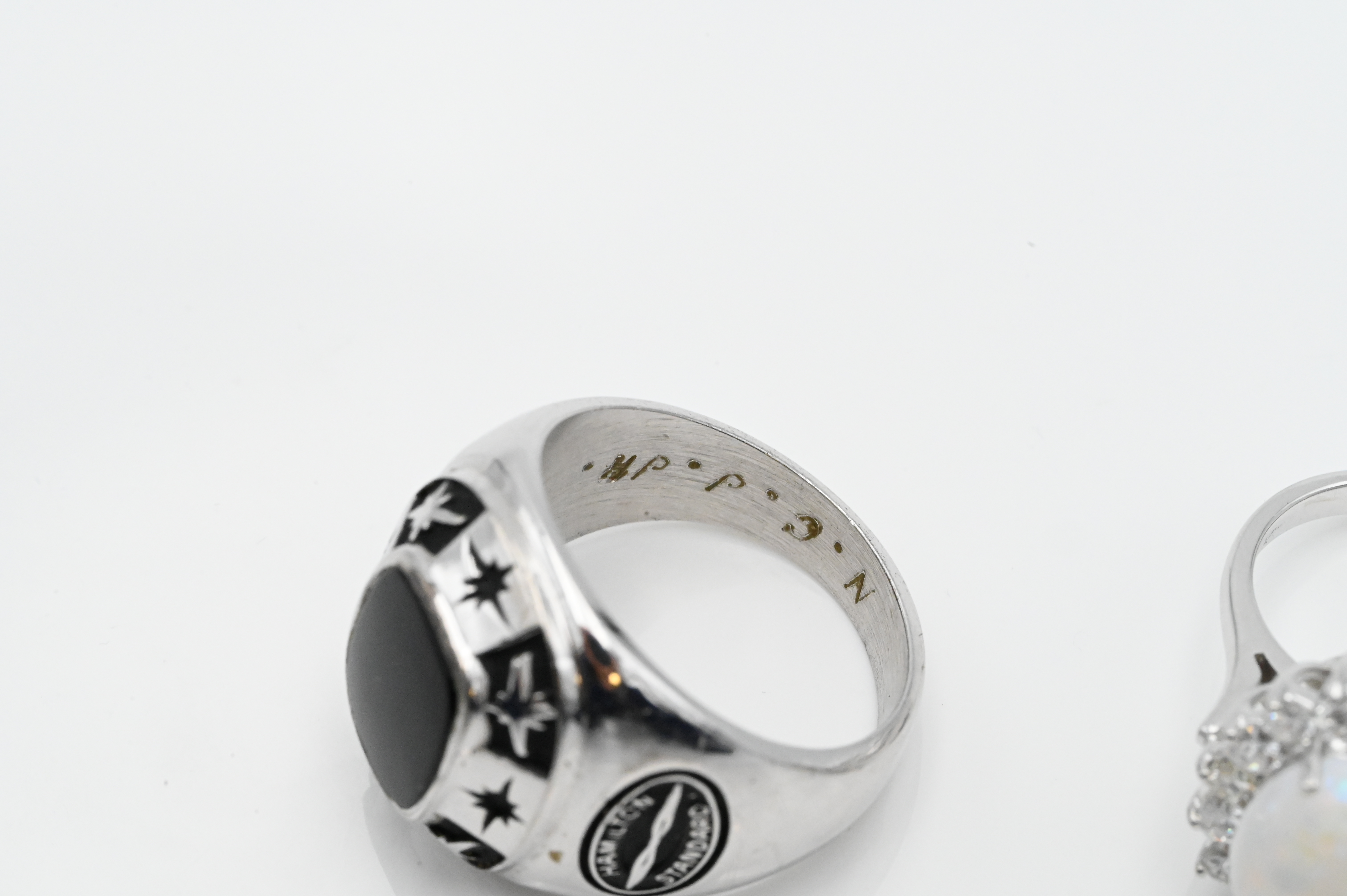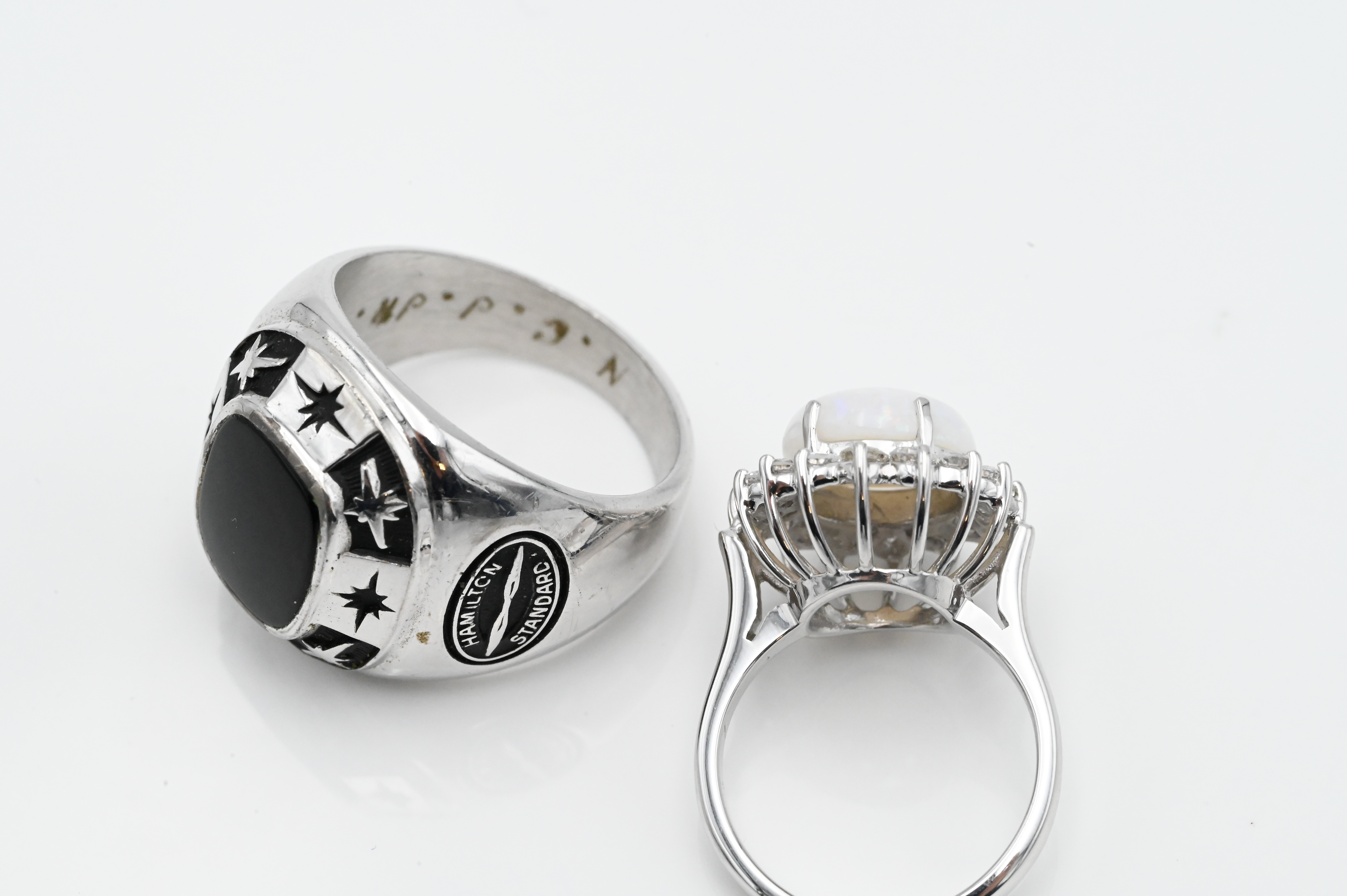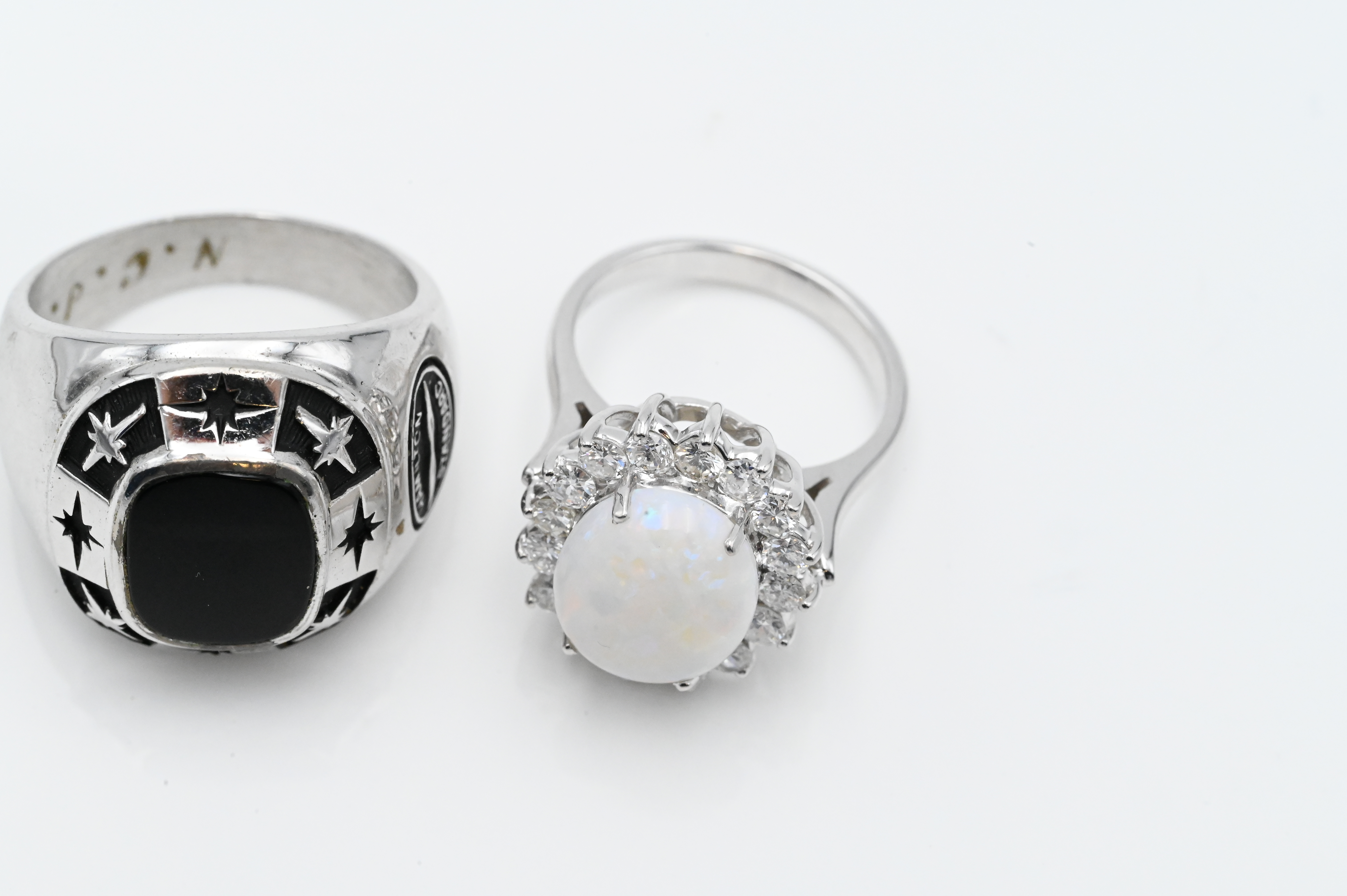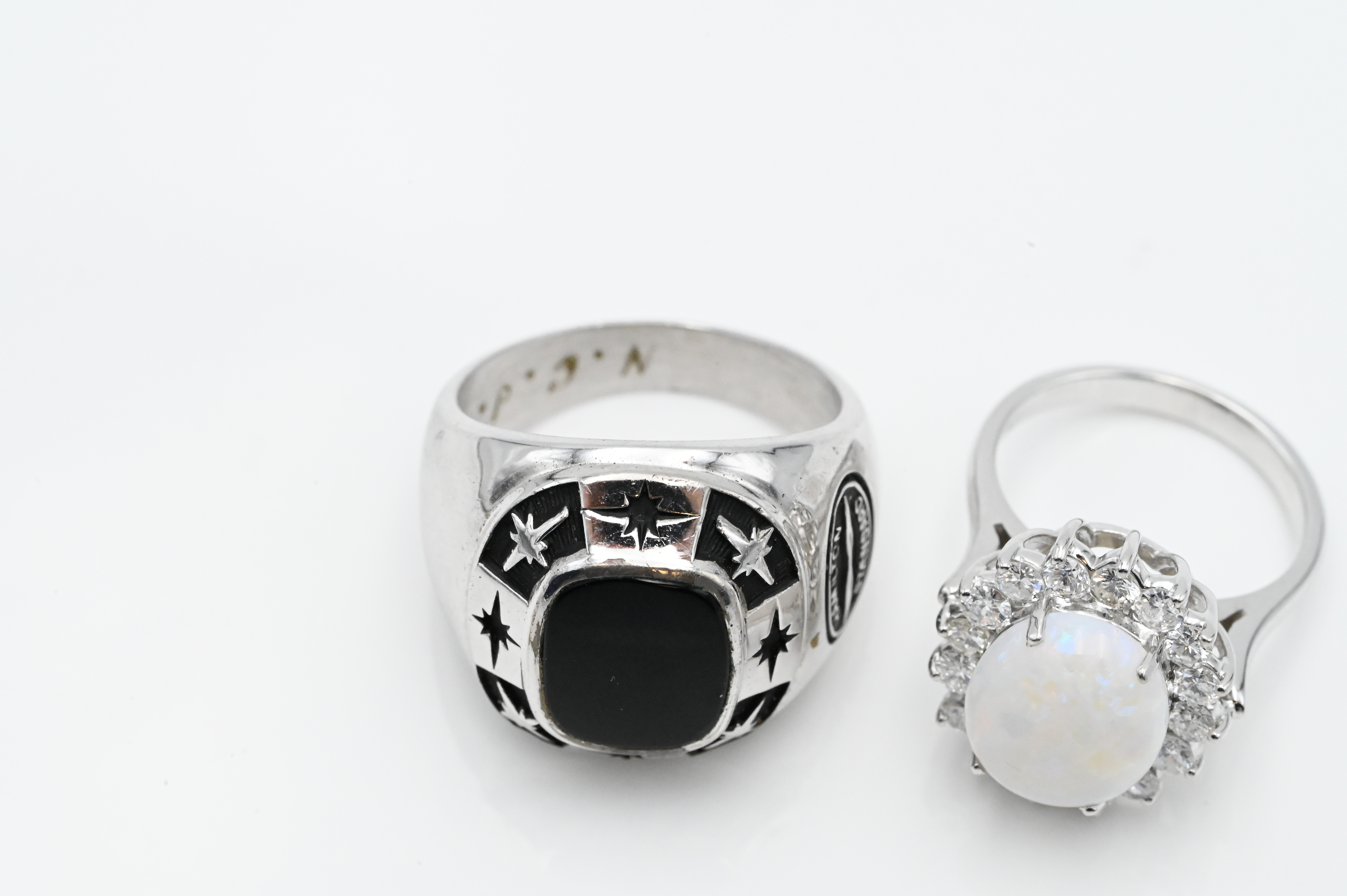 Two 14 Karat White Gold Rings, having center opal surrounded by diamonds, size 5 3/4 inches, sterling silver ring size 9 1/2 inches.