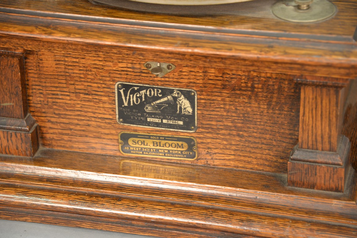 Victor V Talking Machine Phonograph Gramophone with wood horn in working condition, made by Victor Talking Mch. Co., Type Vic. V 2785d, sold by Sol Bloom. total ht. 29 in.
