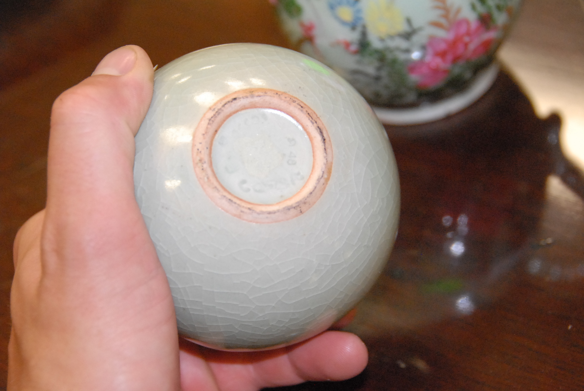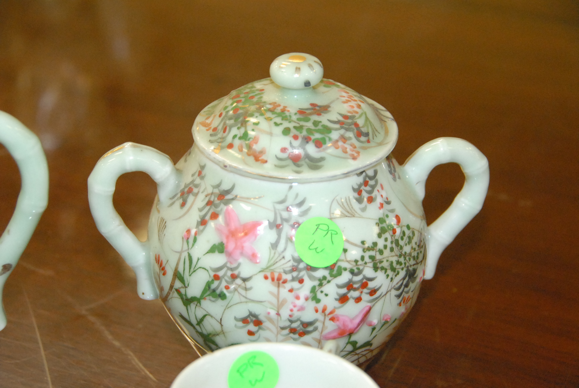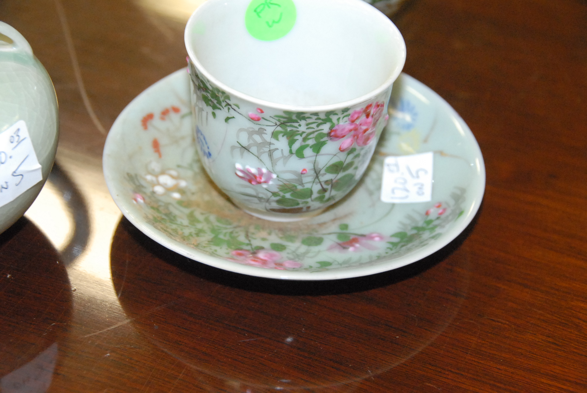 Five piece Celadon lot to include a two handled covered jar, creamer, cup, vase, and a saucer.