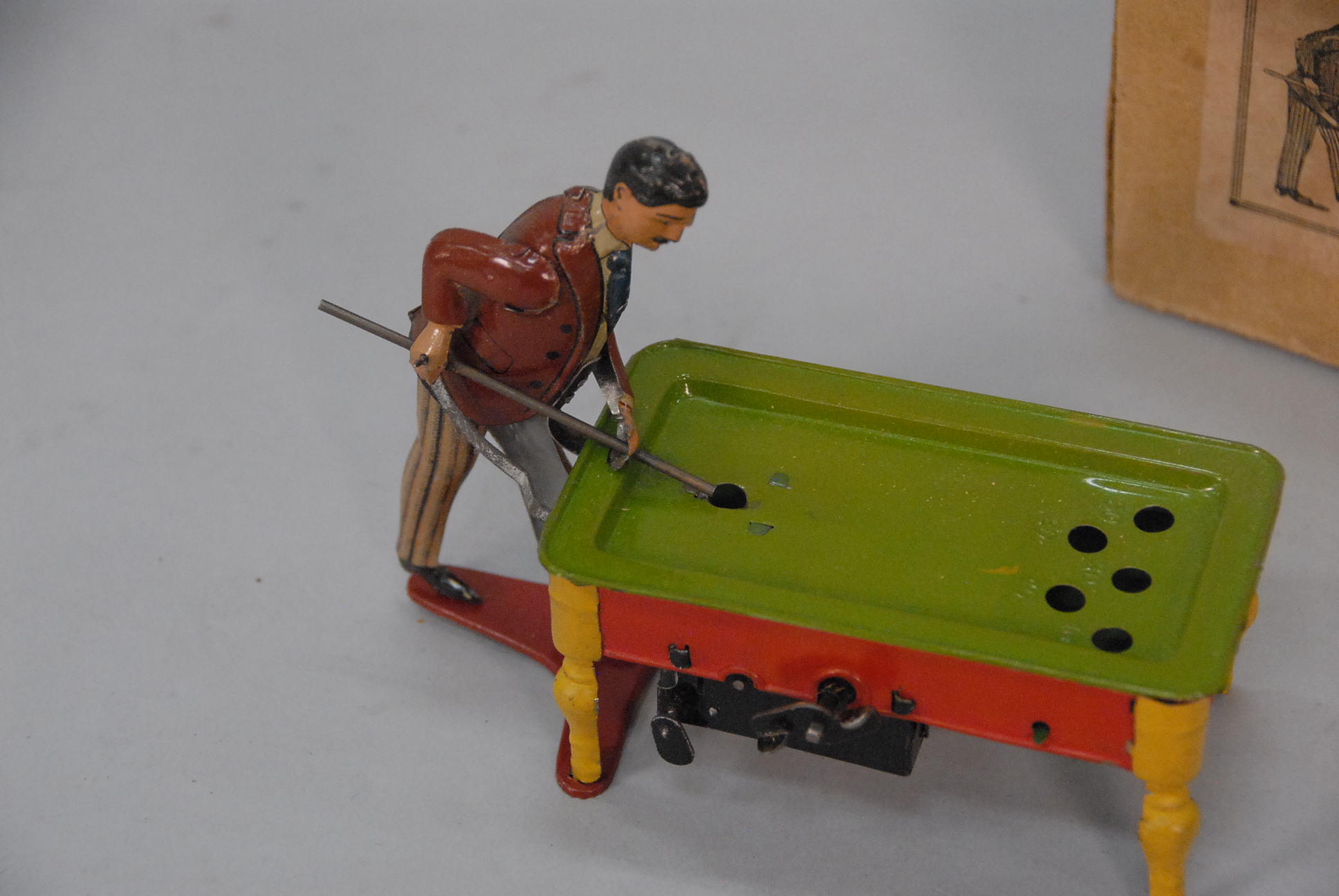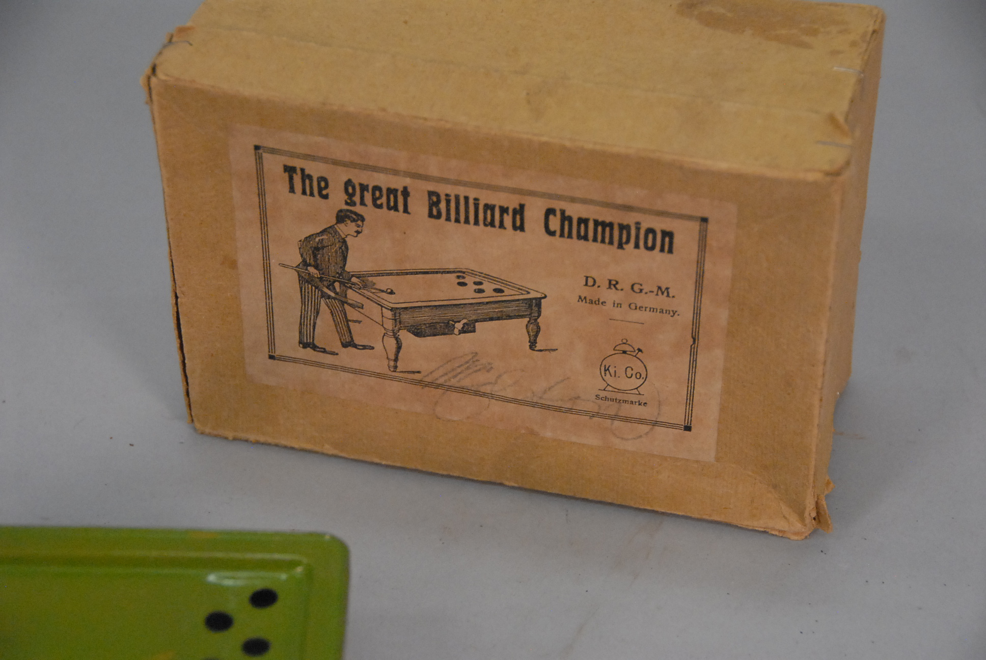 Lot 121: Antique German D.R.G.-M. Ki. Co. tin toy The Great Billiard Champion in original box. lg. 6in.