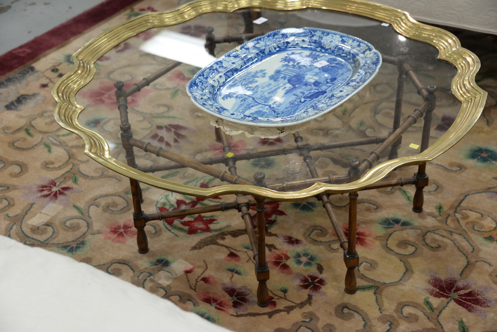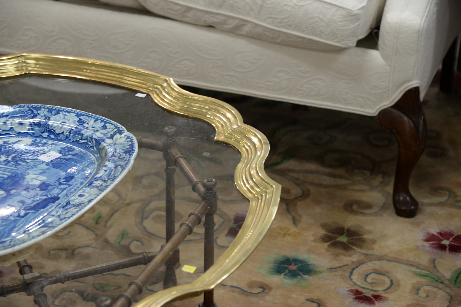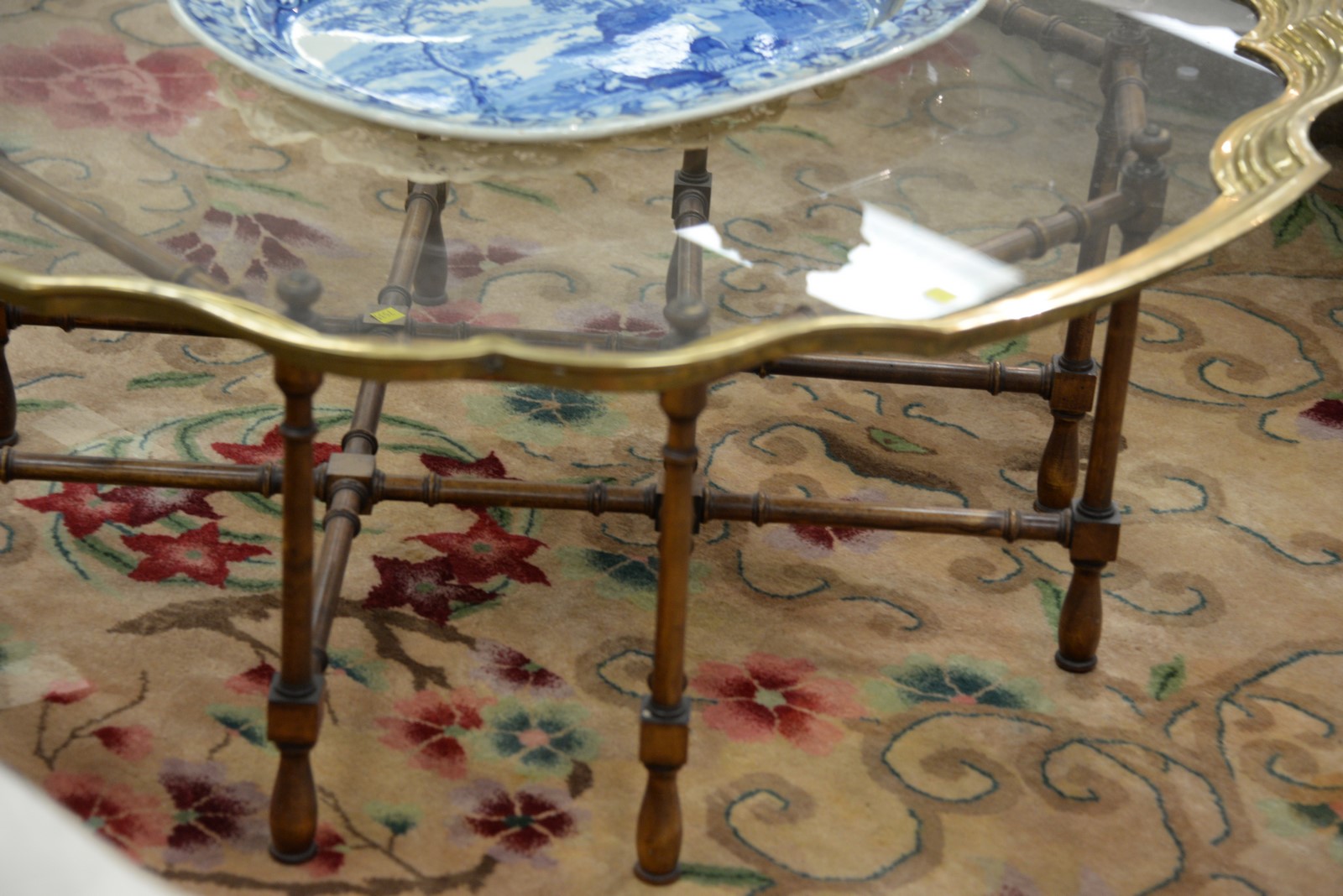 Lot 121: Baker coffee table with shaped glass, brass trim, and bamboo turned legs.ht. 17 in. top: 42 x 42