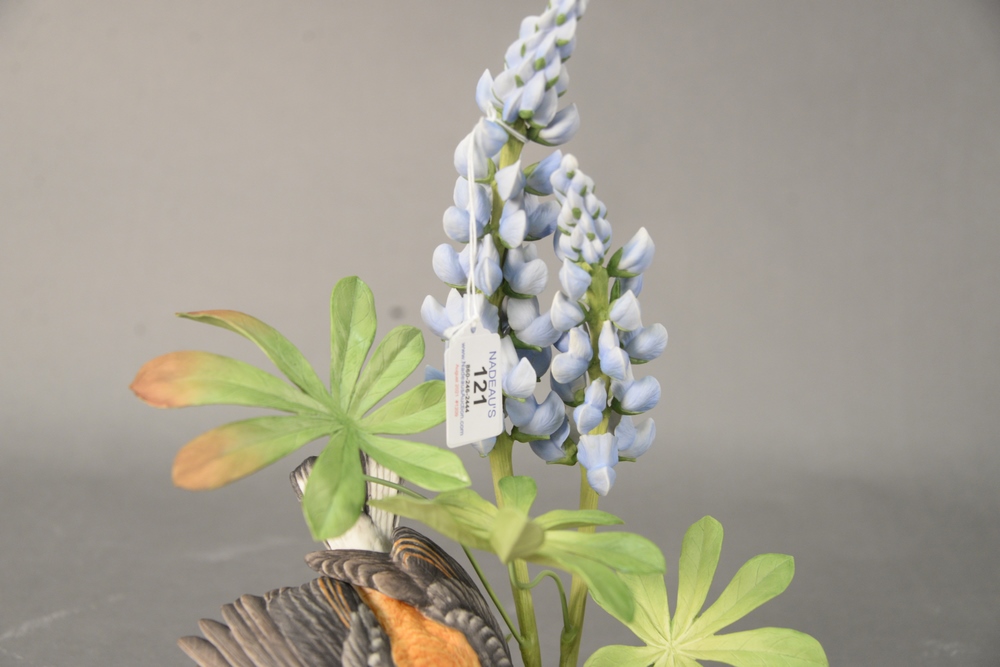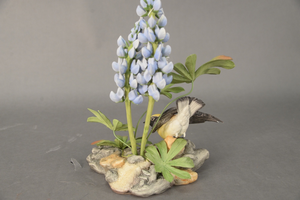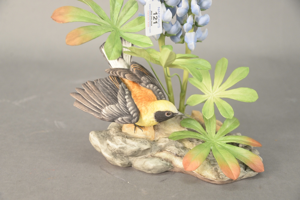 Lot 121: Boehm Porcelain Sculpture “Black-Eared Wheatear,” from the Judaic collection, marked and numbered “23” on the underside, having smal…