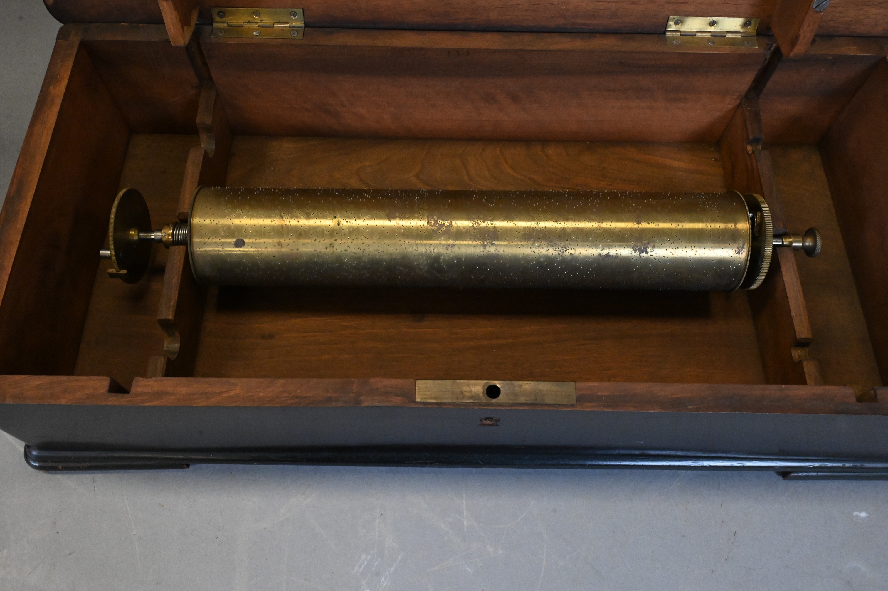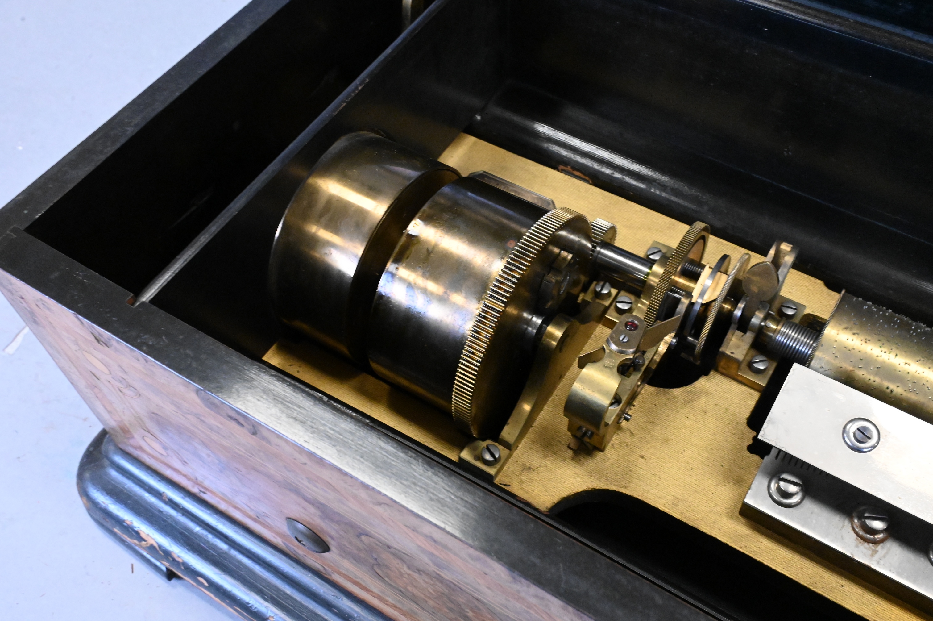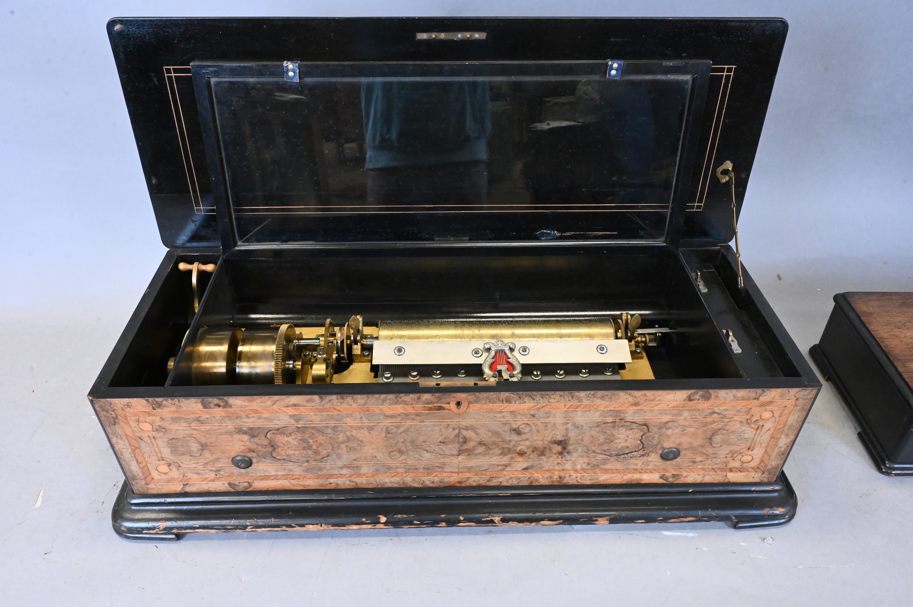 Swiss coin-operated music box in a finely figured burl-wood case with contrasting banded inlay and ebonized trim, complete with its original hand-crank and key, fitted with a pinned brass cylinder and comb beneath a glazed dust cover, the box plays eight tunes, as listed on the original printed and hand-annotated tune card mounted inside the lid, including works by Mozart, Verdi, and others