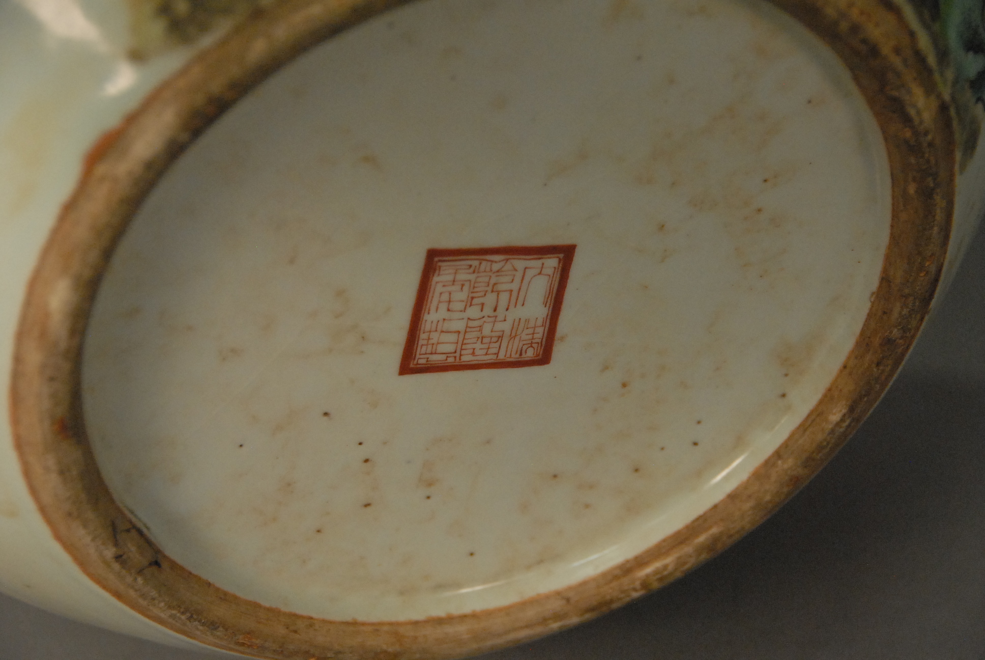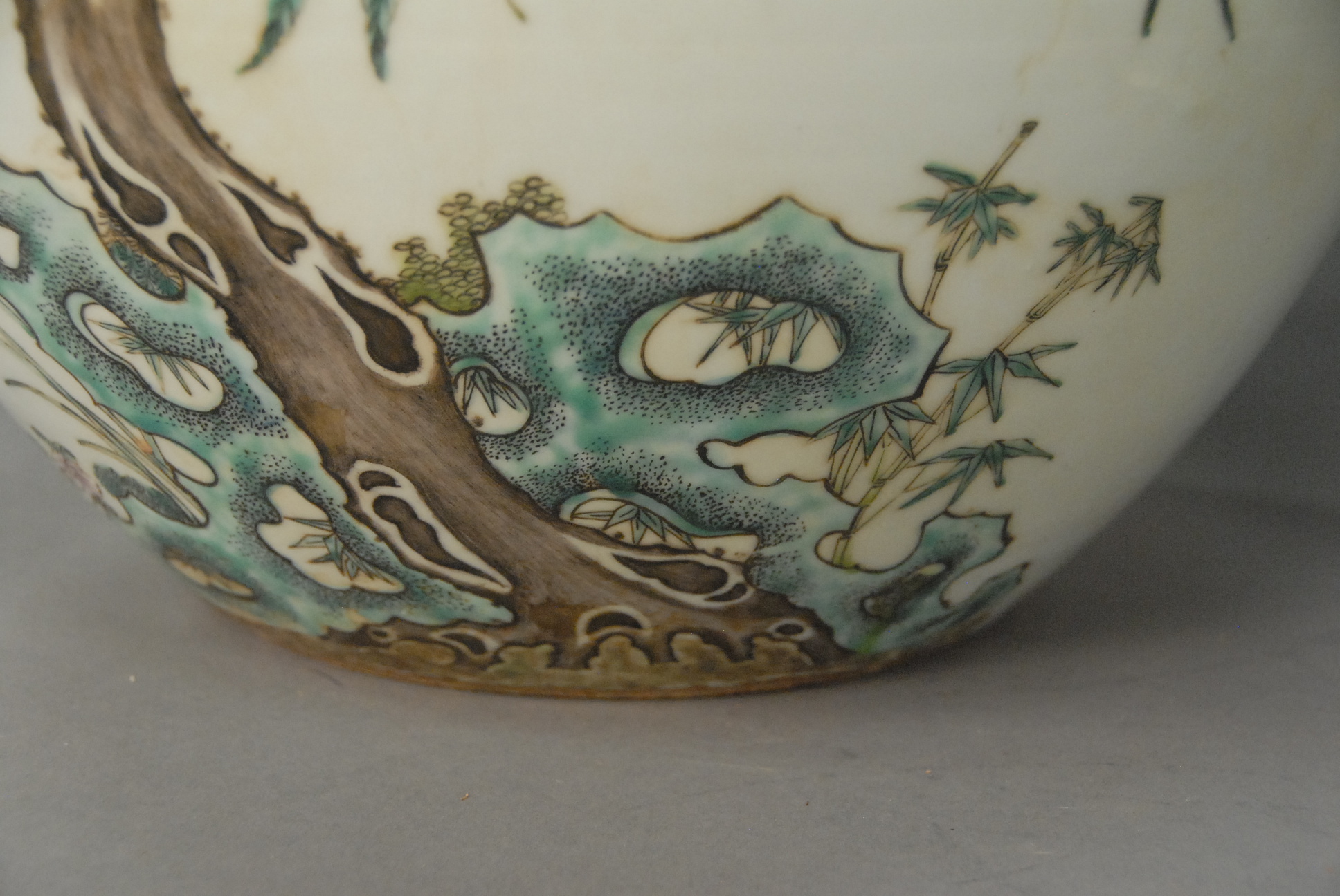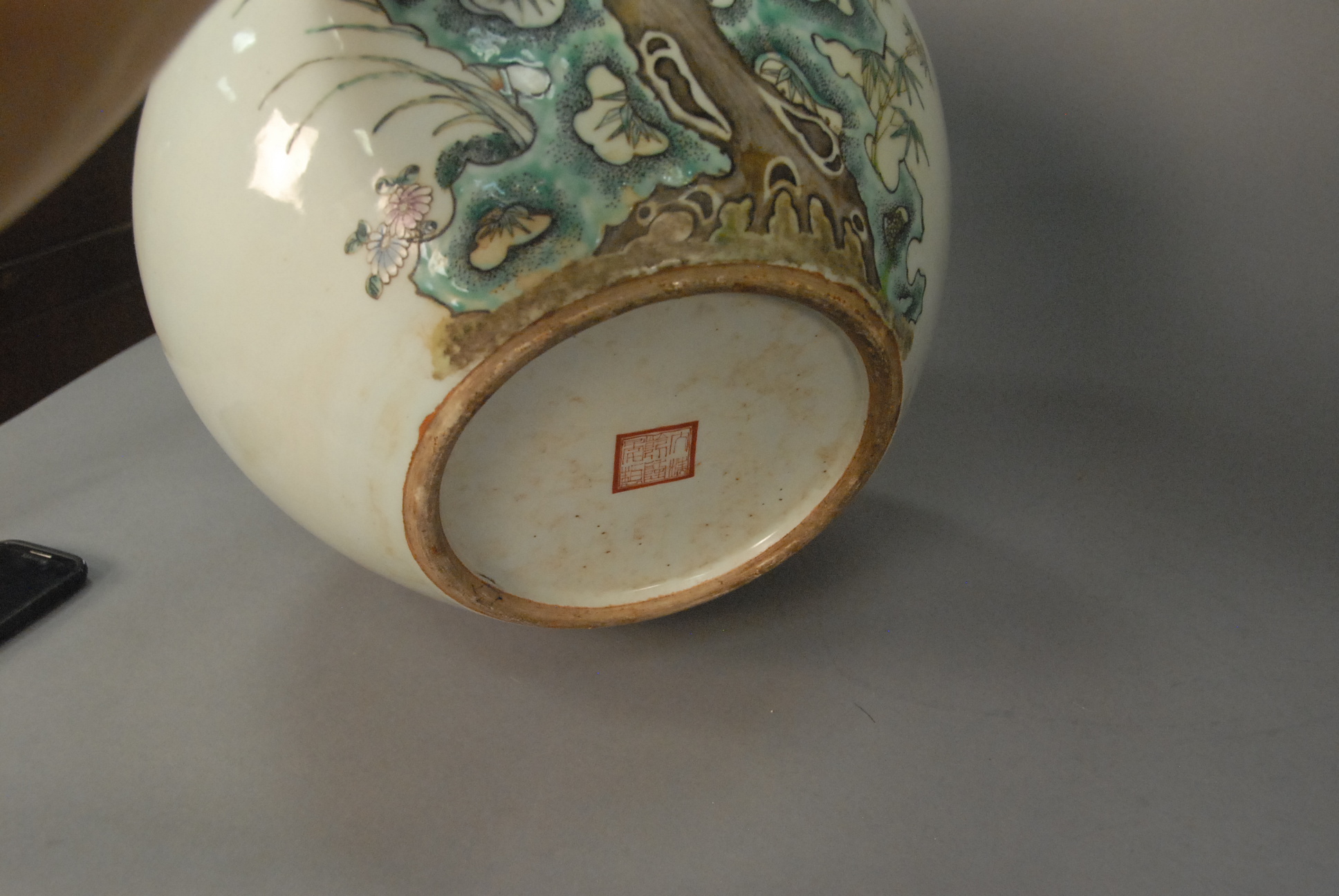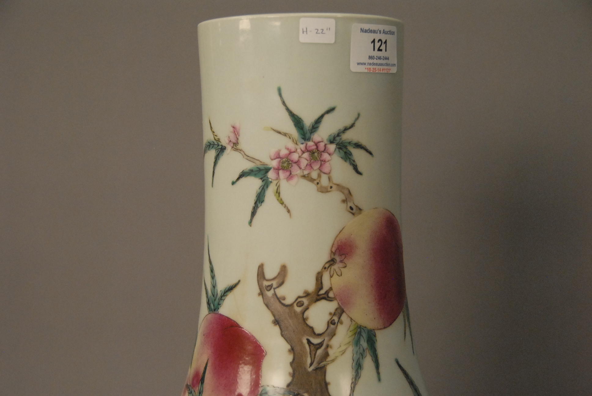 Lot 121: Chinese Famille Rose peach vase with globular body and tall cylindrical neck having enameled nine peach design on scrolling flowering tree, probably 20th century. ht. 22 in. dia. 13 1/2 in.