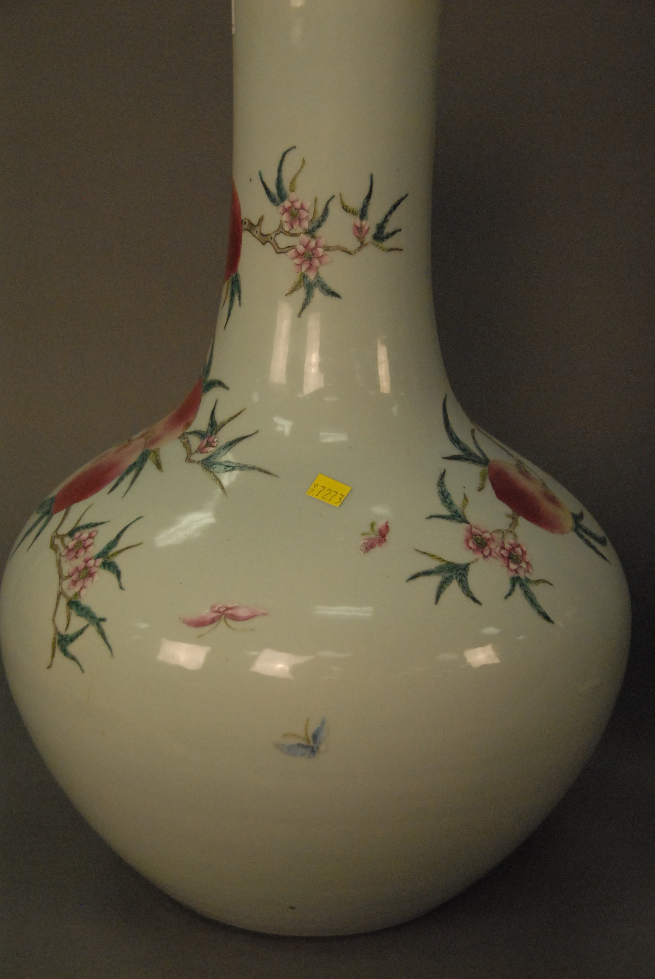 Chinese Famille Rose peach vase with globular body and tall cylindrical neck having enameled nine peach design on scrolling flowering tree, probably 20th century. ht. 22 in. dia. 13 1/2 in.