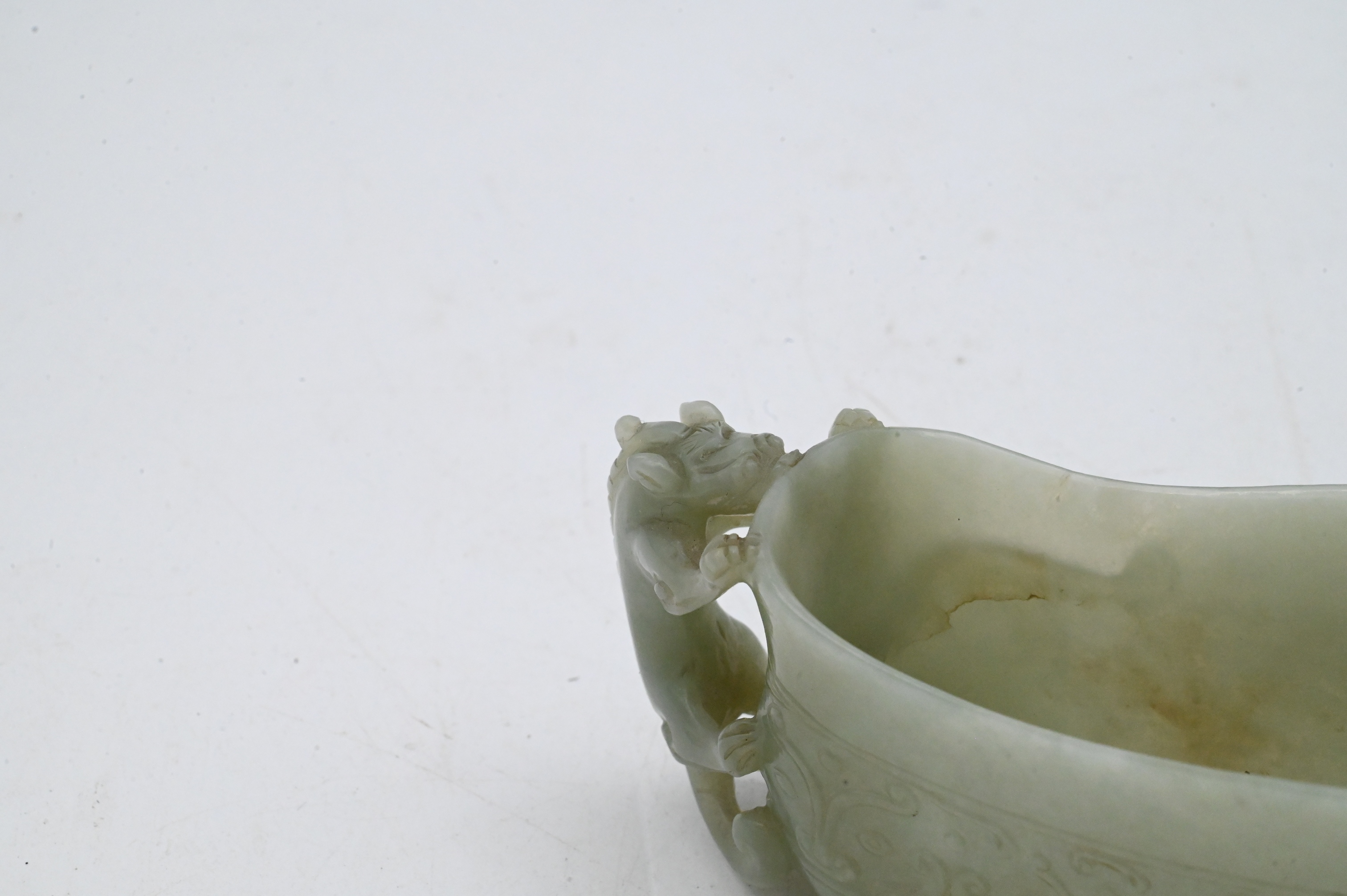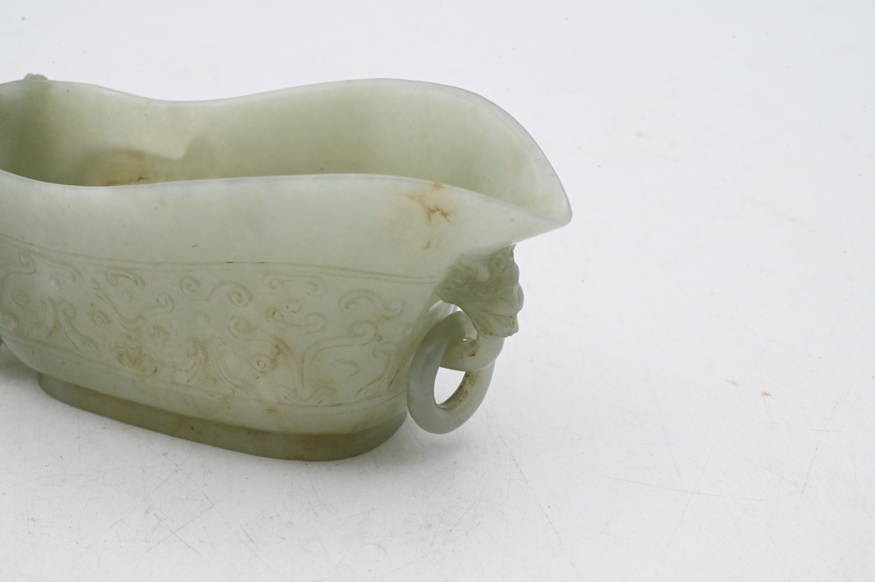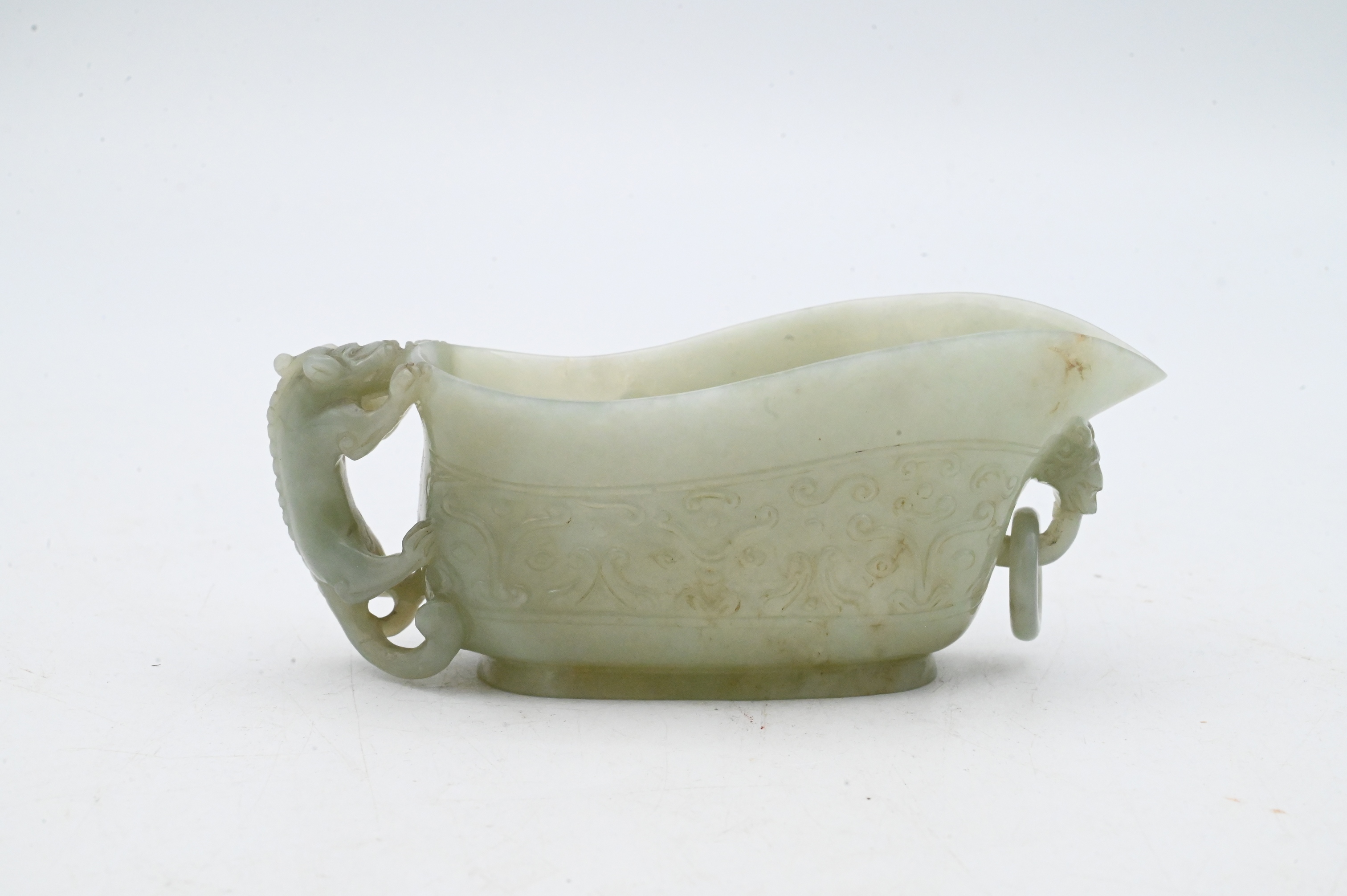 A carved pale celadon jade libation cup with russet inclusions, the body decorated in low relief with scrolling motifs, fitted with a dragon-form handle and a carved ring mounted with a head. Raised on a footed base.