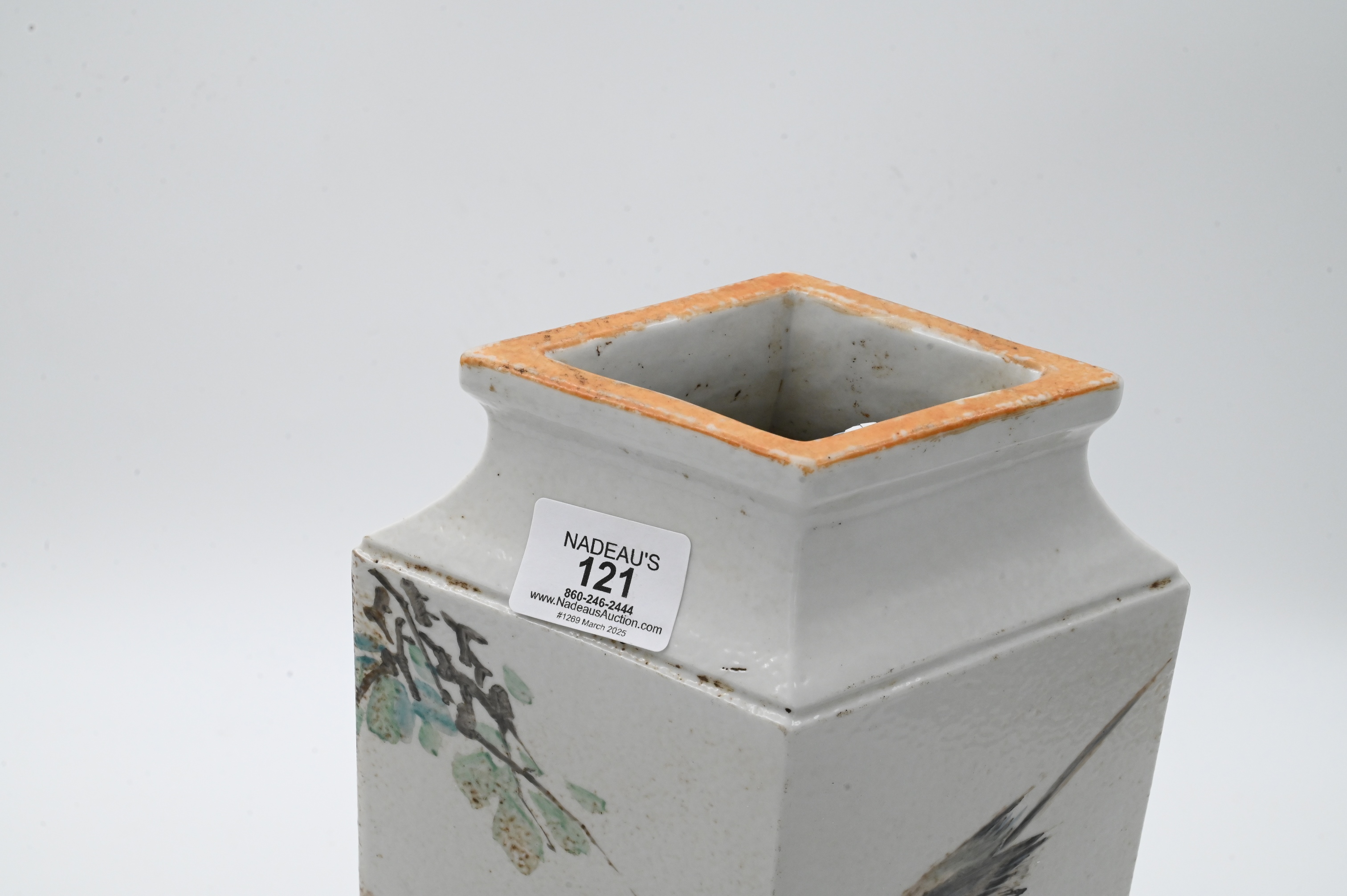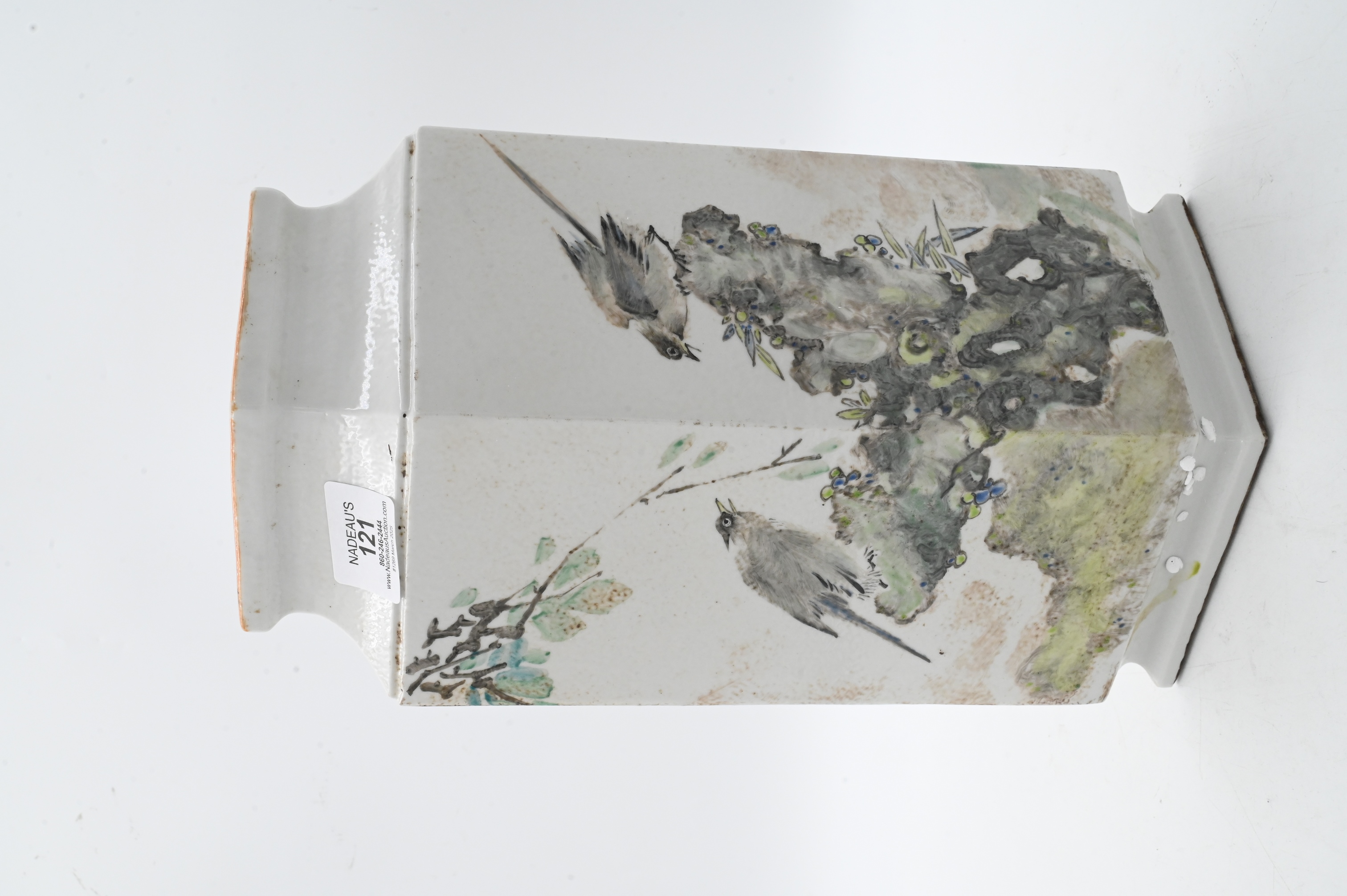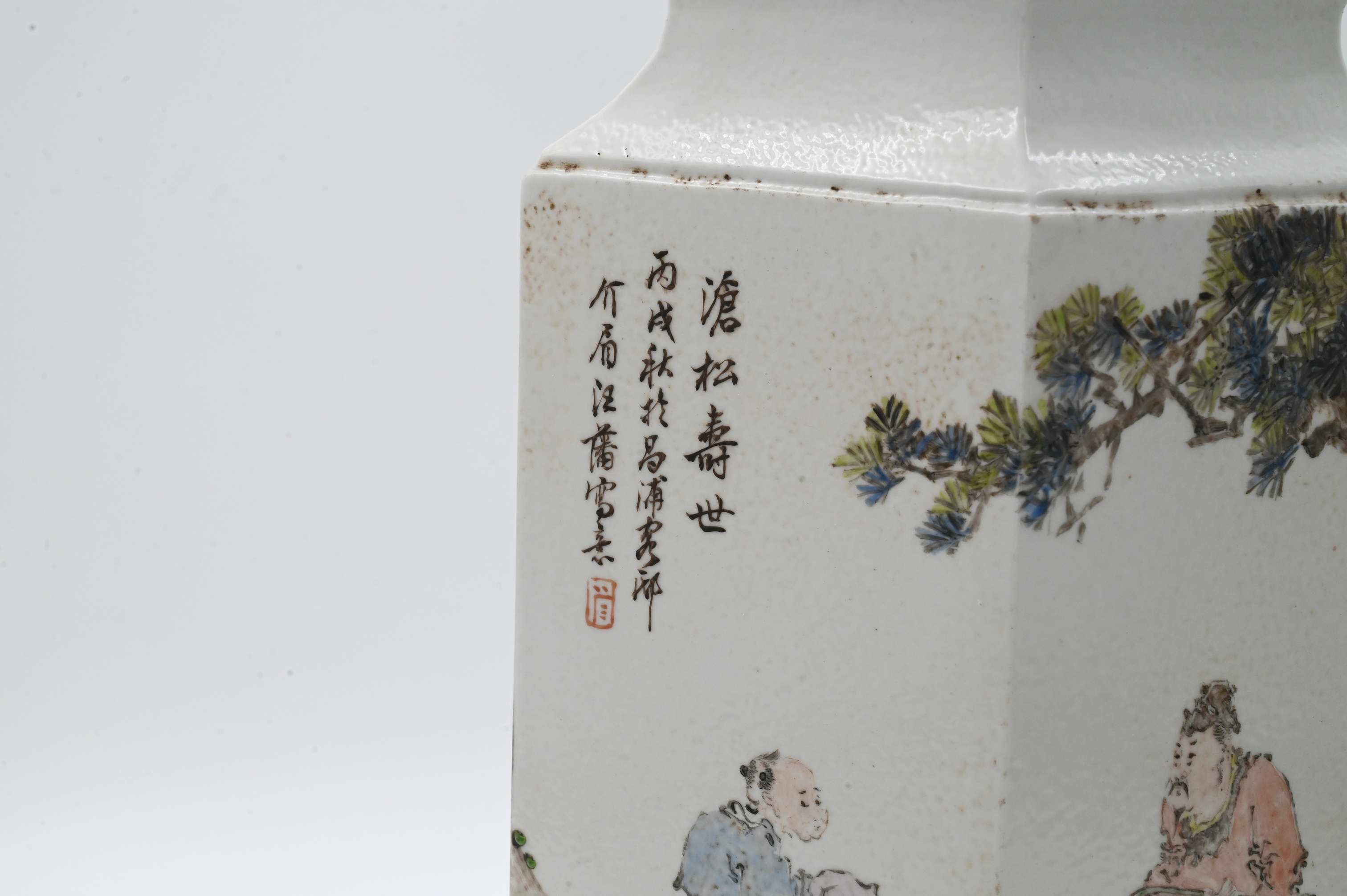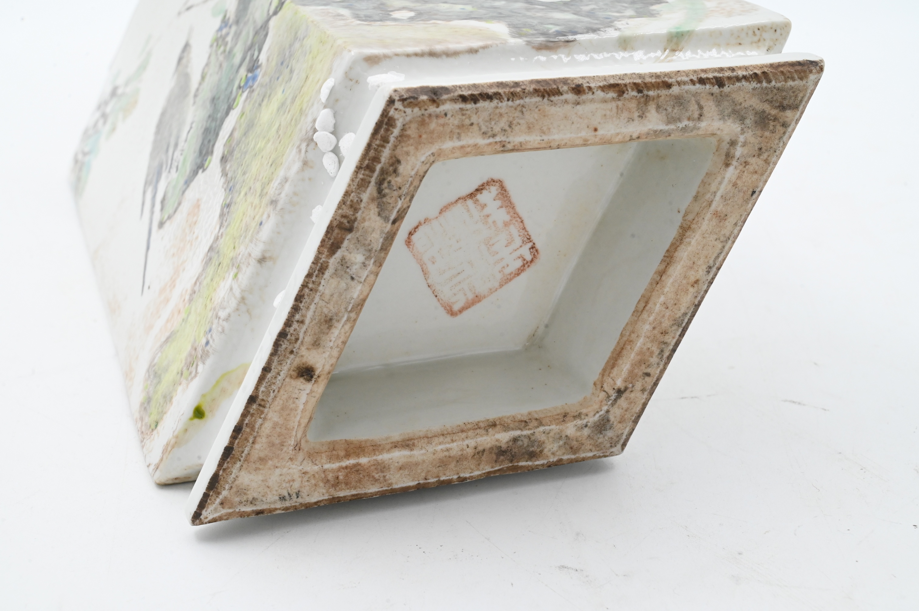 elongated square vase having scholar motif, in Qianjiang style, having red character marks