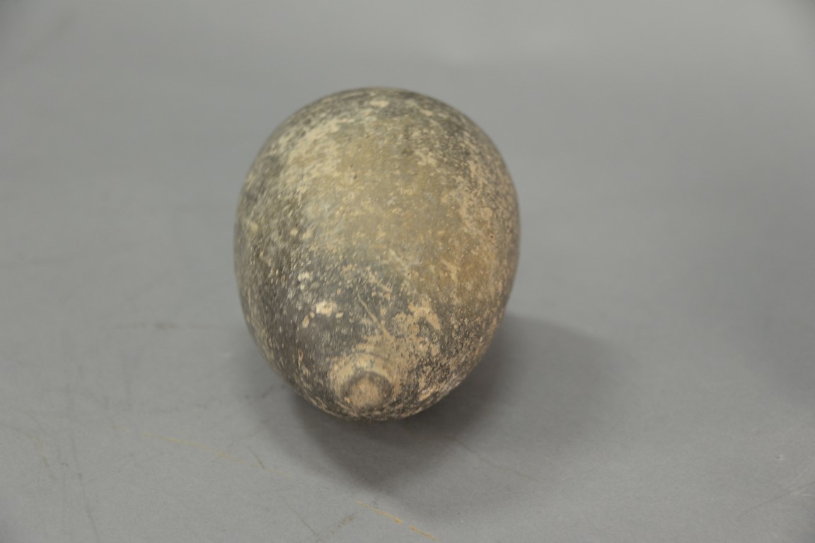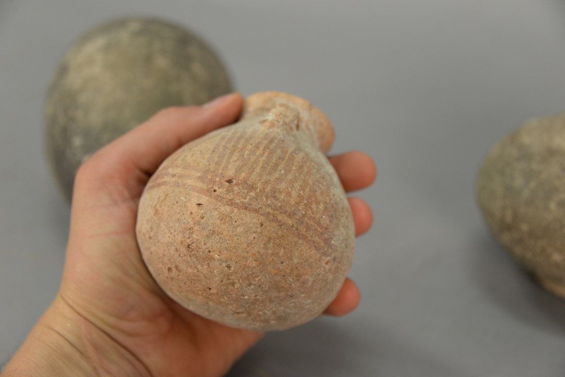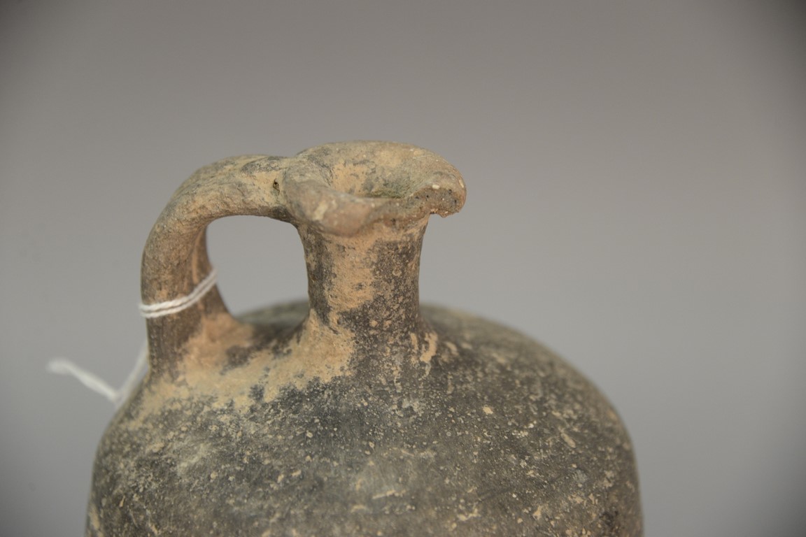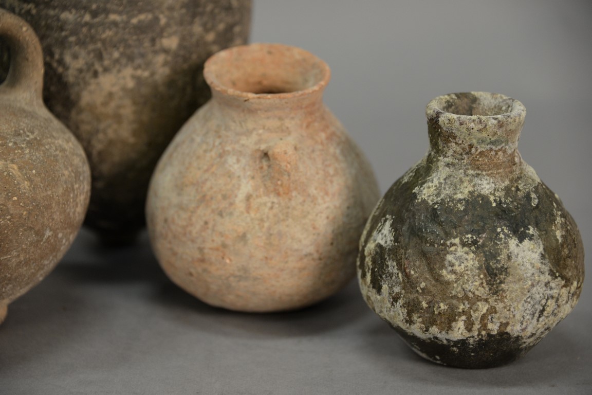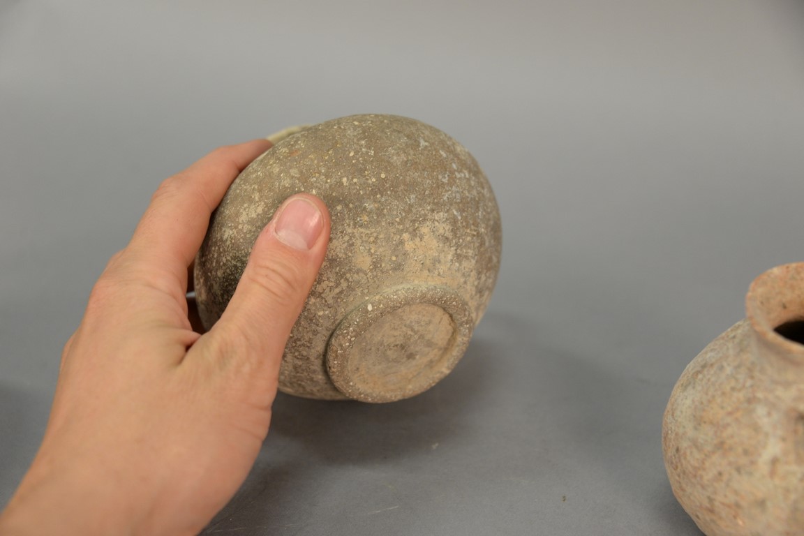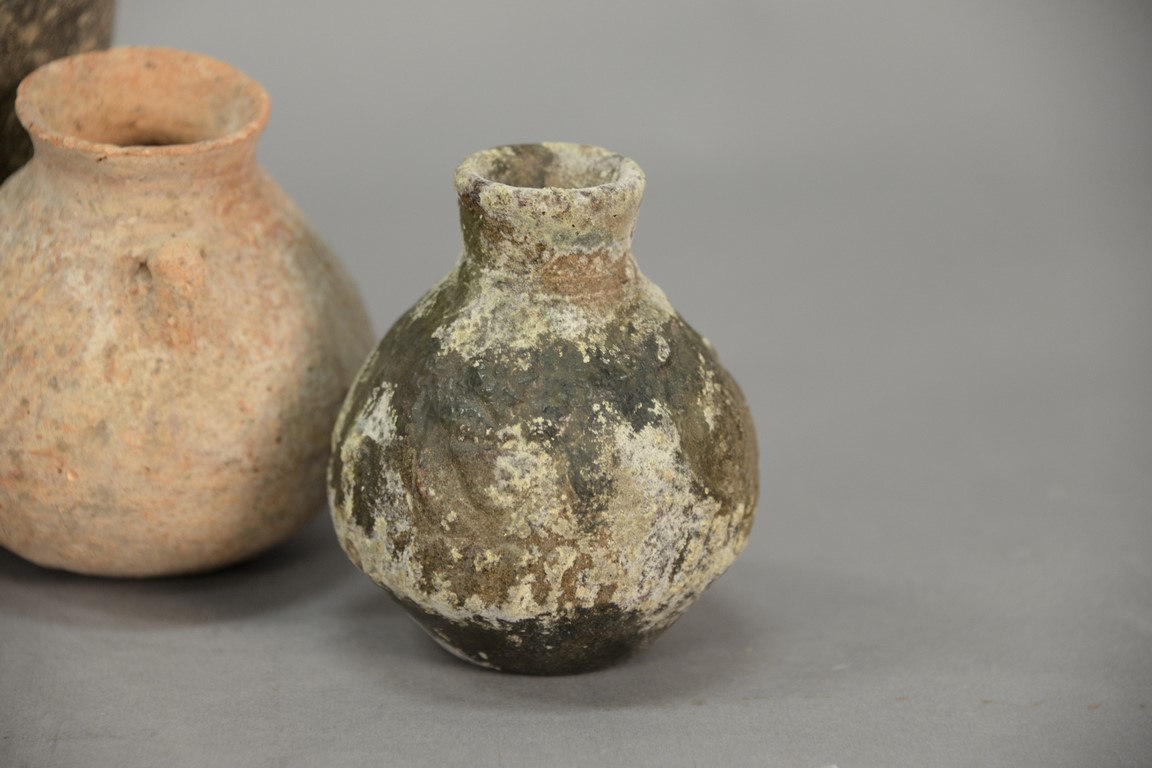 Lot 121: Four ancient stone and clay urns including a terracotta handled vase, two stone handled jugs, and a small molded vase. ht. 3 3/4in. …