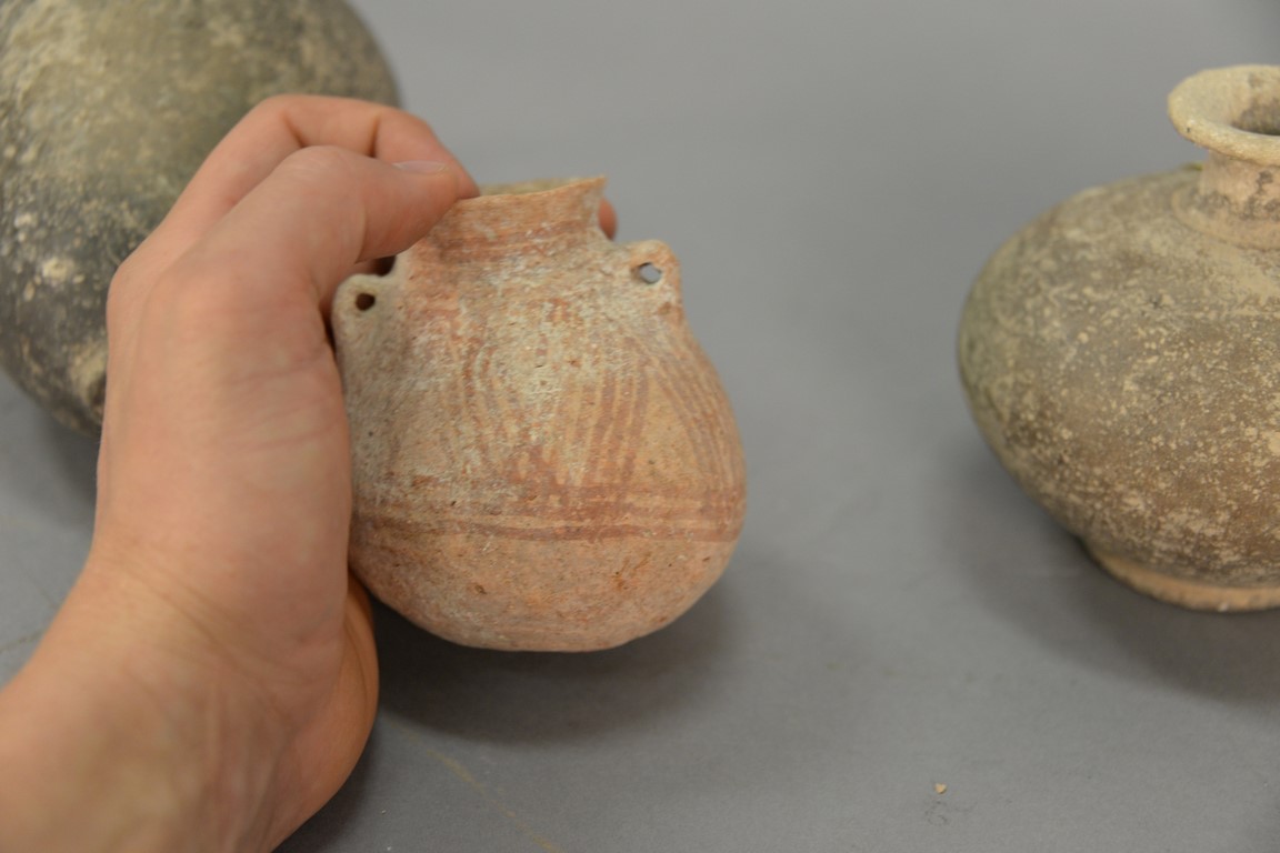 Four ancient stone and clay urns including a terracotta handled vase, two stone handled jugs, and a small molded vase. ht. 3 3/4in. to 7 1/8in.
