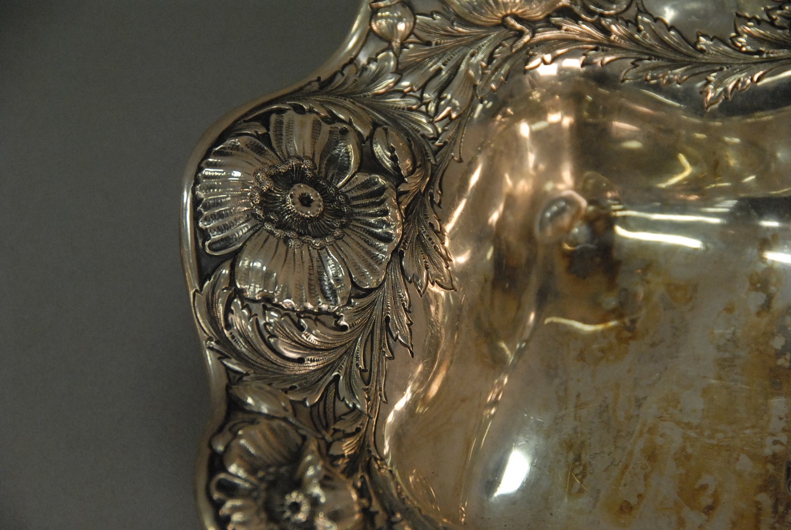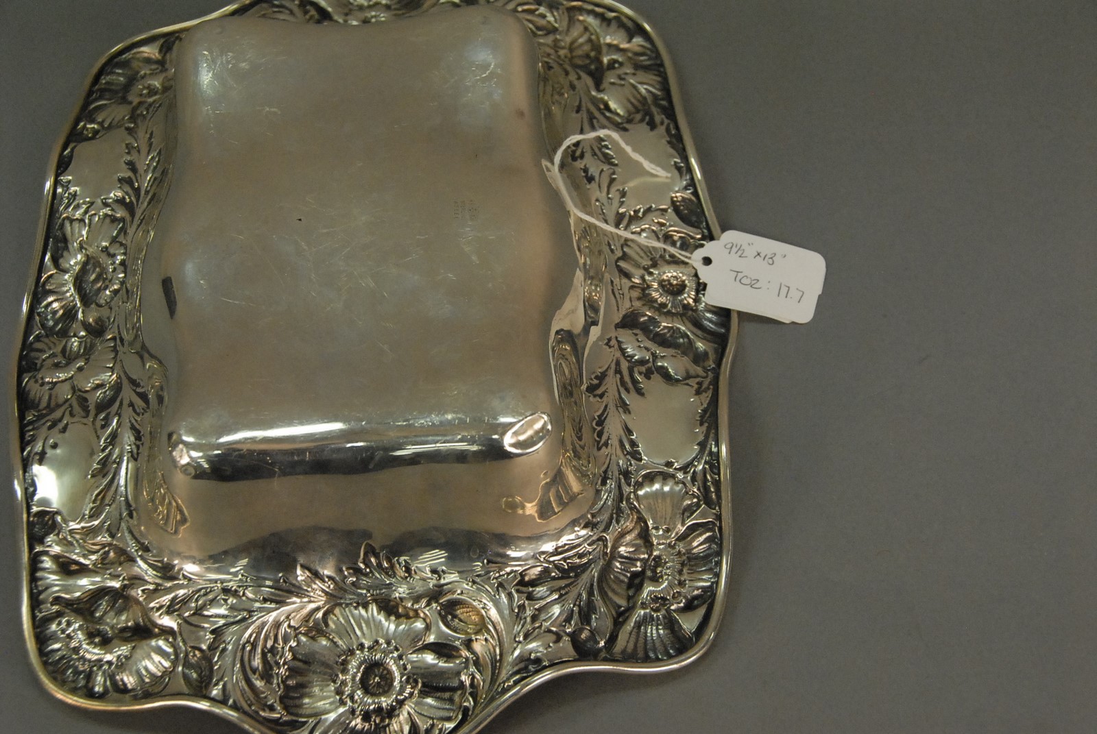 Lot 121: Gorham sterling silver rectangular bowl with repousse floral borders, monogrammed. 9 1/2 x 13 17.7 t oz.