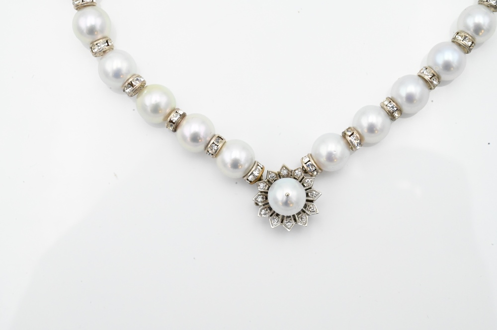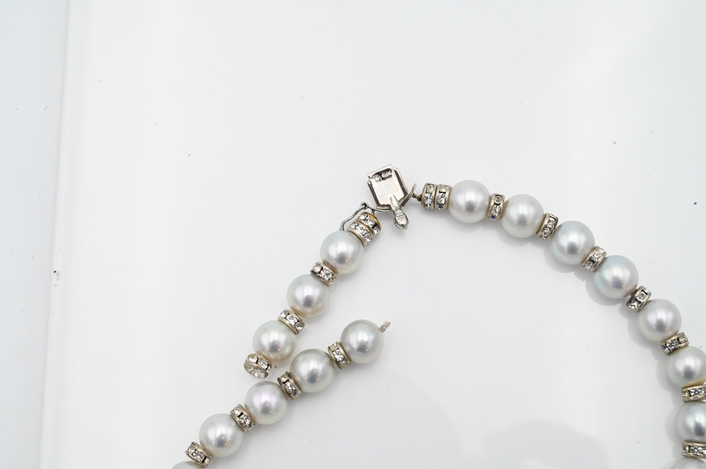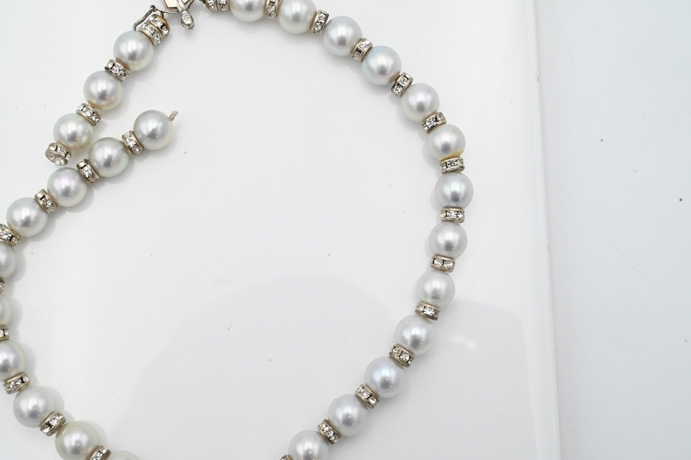 Lot 121: Grey Pearl and Diamond Bracelet, having 14 karat gold clasp mounted with diamonds, (needs to be repaired), length 13 1/2 inches.