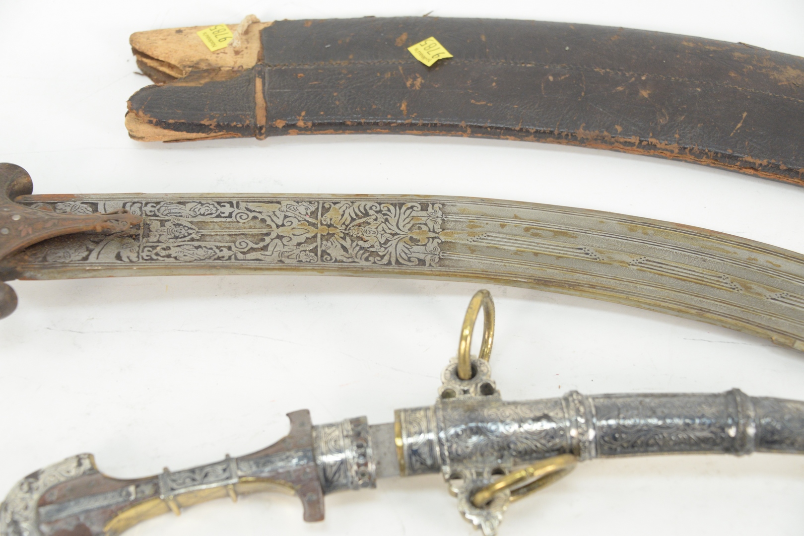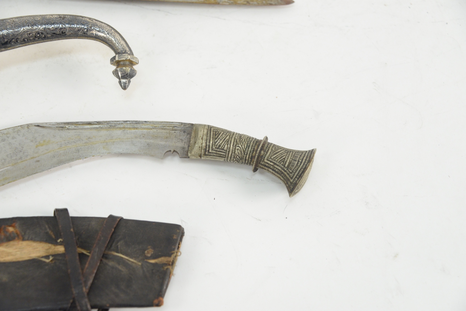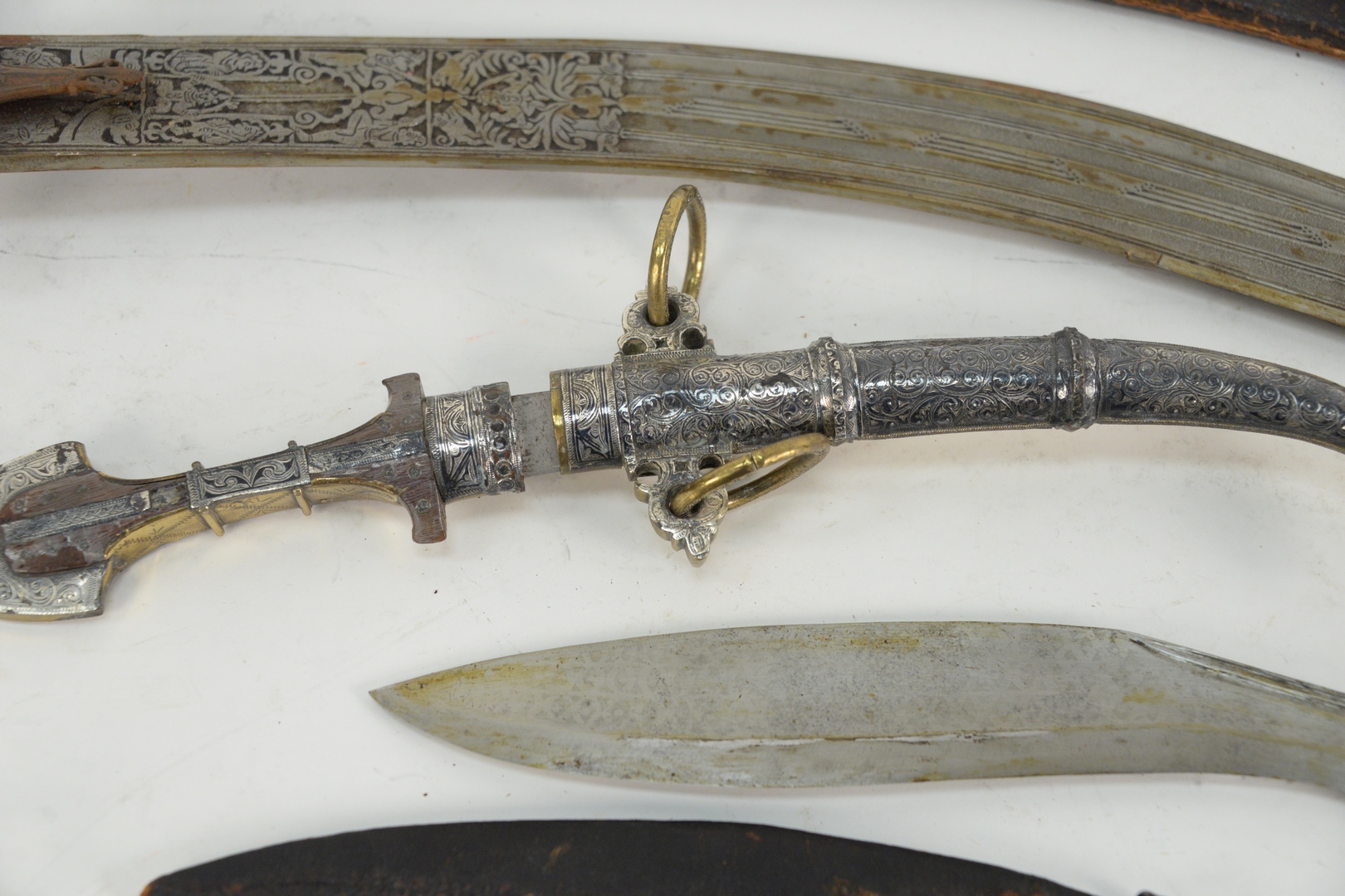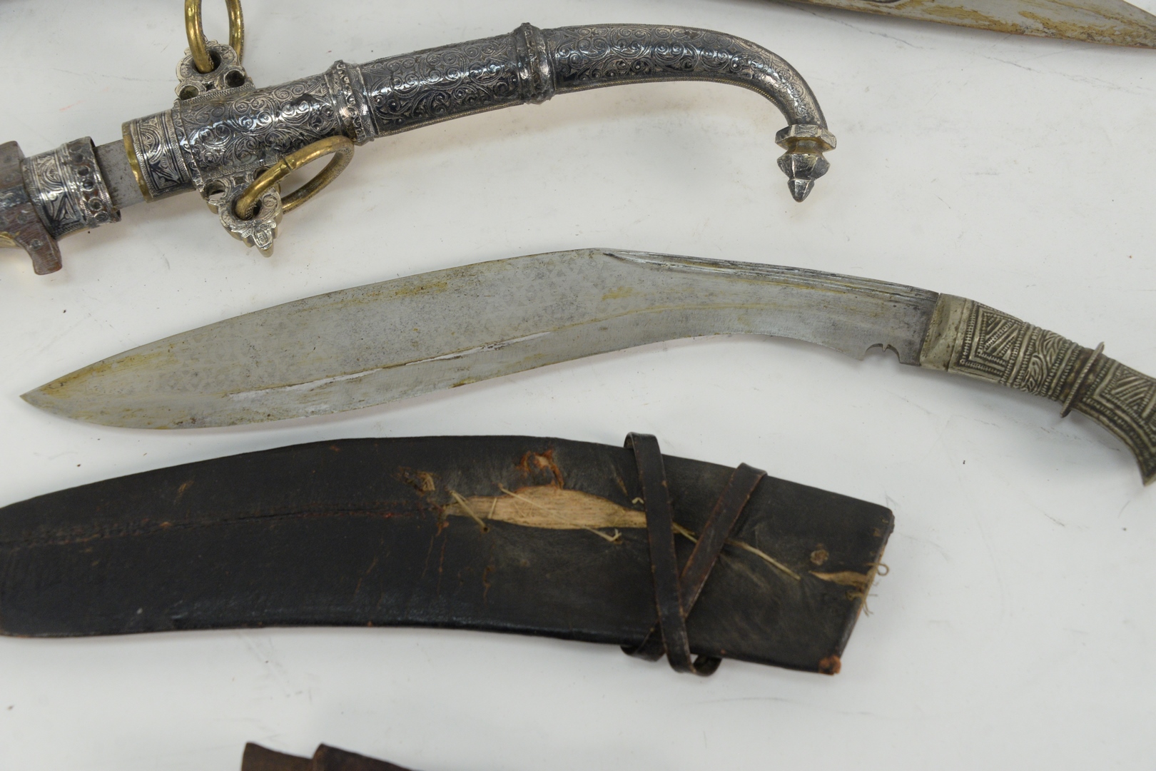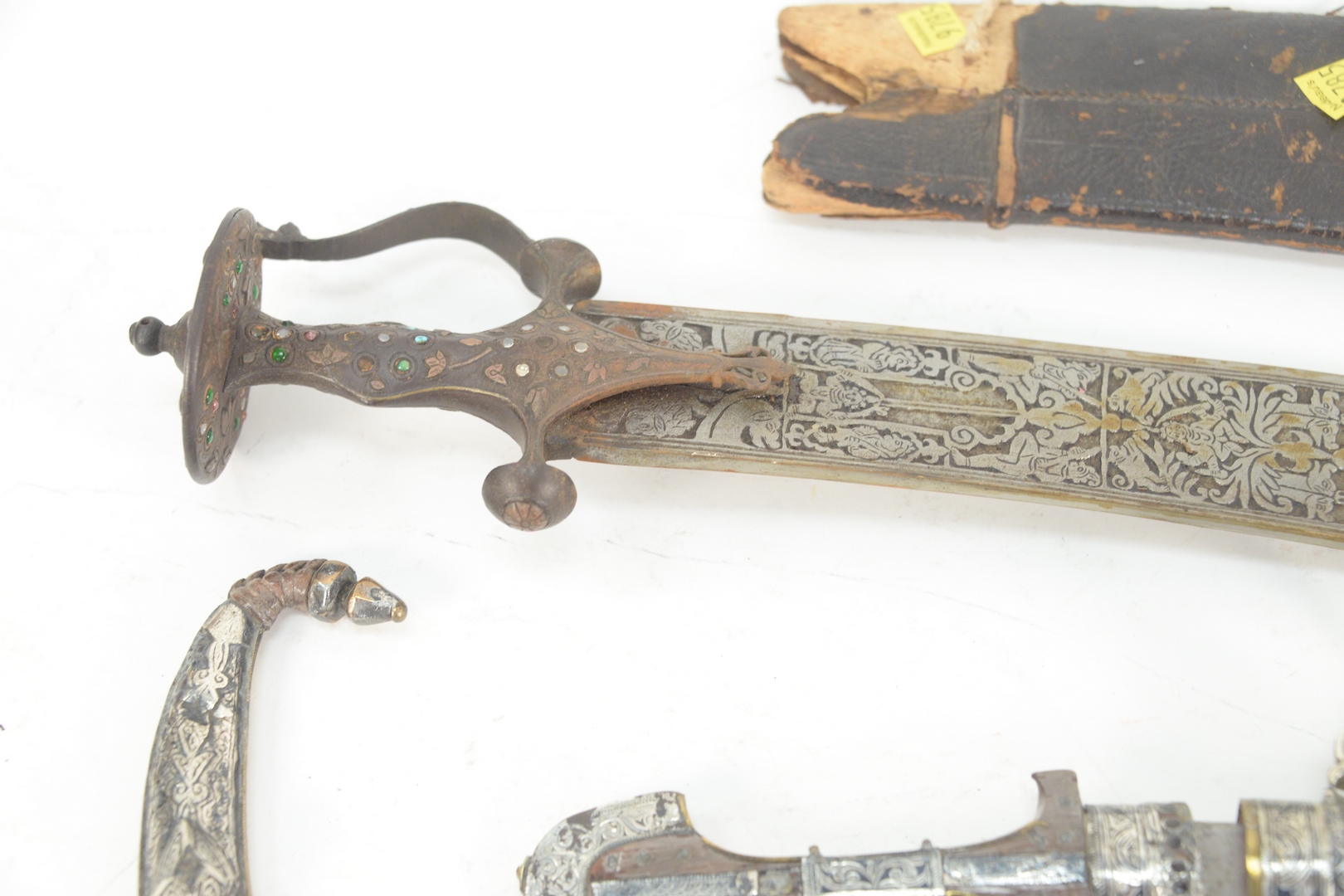 Group of Six Knives and Daggers to include two Middle Eastern daggers with silvered and brass sheath and handle, an Indian sword with jeweled handle and leather sheath, along with two small knives with leather sheaths, and a knife with curved blade, length 28 1/2 inches.