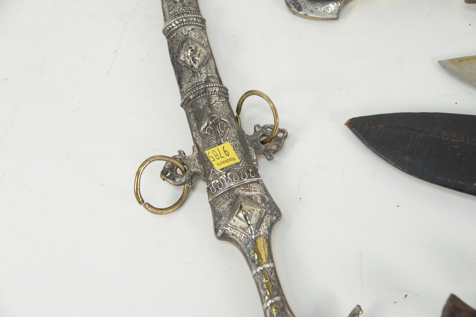 Lot 121: Group of Six Knives and Daggers to include two Middle Eastern daggers with silvered and brass sheath and handle, an Indian sword with jeweled handle and leather sheath, along with two small knives with leather sheaths, and a knife with curved blade,