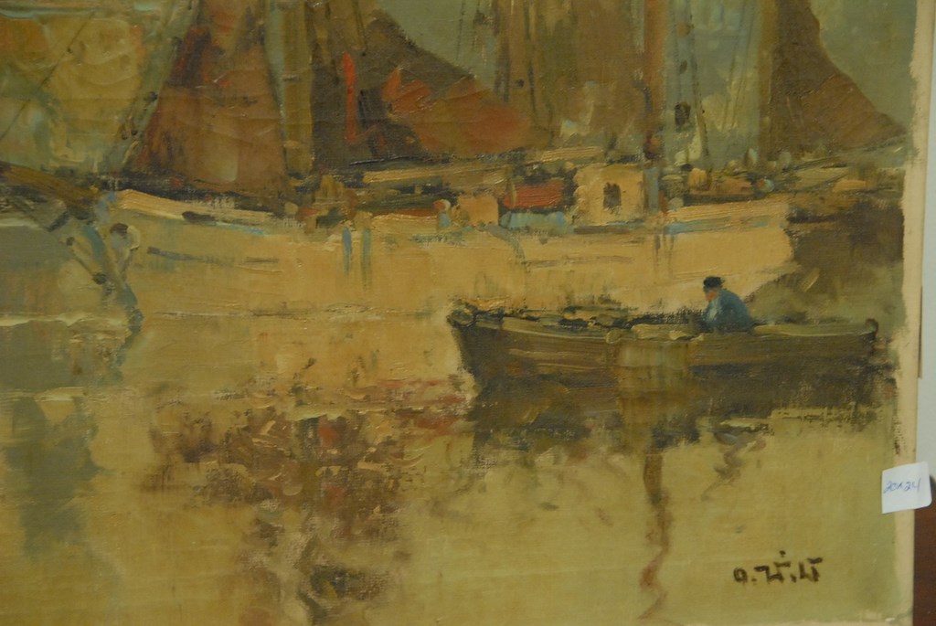 Lot 121: HARBOR SCENE boats with city in background oil on canvas signed lower right indistinctly mid 20th century 20 x 24