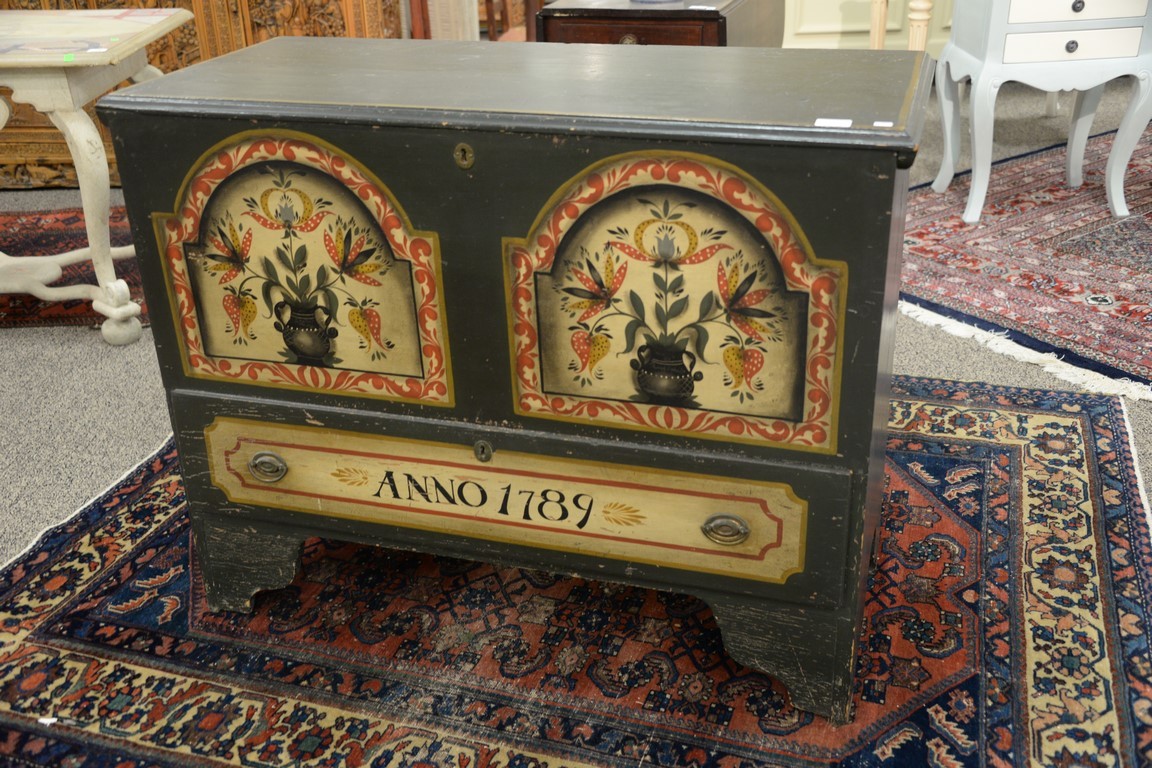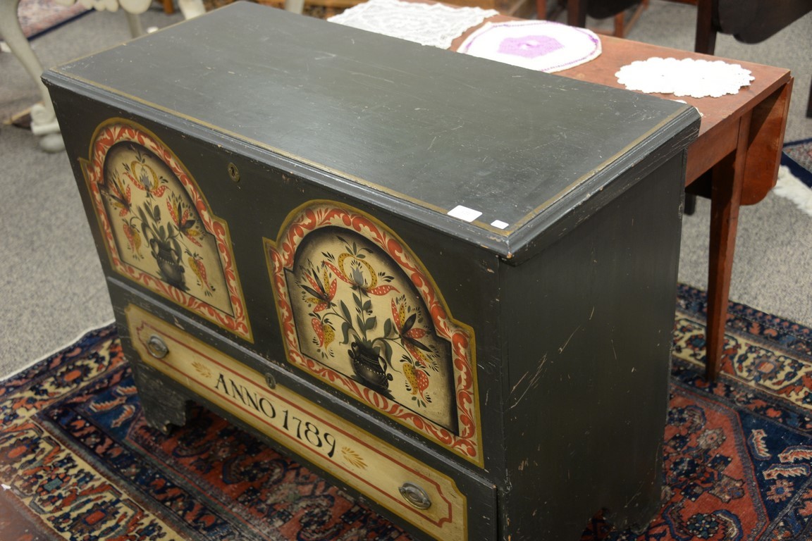 Lot 121: Lift top blanket chest with drawer on cut out bracket base, late 18th to early 19th century repainted. ht. 33in., wd. 42in., dp. 1…