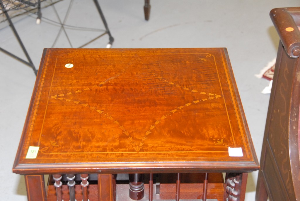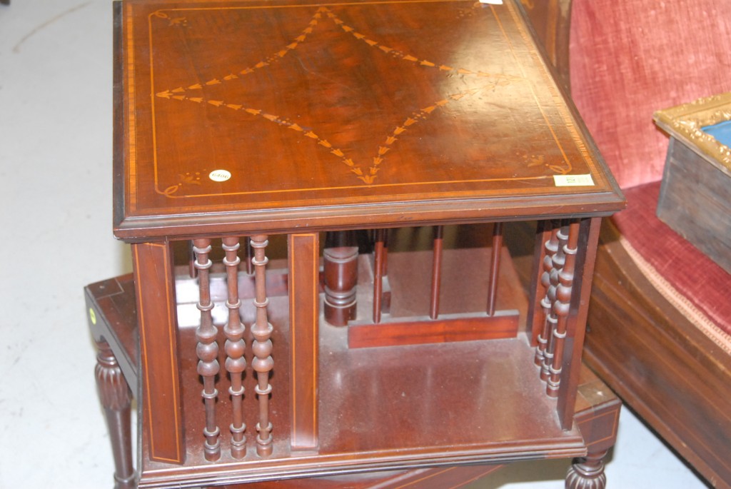 Lot 121: Mahogany Victorian revolving bookcase with bell flower inlay on turned legs, ht. 29in. top: 18 x 18.