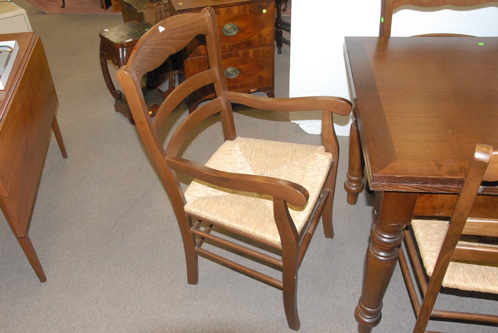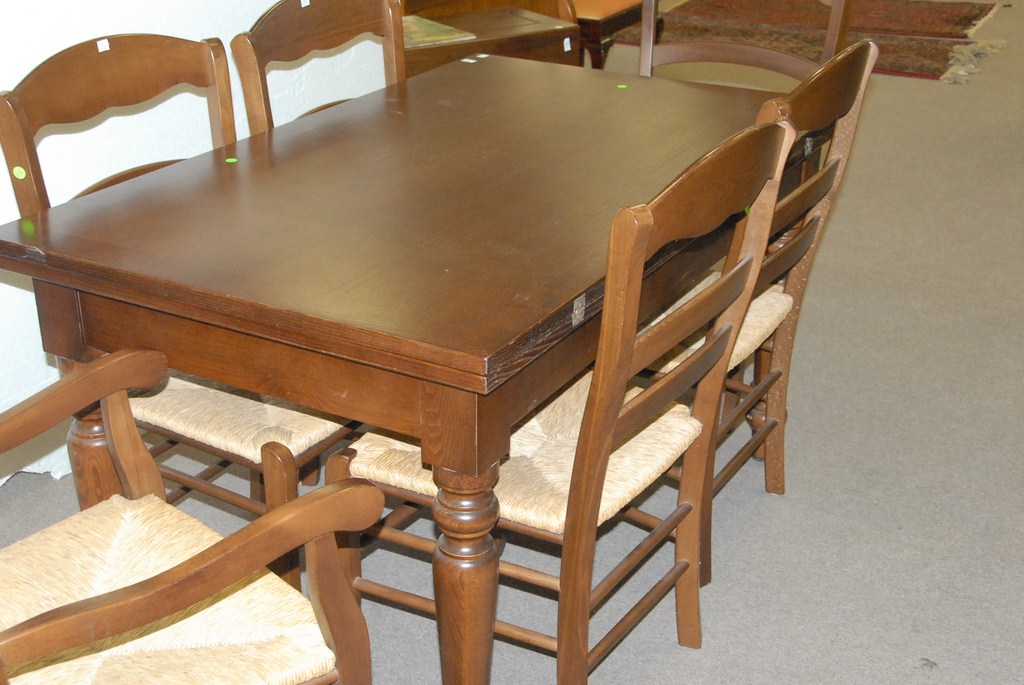 Seven piece dining set six rush seat chairs and extendable table with flip top with drawer, 34 x 56 1/2 opens to 68 x 56 1/2.