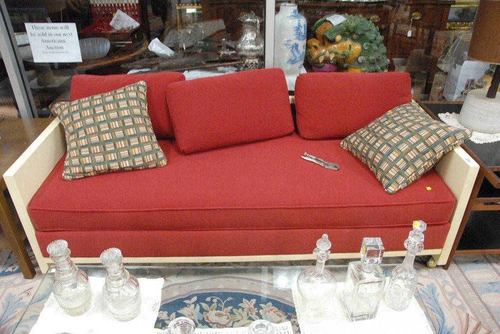 Sofa / trundle bed with custom upholstery, lg. 78in. Provenance: property from a home in Rockville Center, New York which was decorated by Iris Apfel.