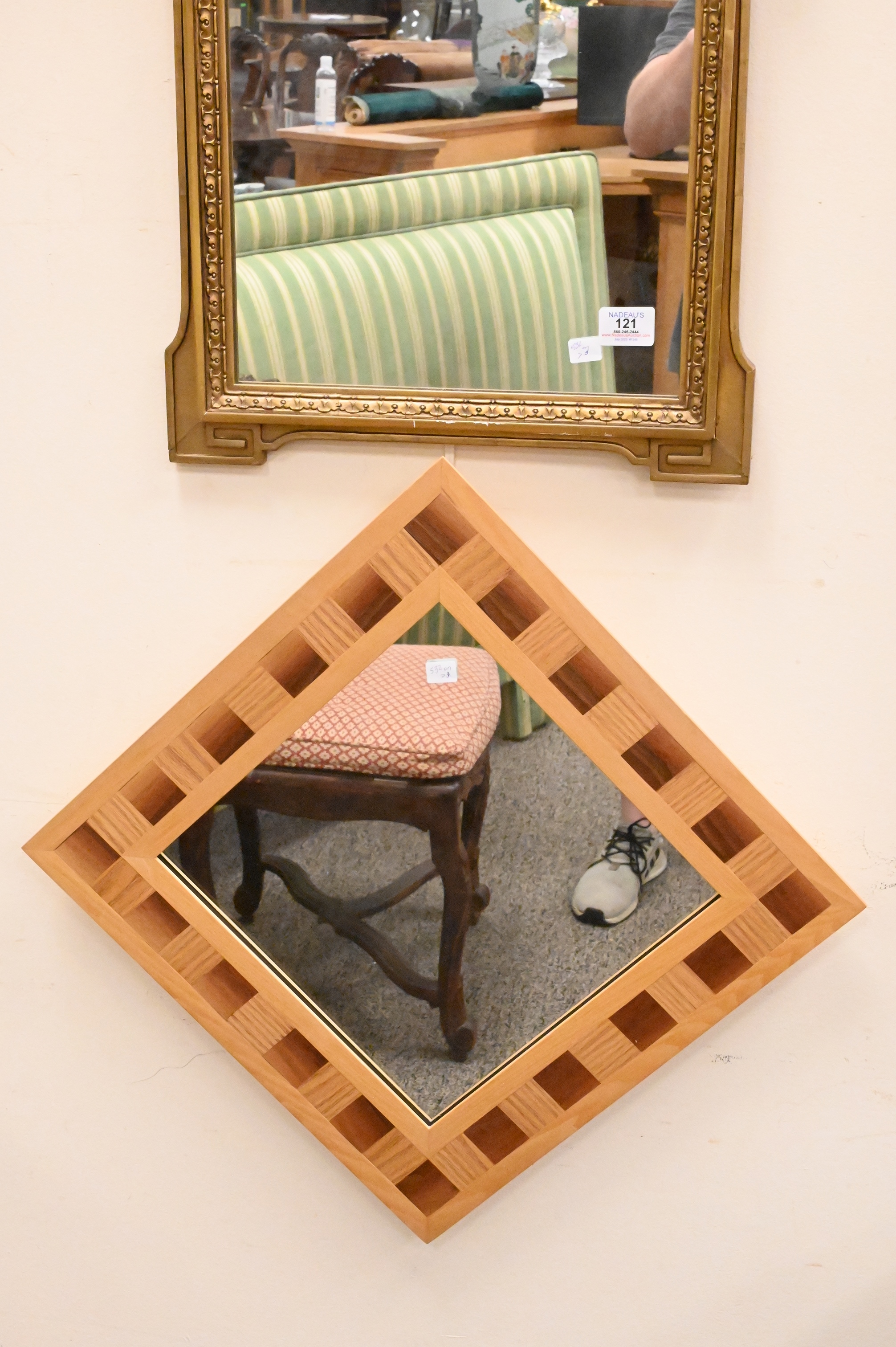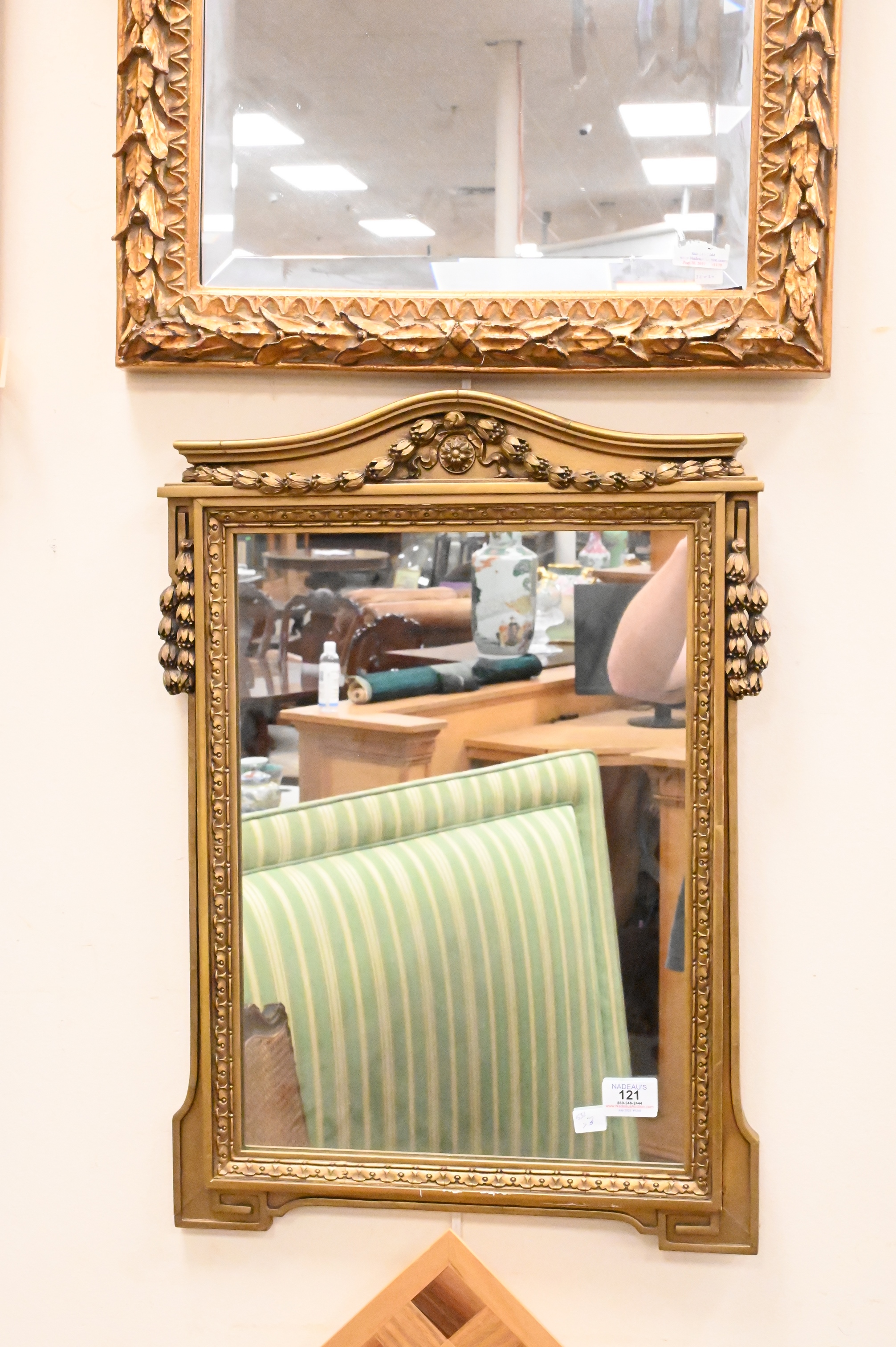 Three Mirrors, to include one heavily carved having beveled glass, one inlaid mirror along with a mirror having a carved frame, largest 33″ x 20″