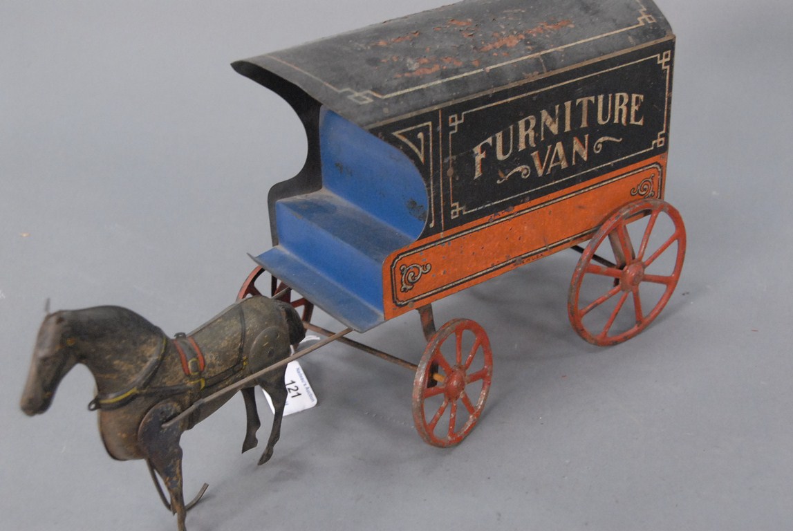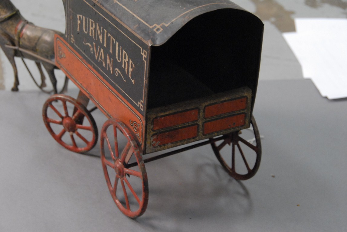 Lot 121: Tin Furniture Van horse drawn covered wagon with original paint, stenciling, and writing. ht. 9in. lg. 17in.