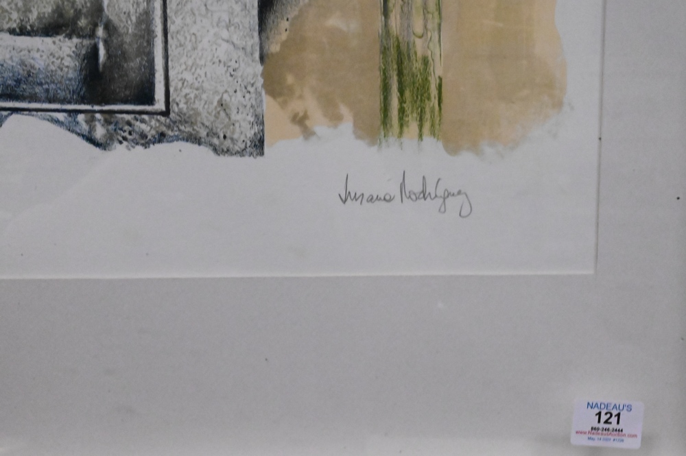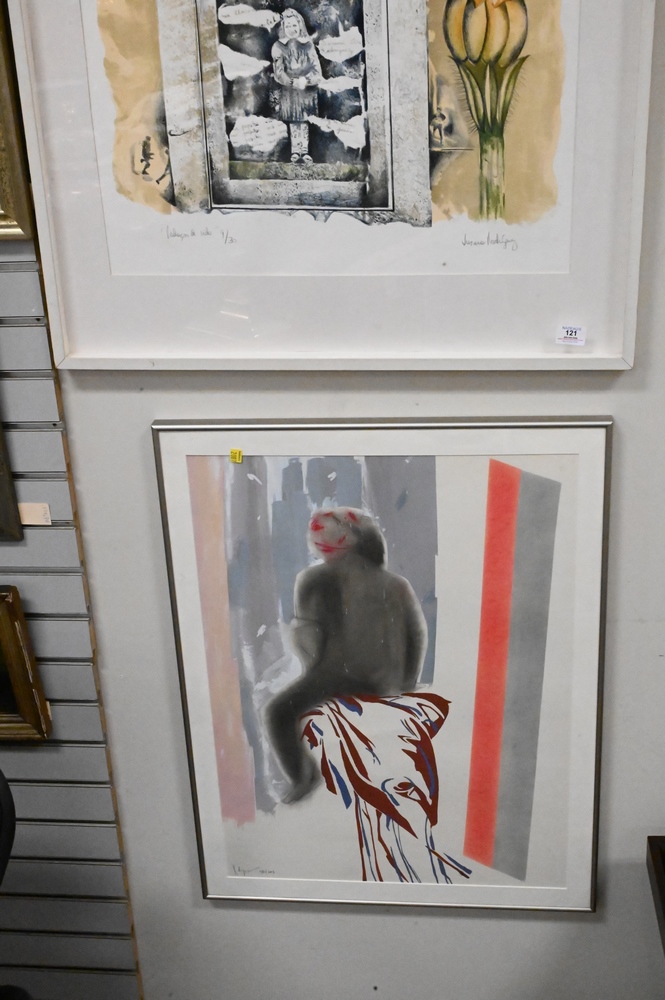 Lot 121: Two Framed Pieces, to include Rodrigues colored lithograph, pencil signed and editioned Pedregon de Vida 9/30, 23 3/4″ x 32″; along with mixed media abstraction with figure, signed illegibly lower left, 21″ x 29″.