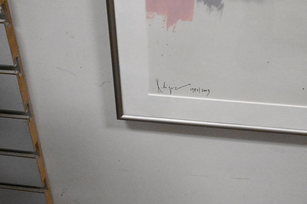 Two Framed Pieces, to include Rodrigues colored lithograph, pencil signed and editioned Pedregon de Vida 9/30, 23 3/4″ x 32″; along with mixed media abstraction with figure, signed illegibly lower left, 21″ x 29″.