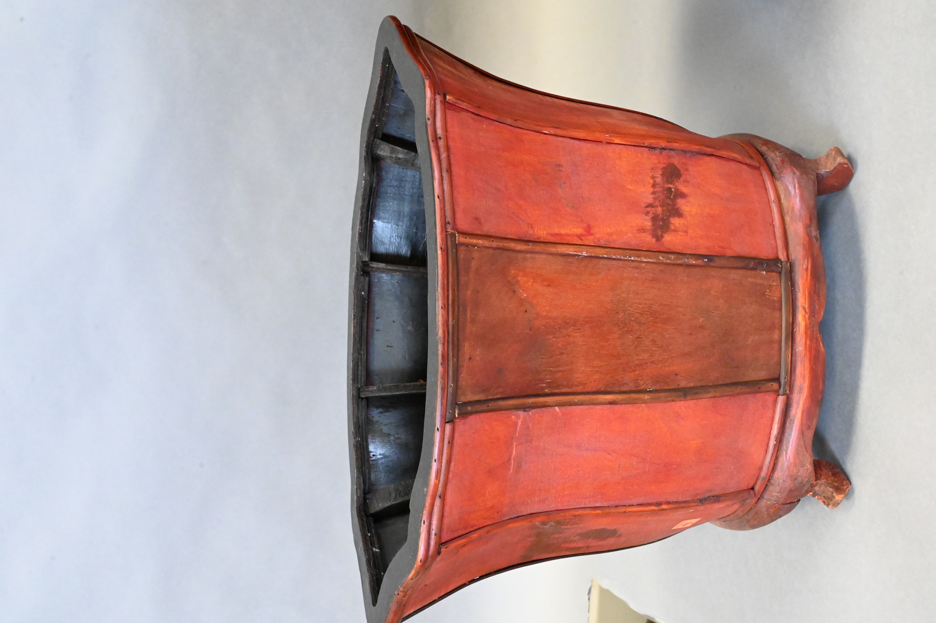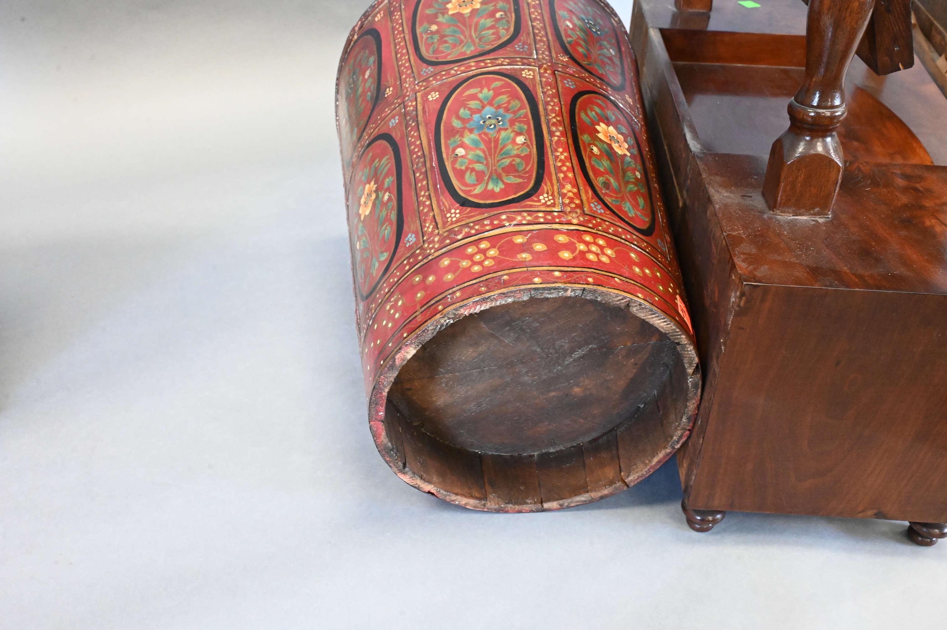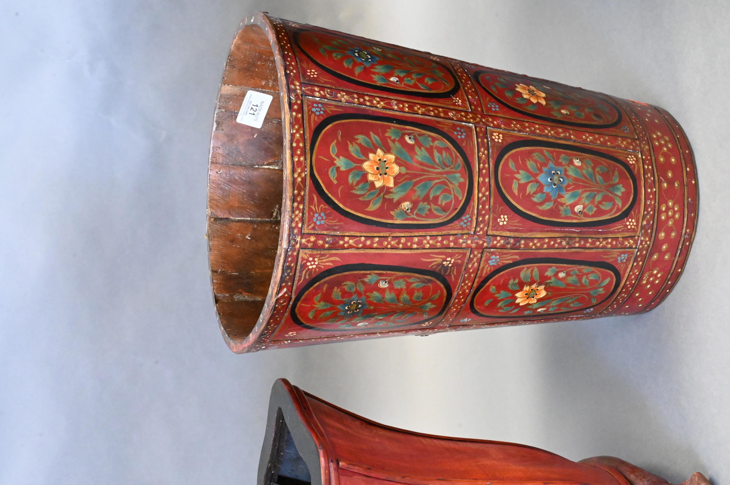 red painted tapering waste bin, height 14 inches, along with Indian polychrome stick stand bin with flower motif, height 15 1/2 inches