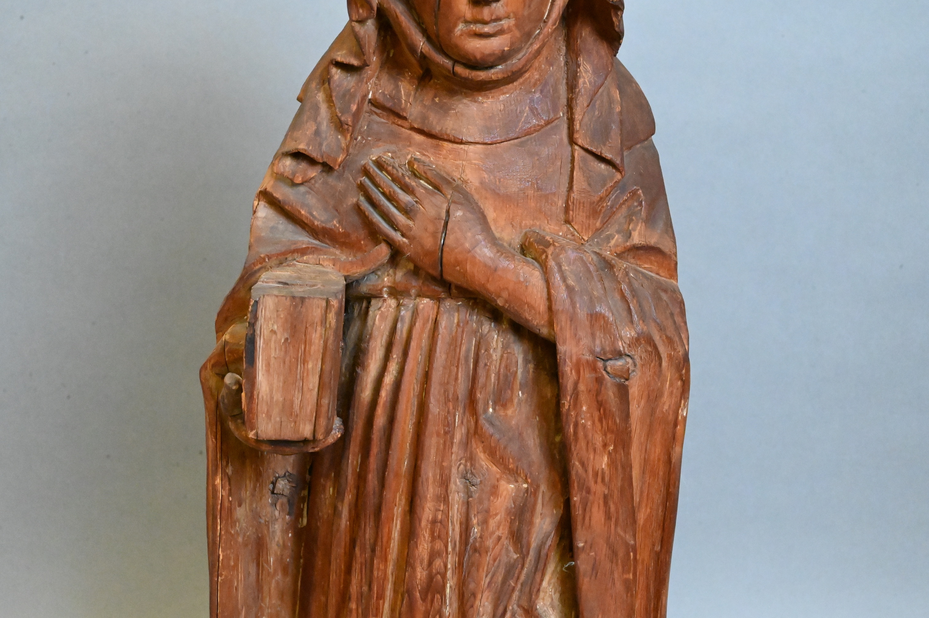 A carved pine wood figure of a veiled female saint, standing with one hand raised to her chest and the other holding a book. The figure displays characteristic late-Gothic Tyroeon or Alpine features, including the elongated proportions, deeply folded drapery, and serene, introspective expression. Evidence of period tooling and original surface texture remains.