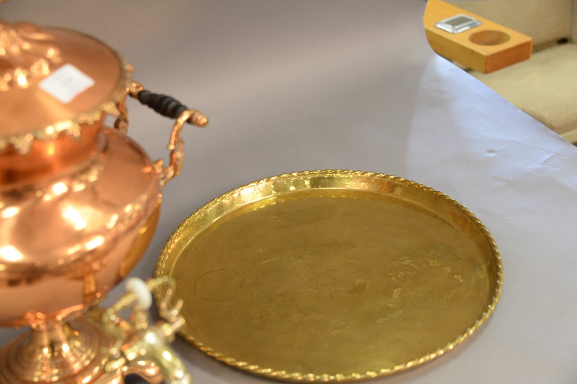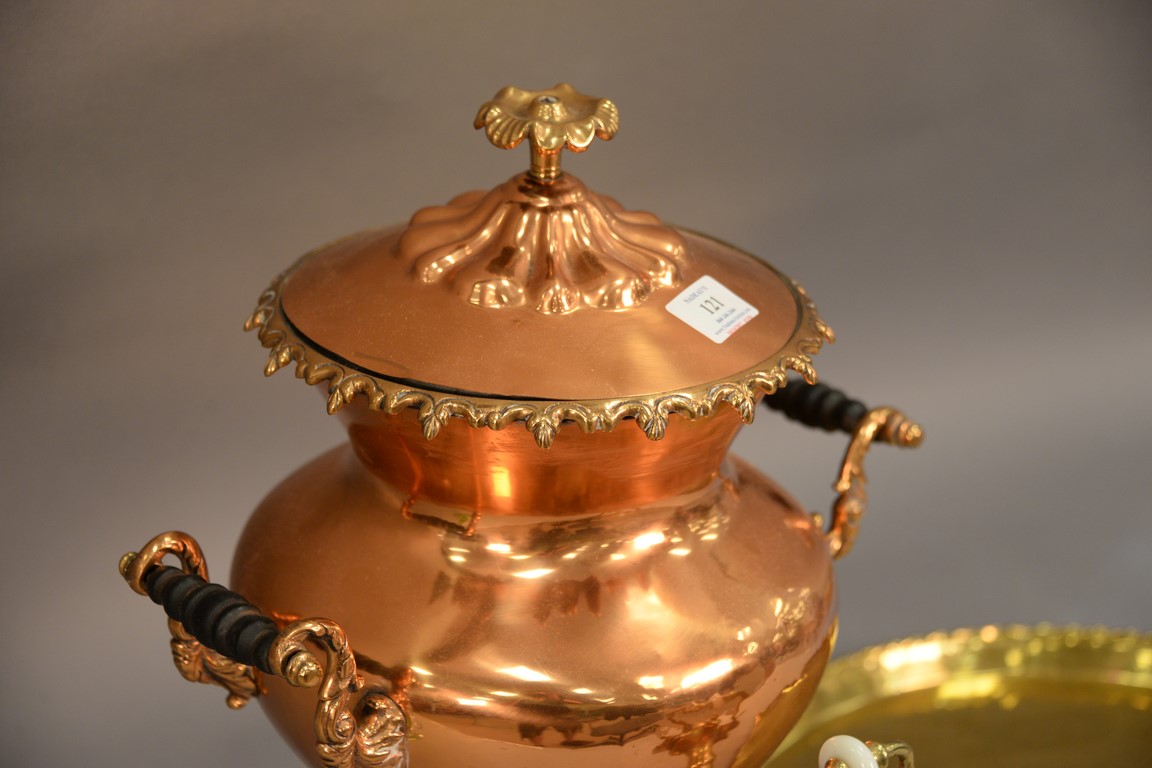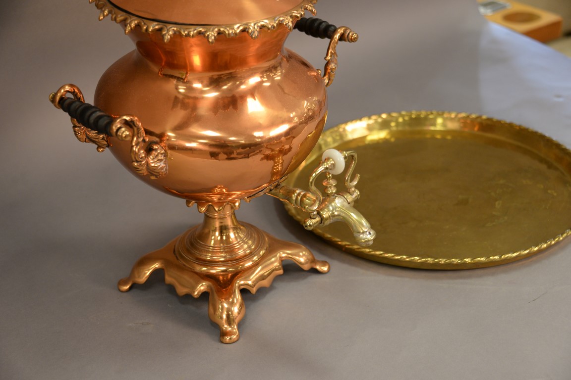 Victorian copper and brass tea urn, copper body with brass spigot on round brass tray. ht. 17in.