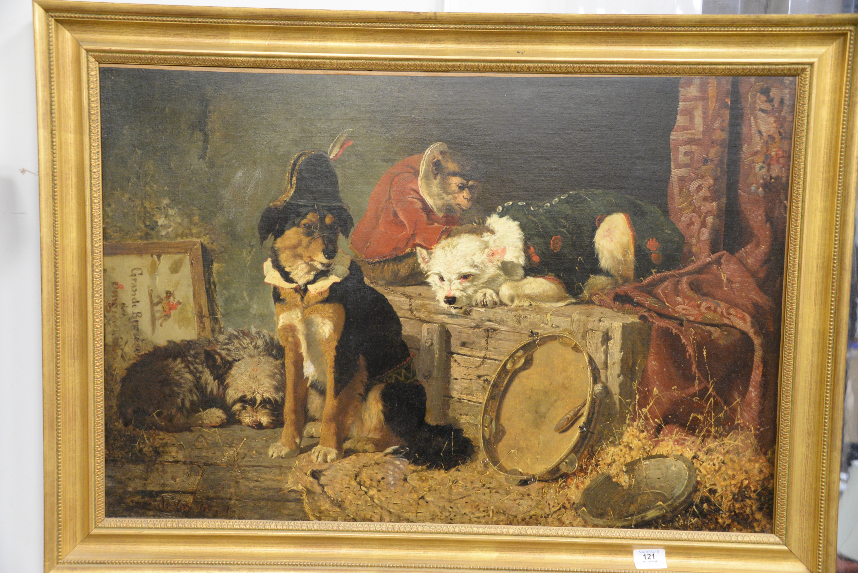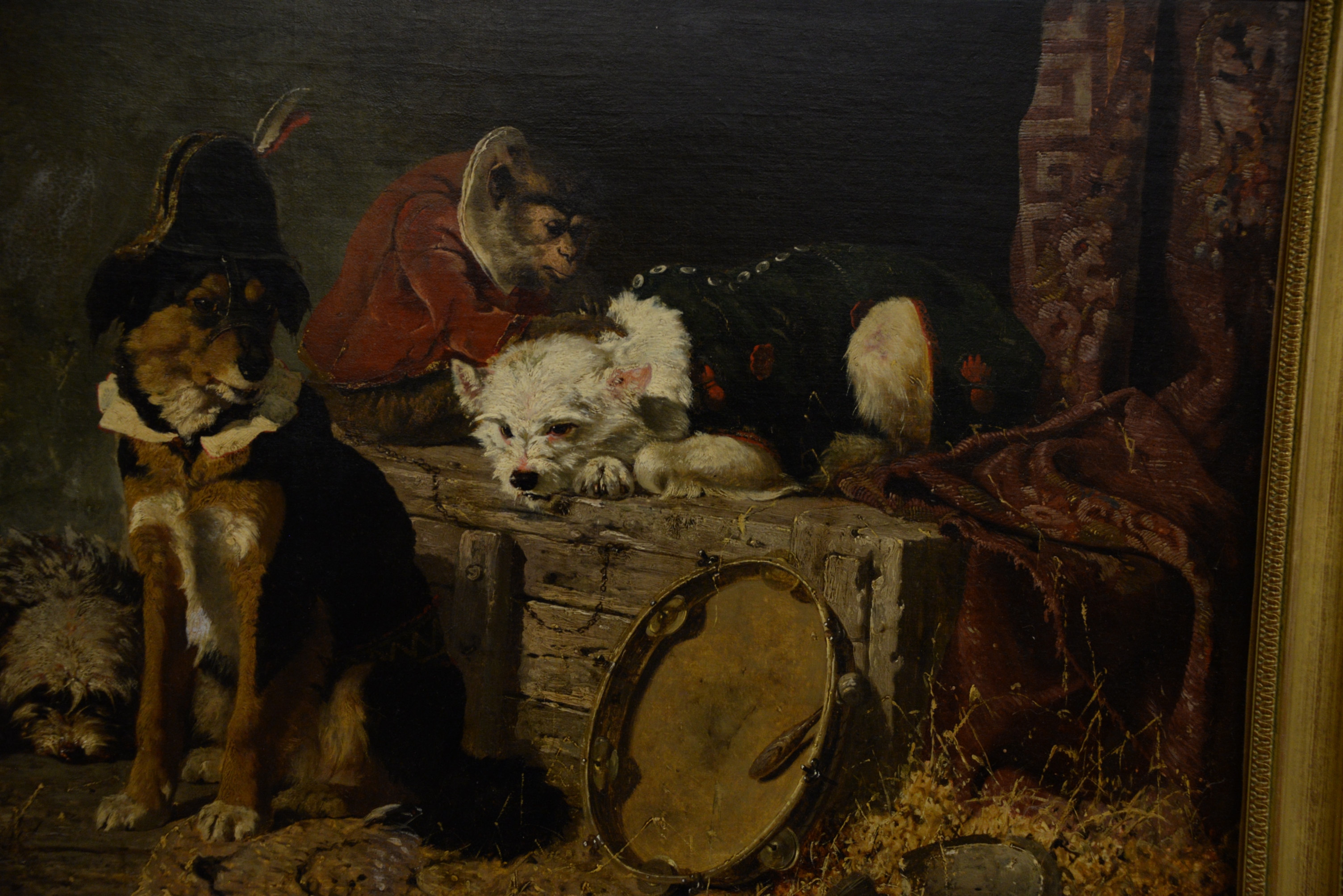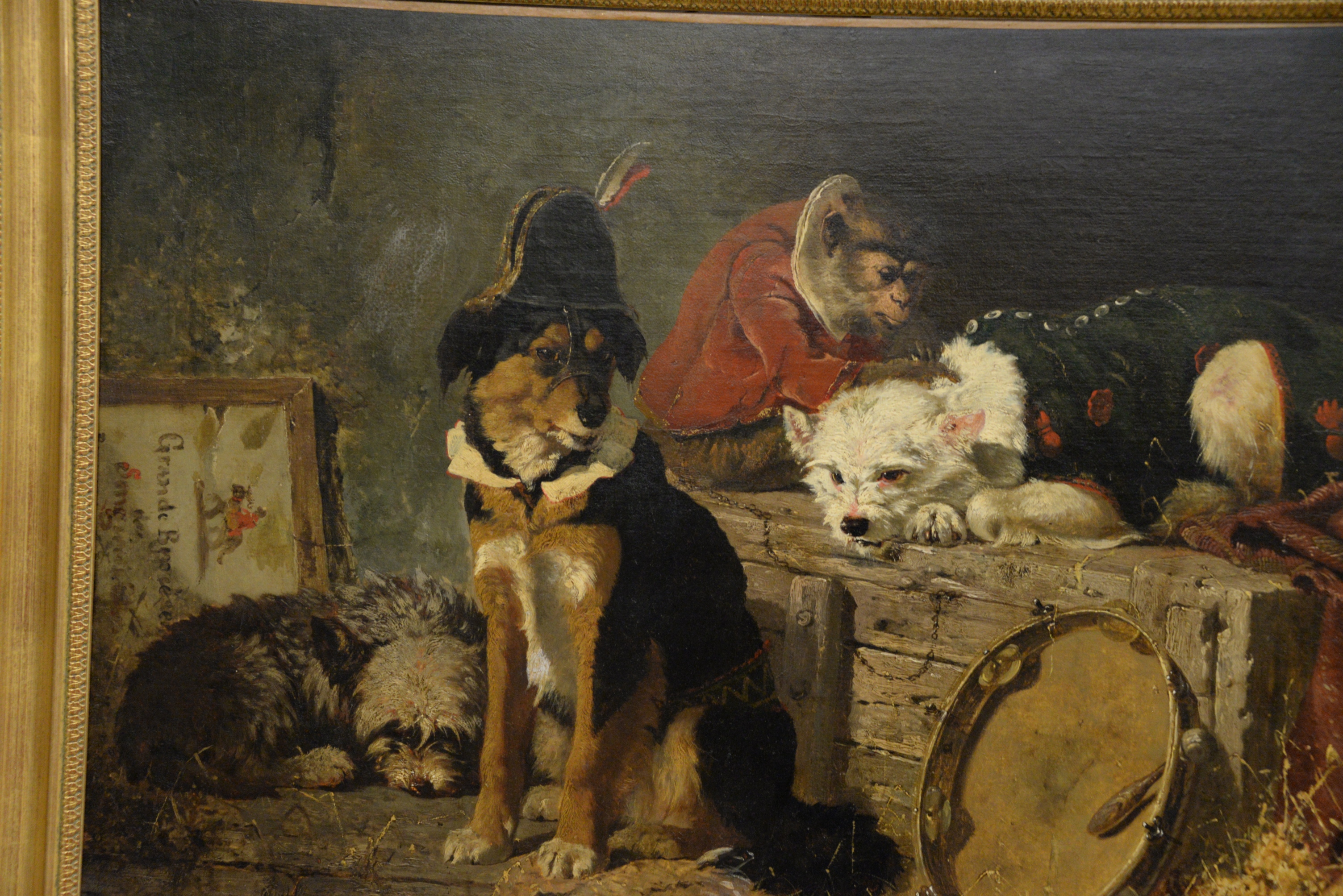 Vincent De Vos (1829 – 1875) “Dogs and Monkey in Costumes” featuring three dogs and a monkey in costume dresses oil on canvas signed “De Ves 62″ lower left 22″ x 32 1/2”.