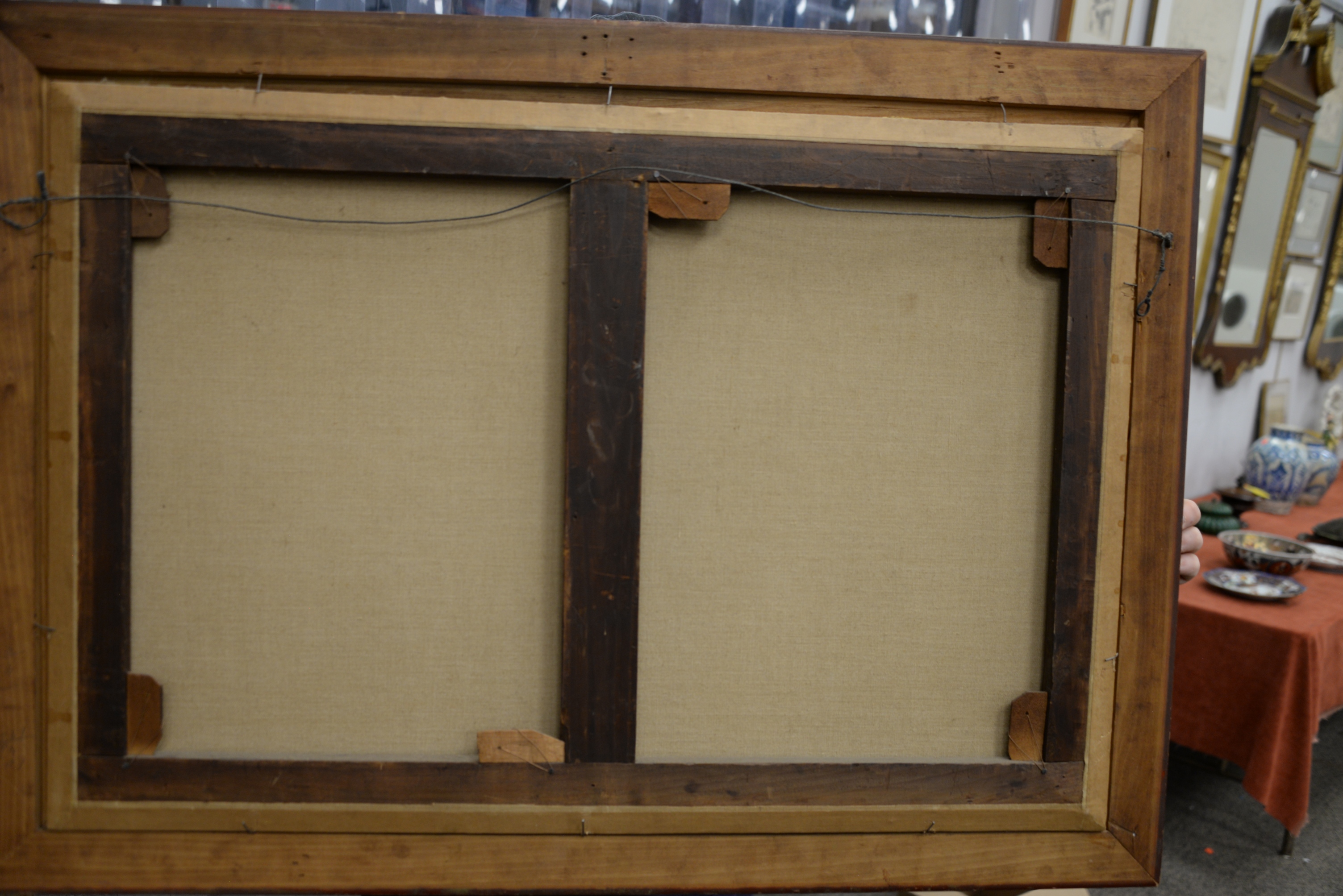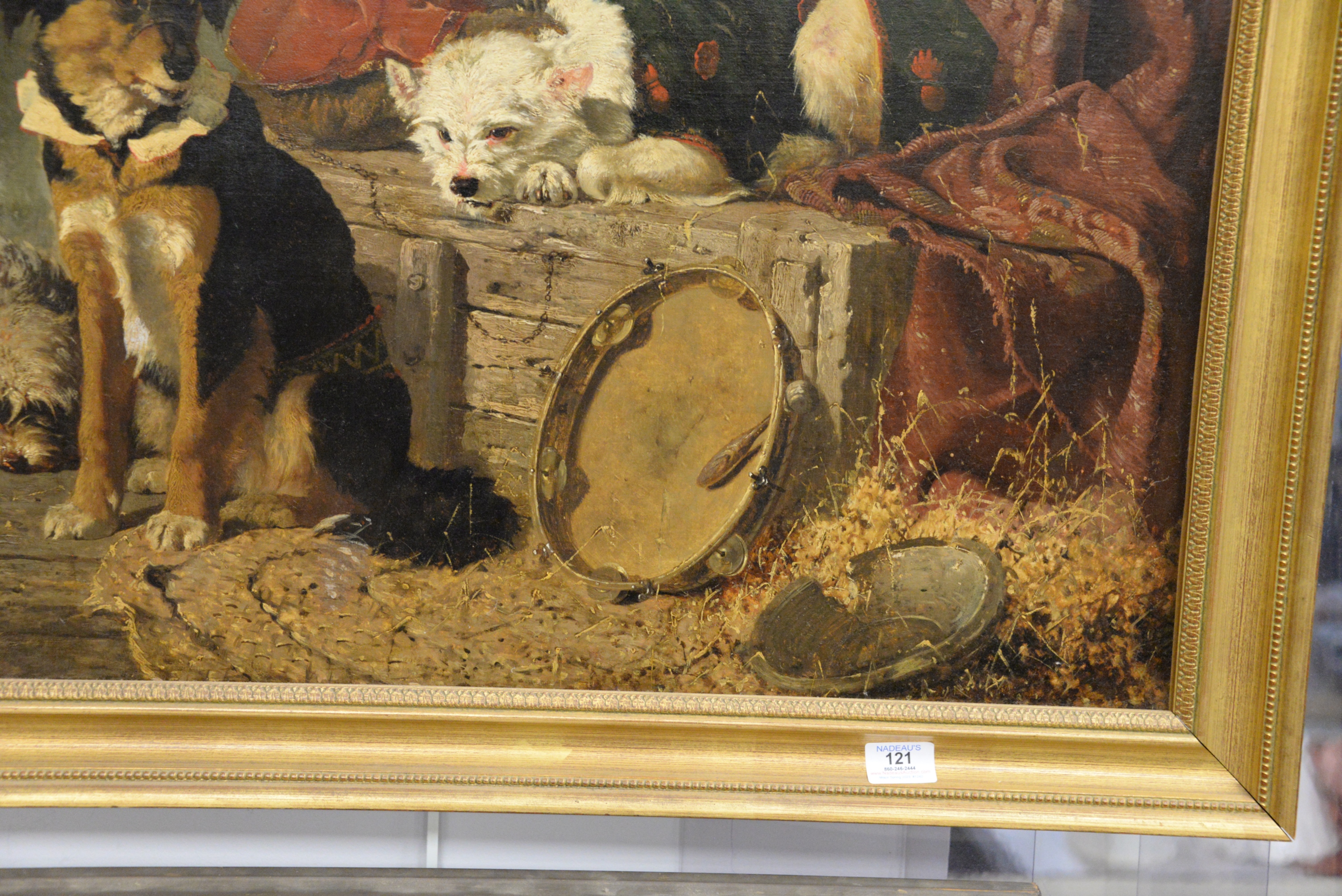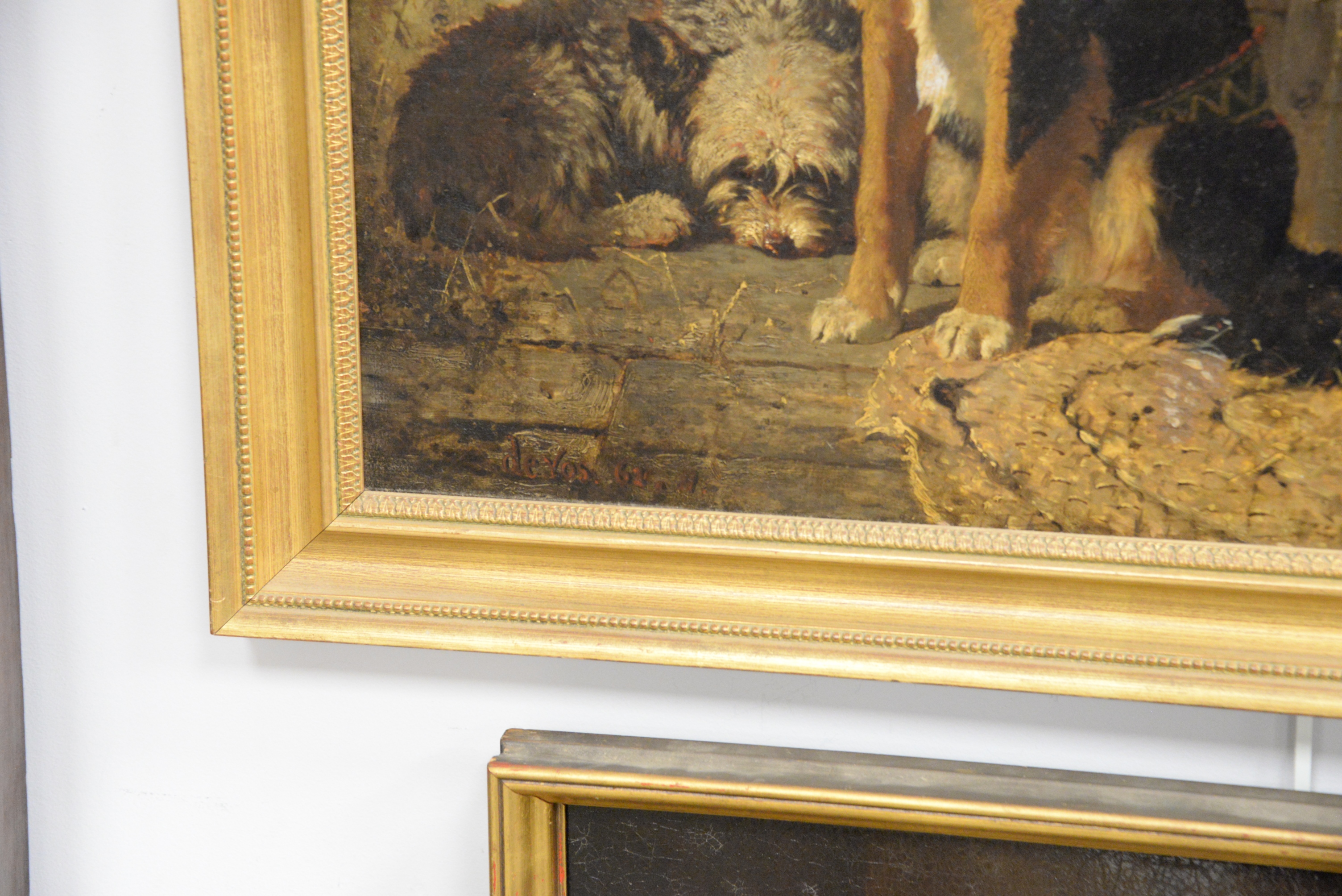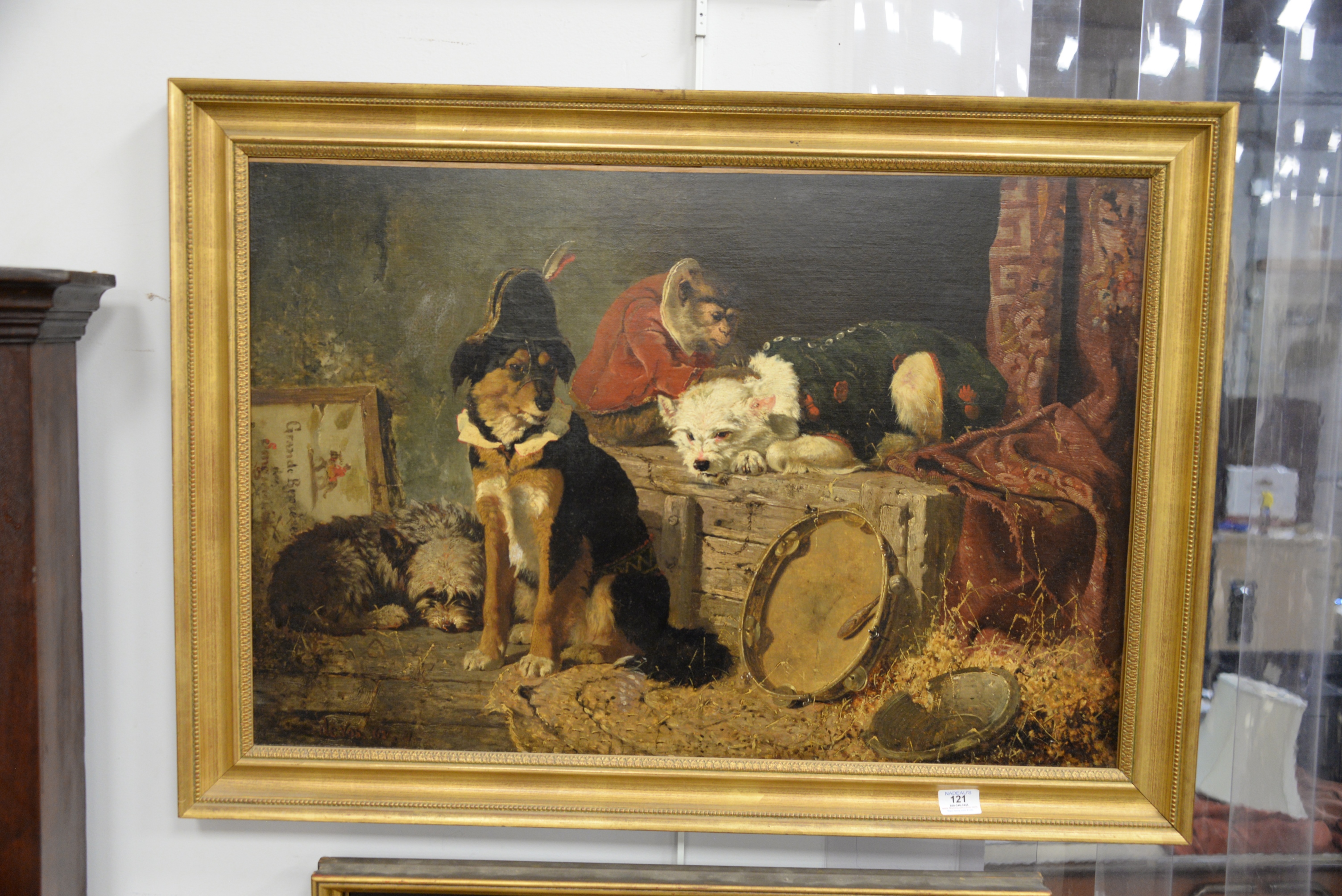 Vincent De Vos (1829 – 1875) “Dogs and Monkey in Costumes” featuring three dogs and a monkey in costume dresses oil on canvas signed “De Ves 62″ lower left 22″ x 32 1/2”.