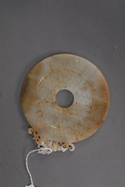 White jade carved dragon disc with a reticulated carved dragon figure on one side, as is