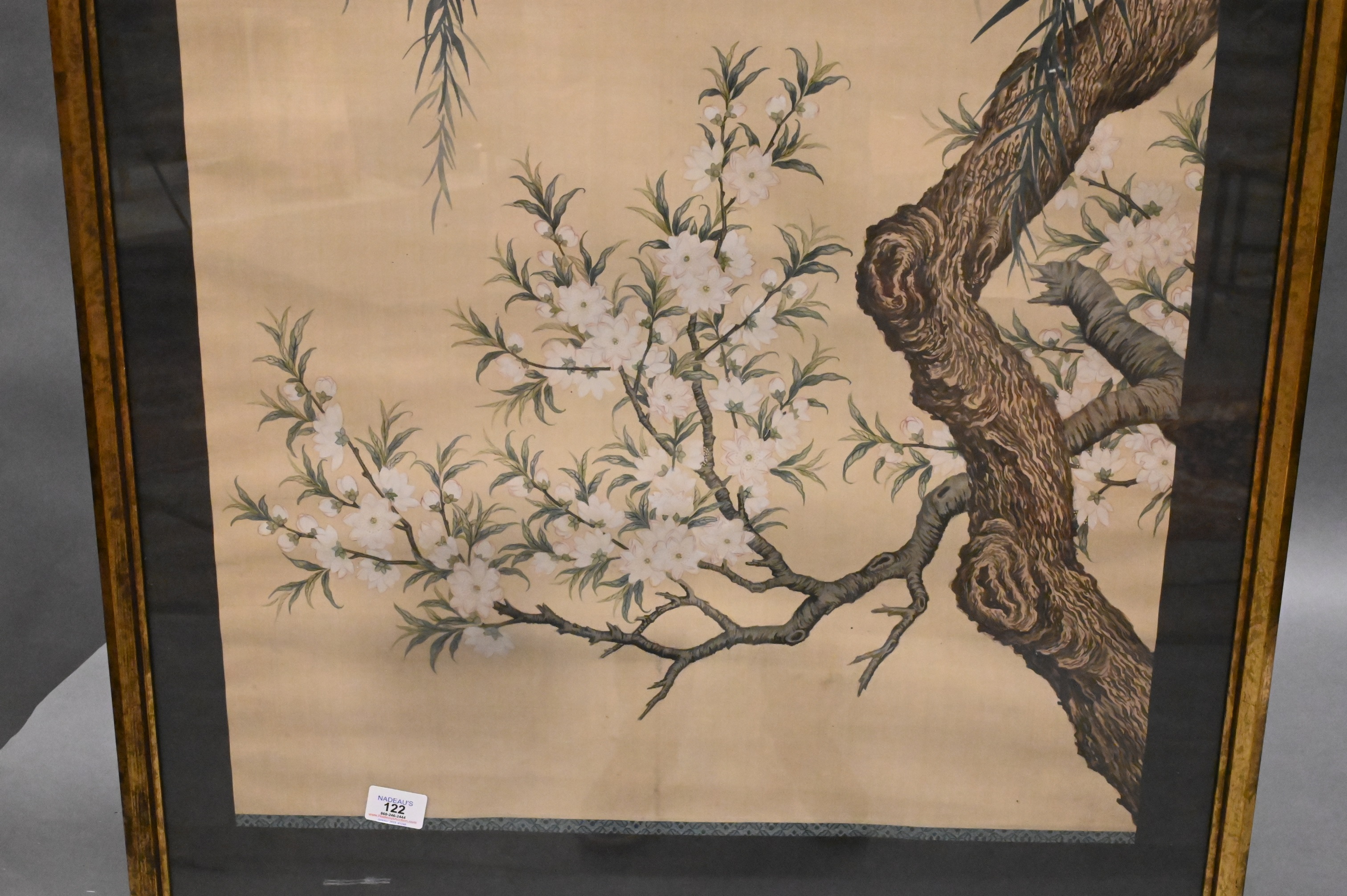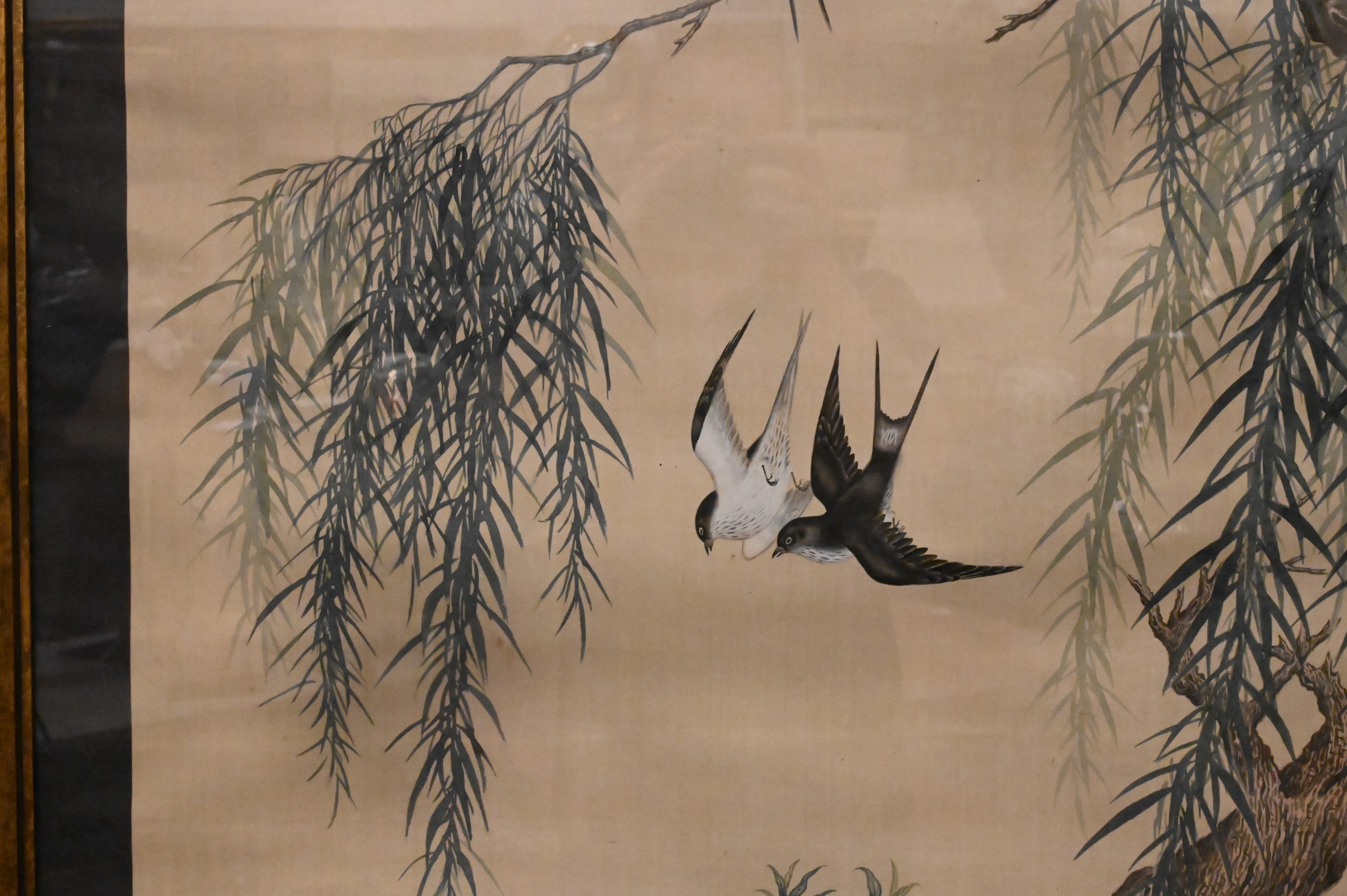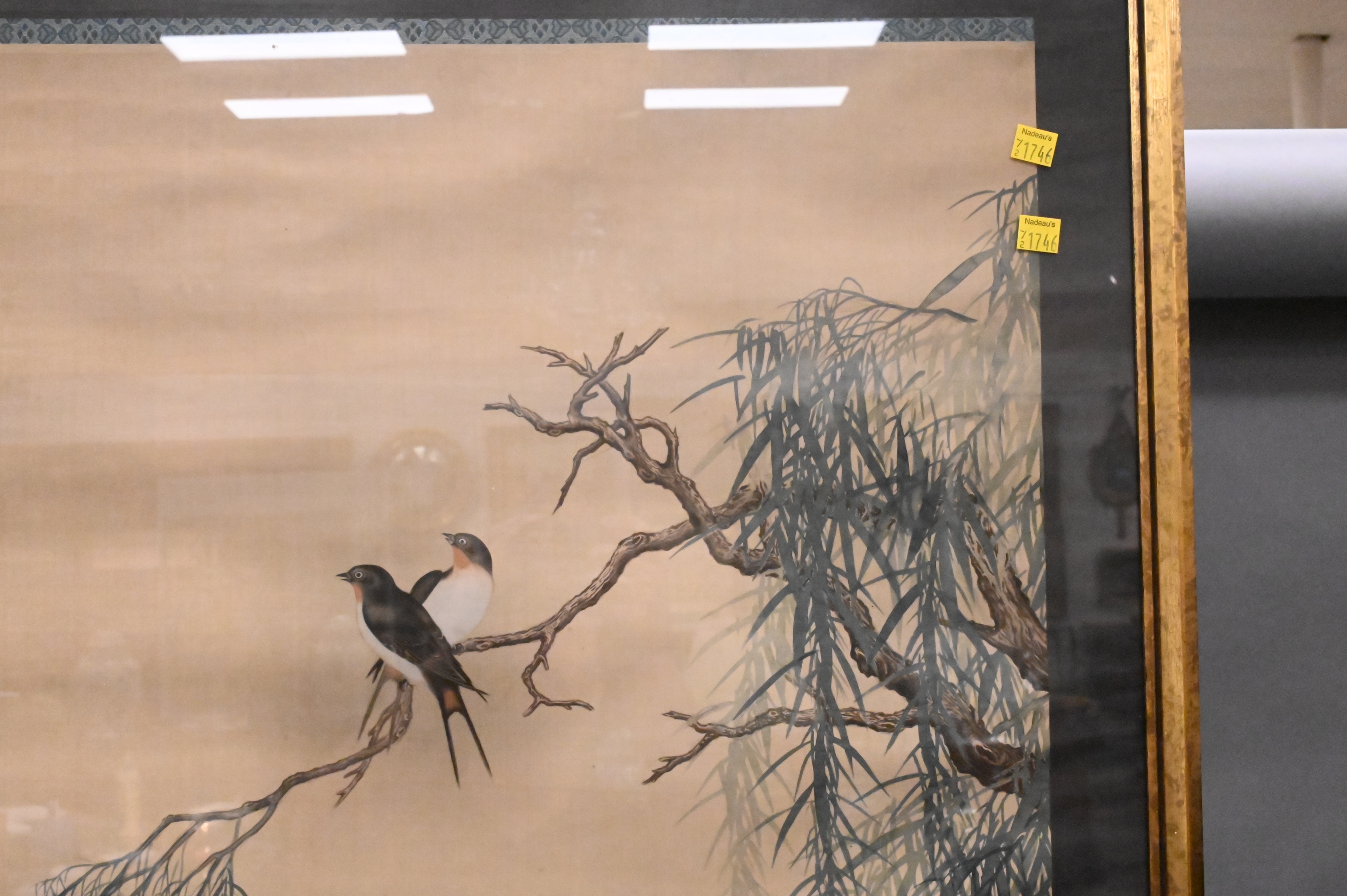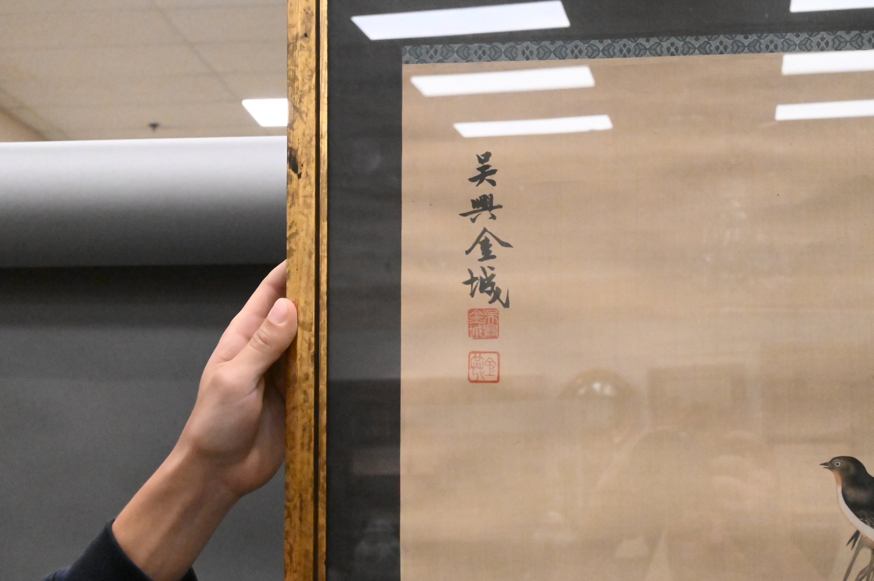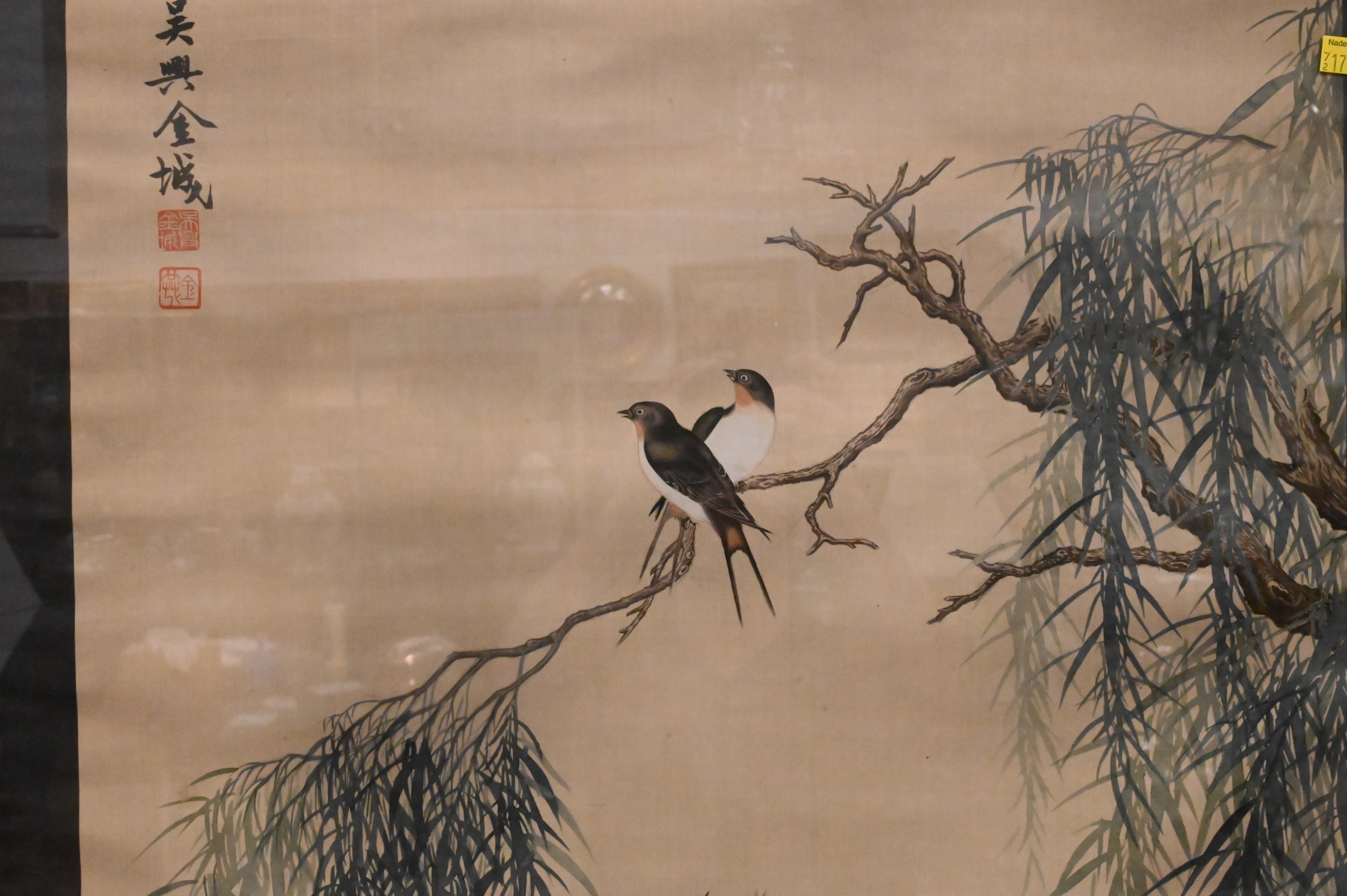 Having scrolling flowers and birds, with Chinese characters and red seals top left