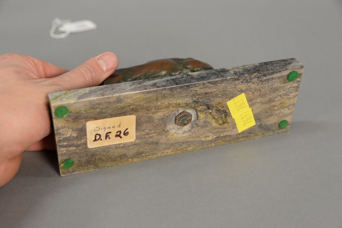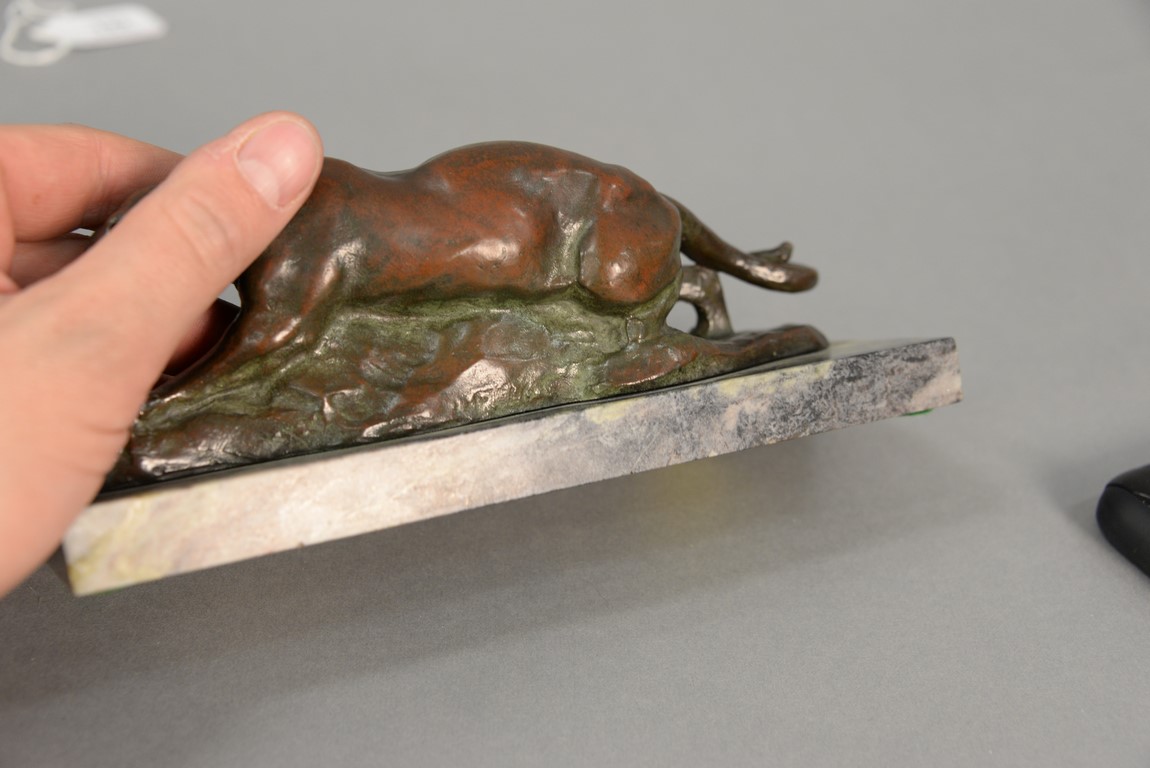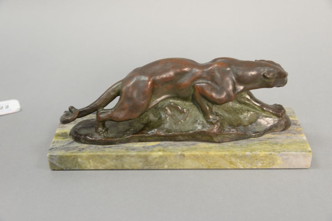 Crouching panther bronze on marble base, signed indistinctly. ht. 2 1/2 in. lg. 7 1/2 in.