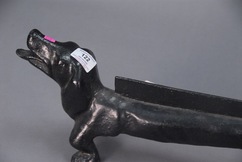 Dachshund dog boot scraper, cast iron with exaggerated body, lg. 22in.