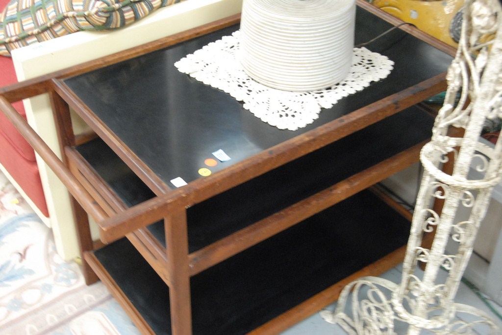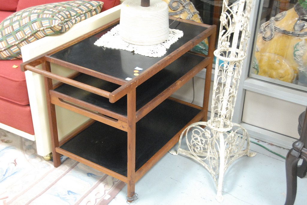 Danish modern tea cart with black formica shelves.
