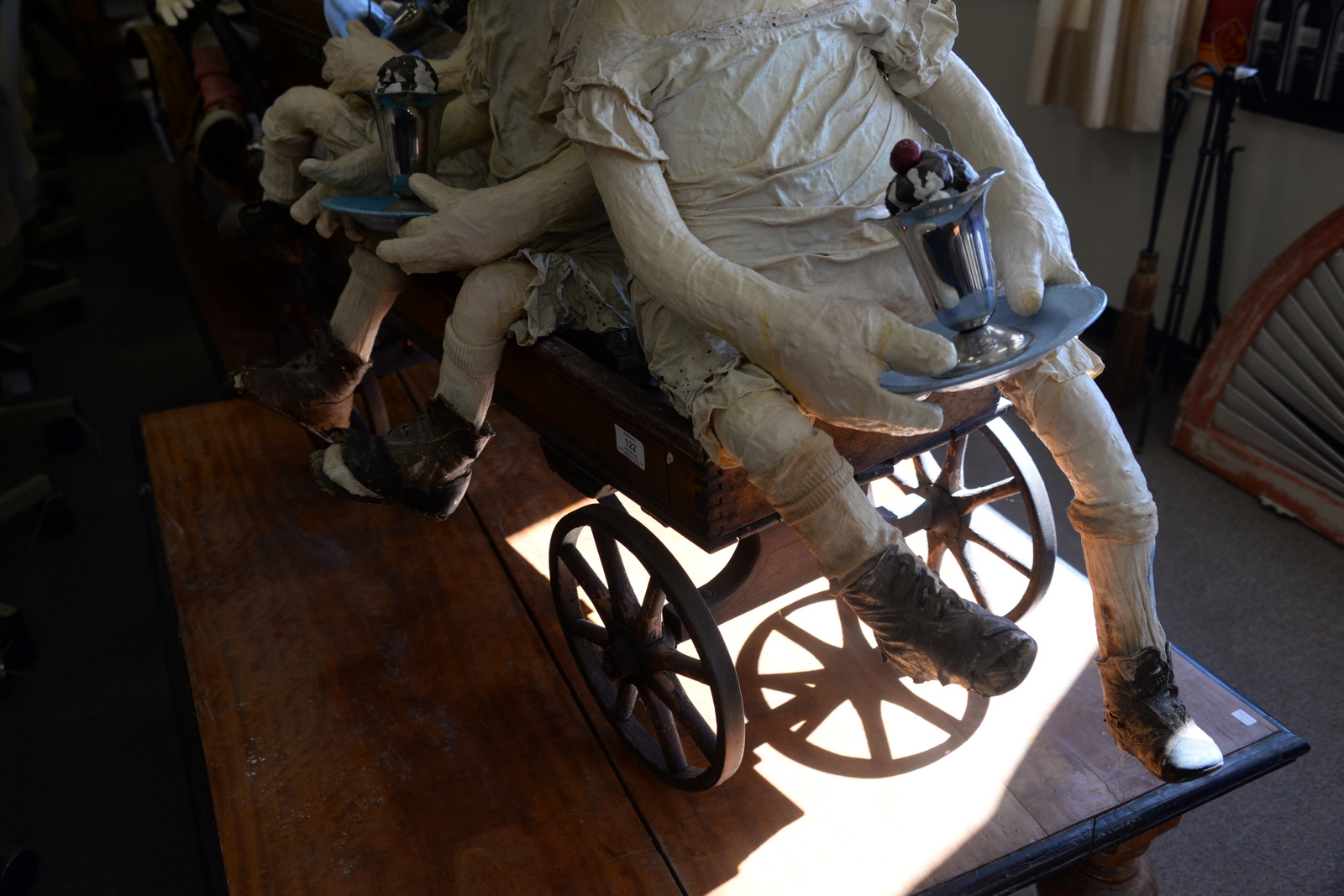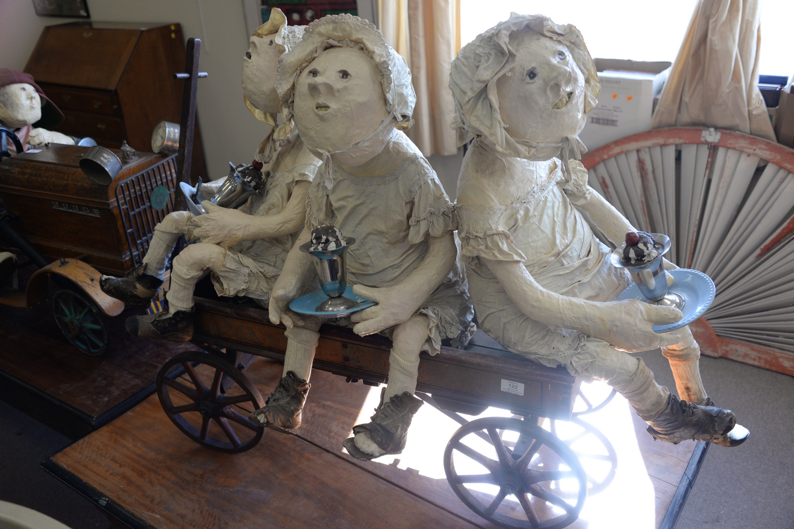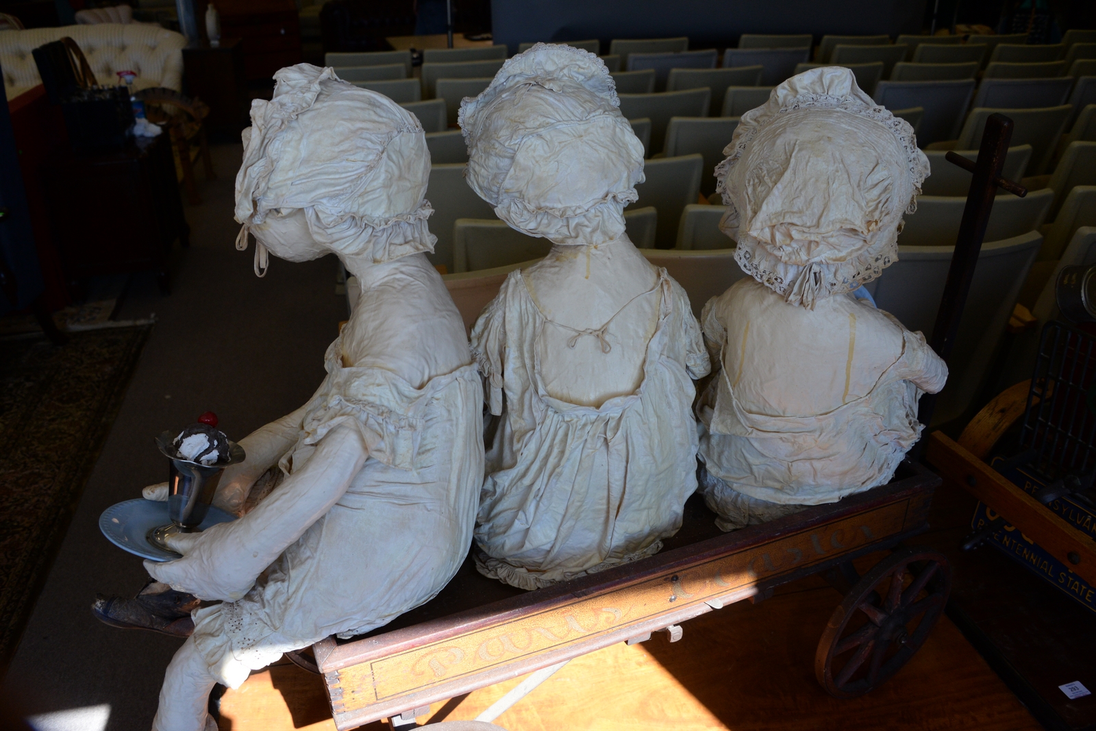 Early wooden wagon with three children. ht. 35in., lg. 48in.