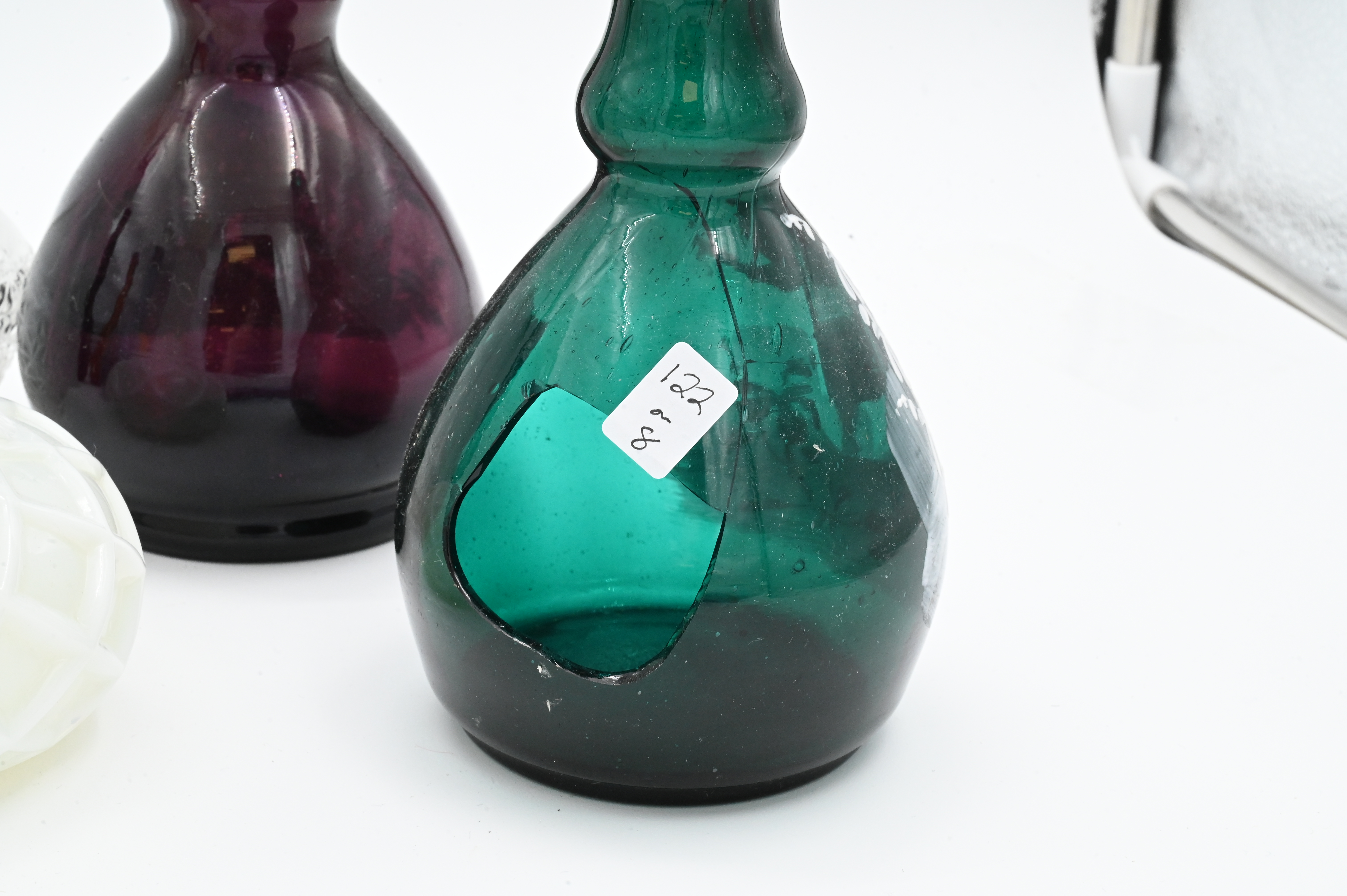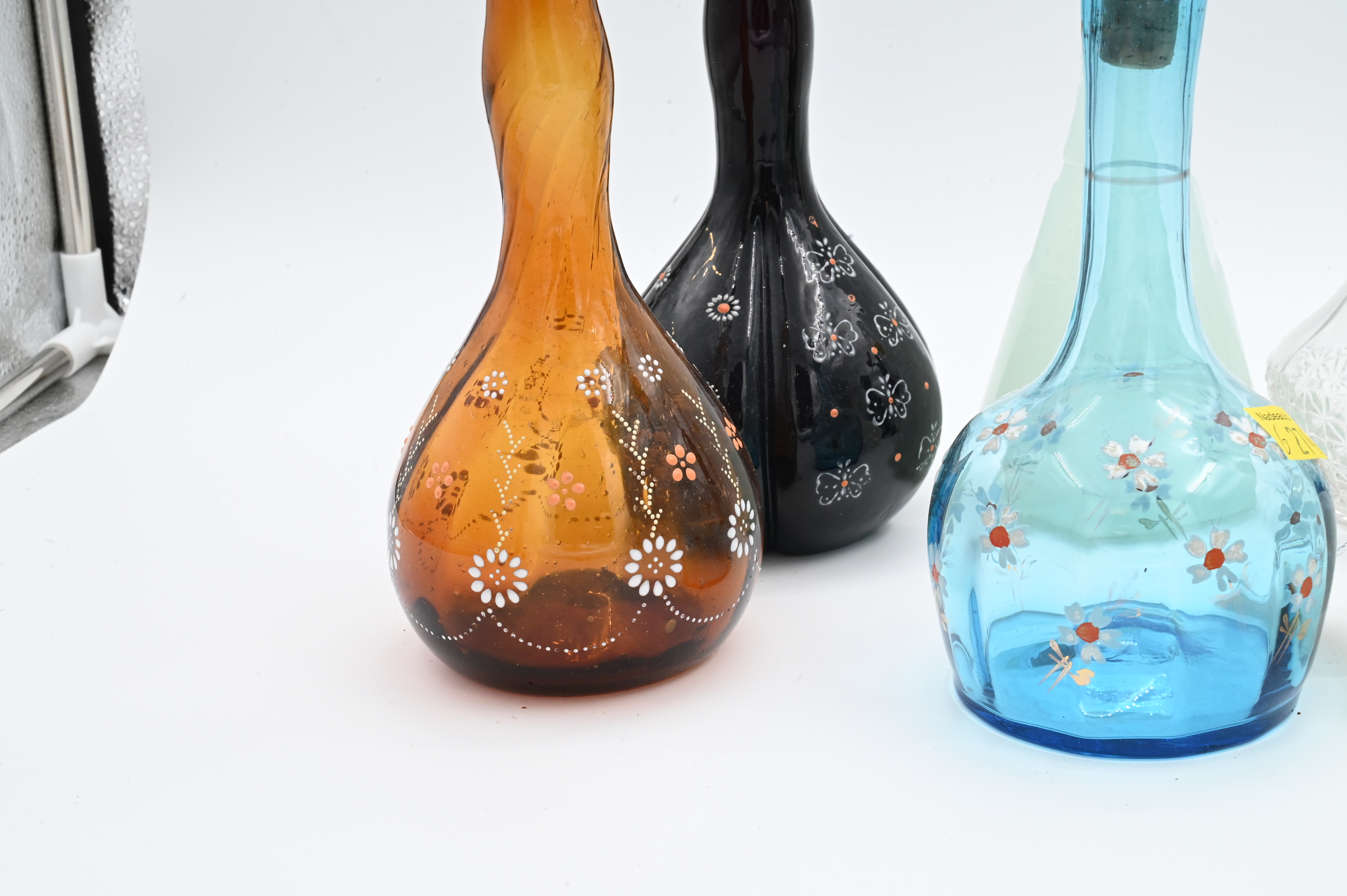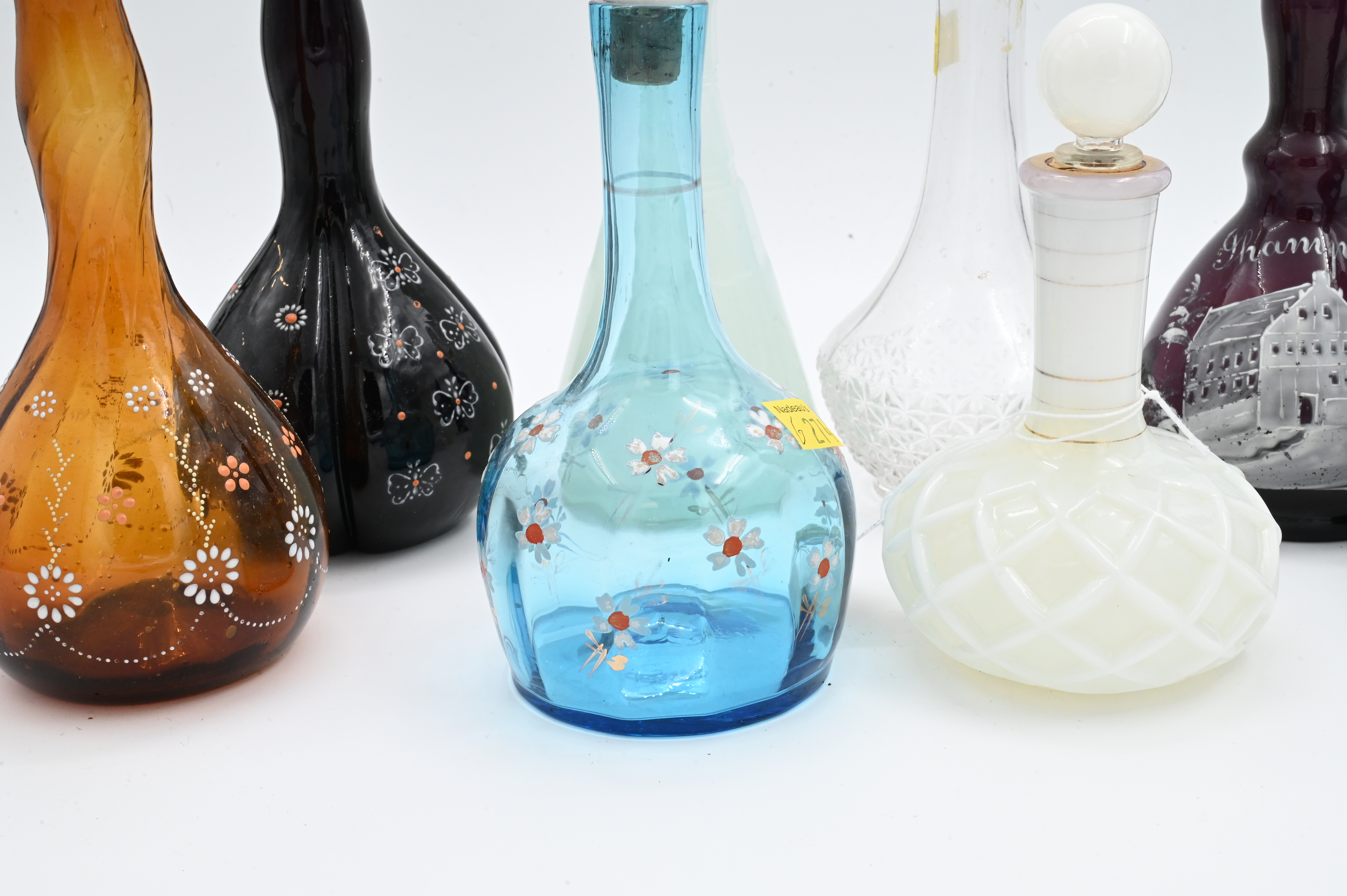to include three flower motif bottles, one clear cut glass, two Mary Gregory bottles (one damaged), one milk glass, one lattice bottle