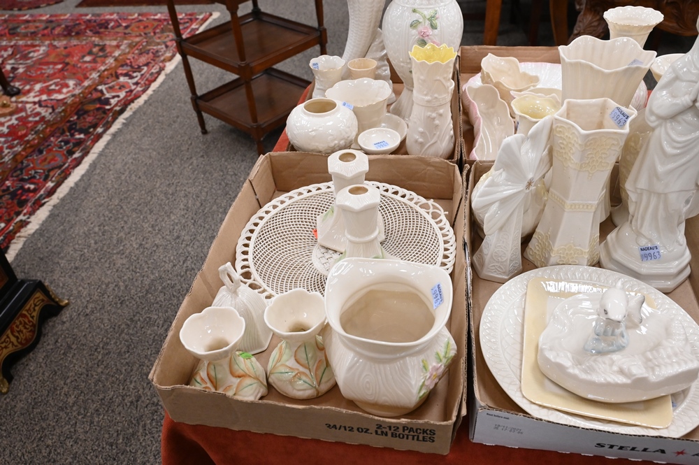 Lot 122: Five Tray Lots of Bellek, having green, brown, and new markings, to include vase, cornucopia, creamers, sugars, plates, dishes, etc.