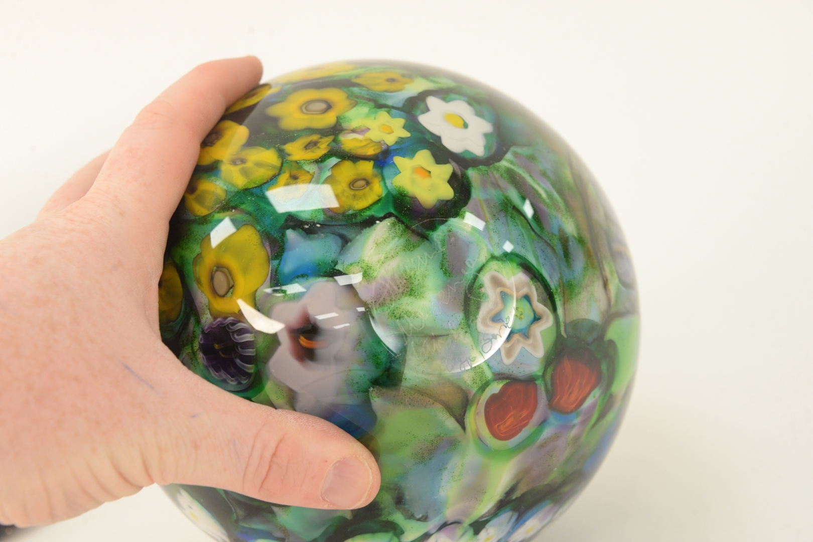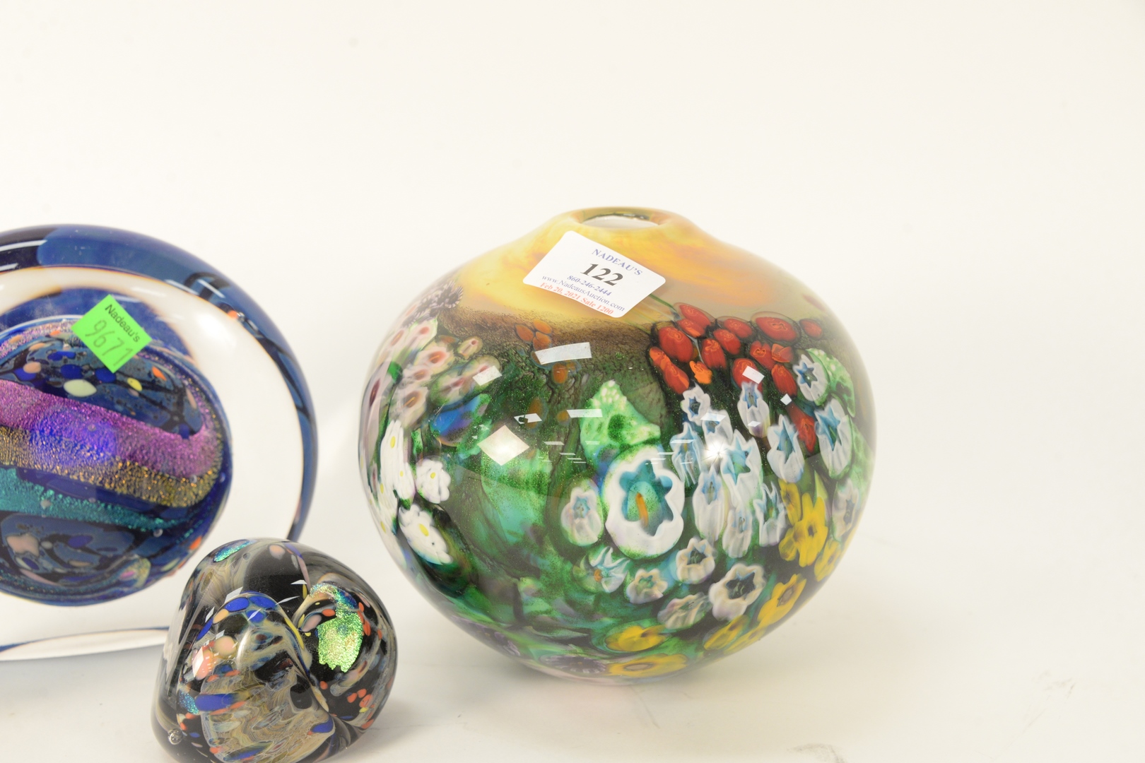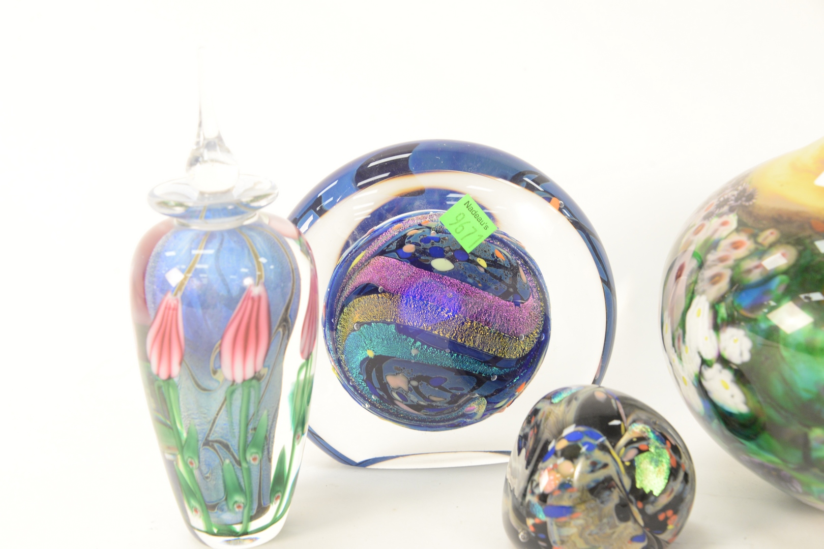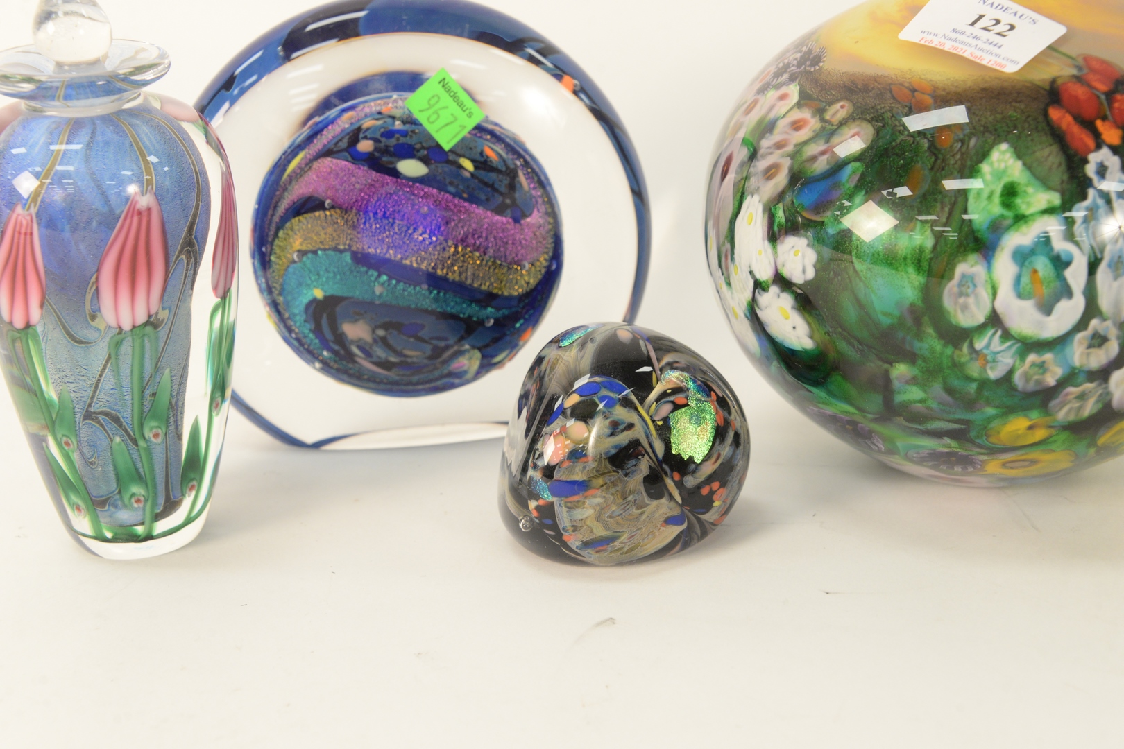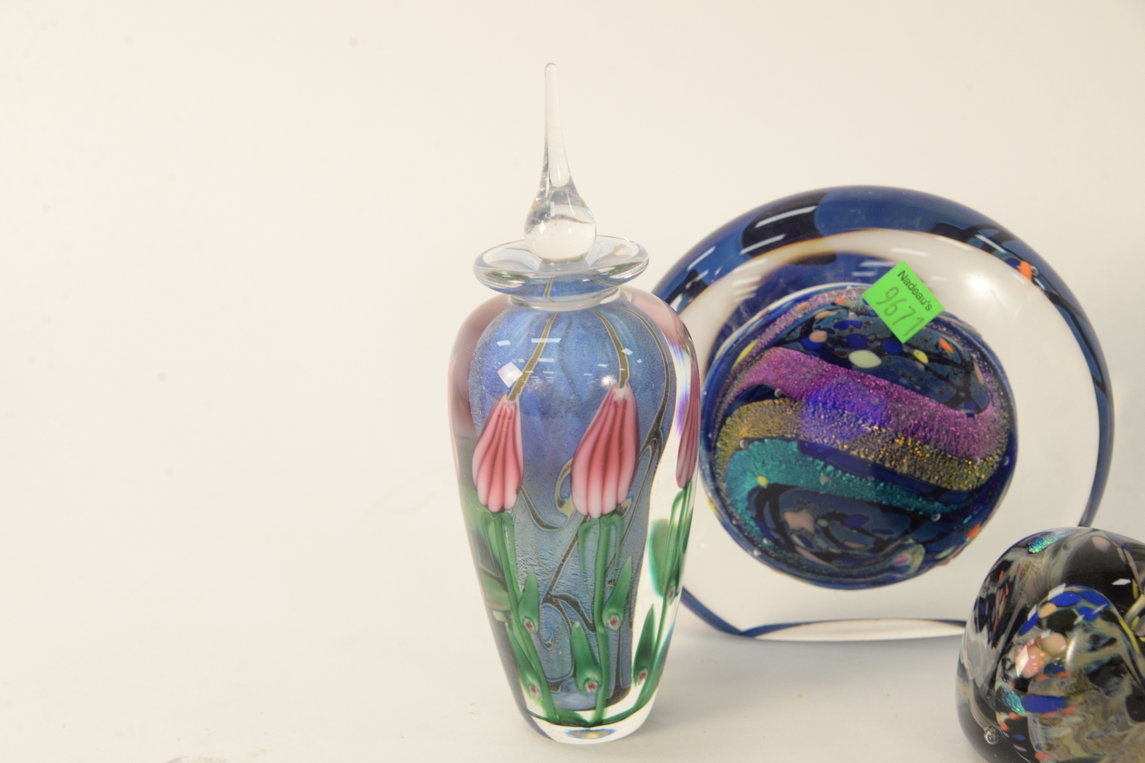 Lot 122: Four Piece Group, to include Shawn Messenger Round Art Glass Vase, with floral motif; Doug Merritt Vandermark art glass perfume or bottle, signed on bottom; a Rollin Karg art glass paperweight sculpture; along with a Rollin Karg paperweight, tallest 7 3/4 inches. Provenance: From the Marjorie & Howard Drubner Collection, Middlebury, Connecticut.