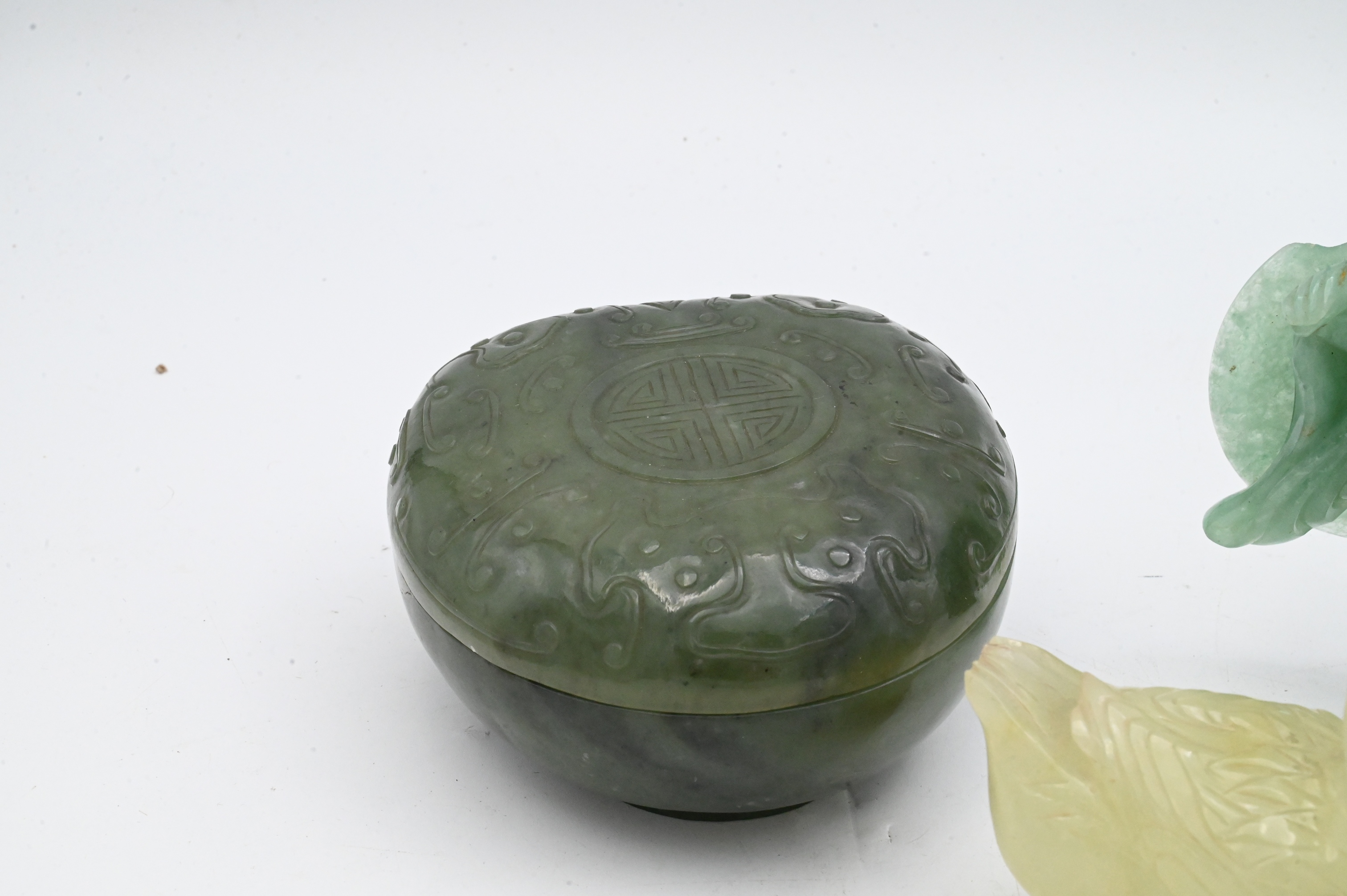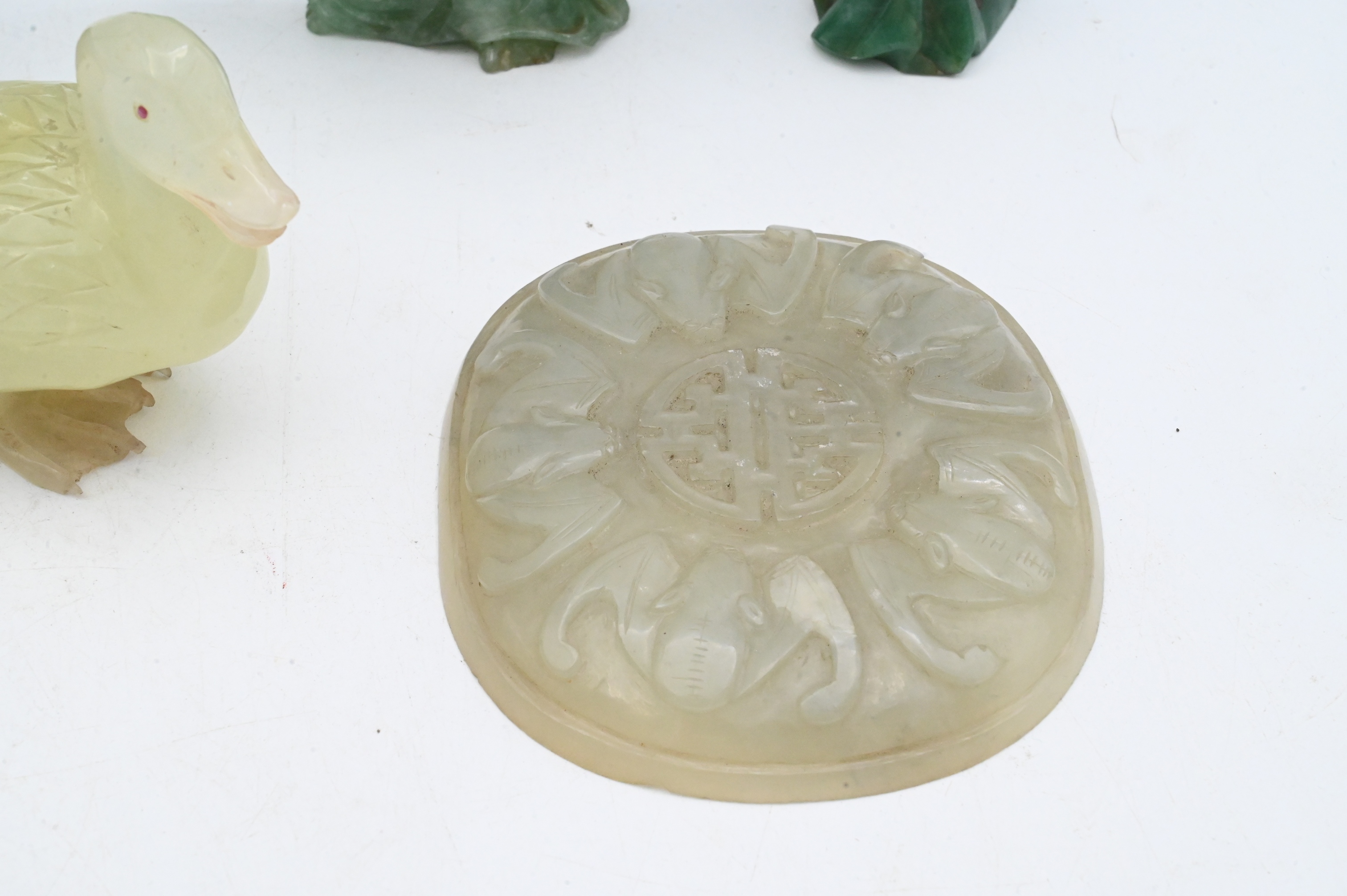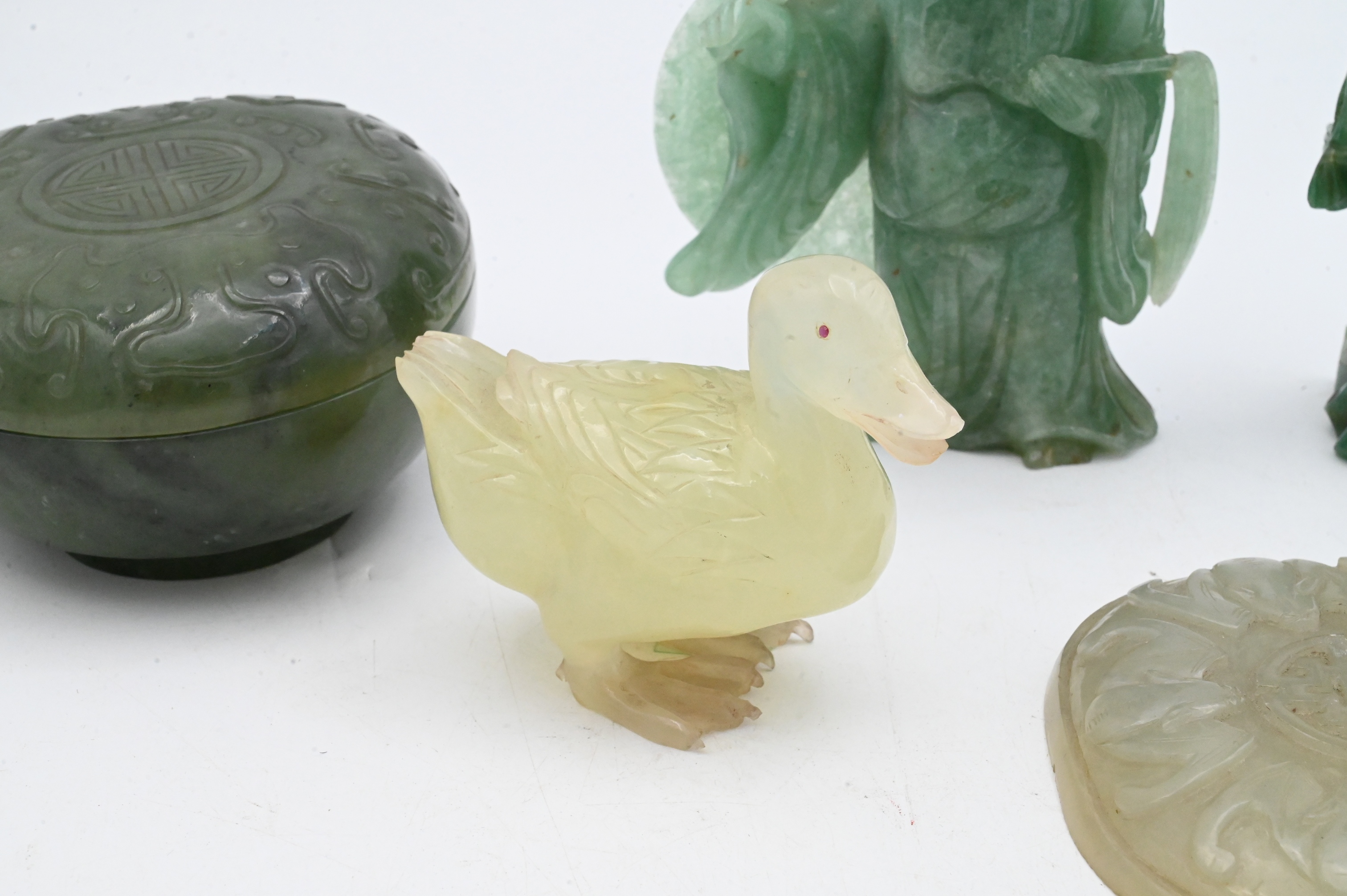 to include a celadon colored duck with inlaid eyes,height 3 1/4 inches, and a circular plaque carved in relief with a central shou character surrounded by five bats, together with a circular box and cover carved in low relief with a central shou medallion within ruyi cloud scrolls etc…