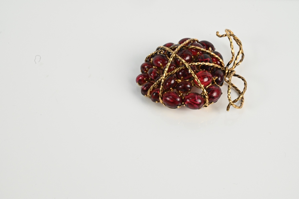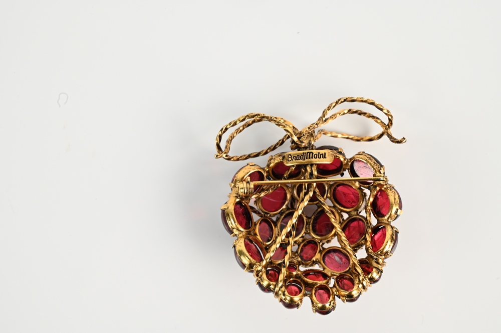 Lot 122: Iradj Moini Gilt Brass Brooch, heart shaped with red cabochon, height 2 1/2 inches.