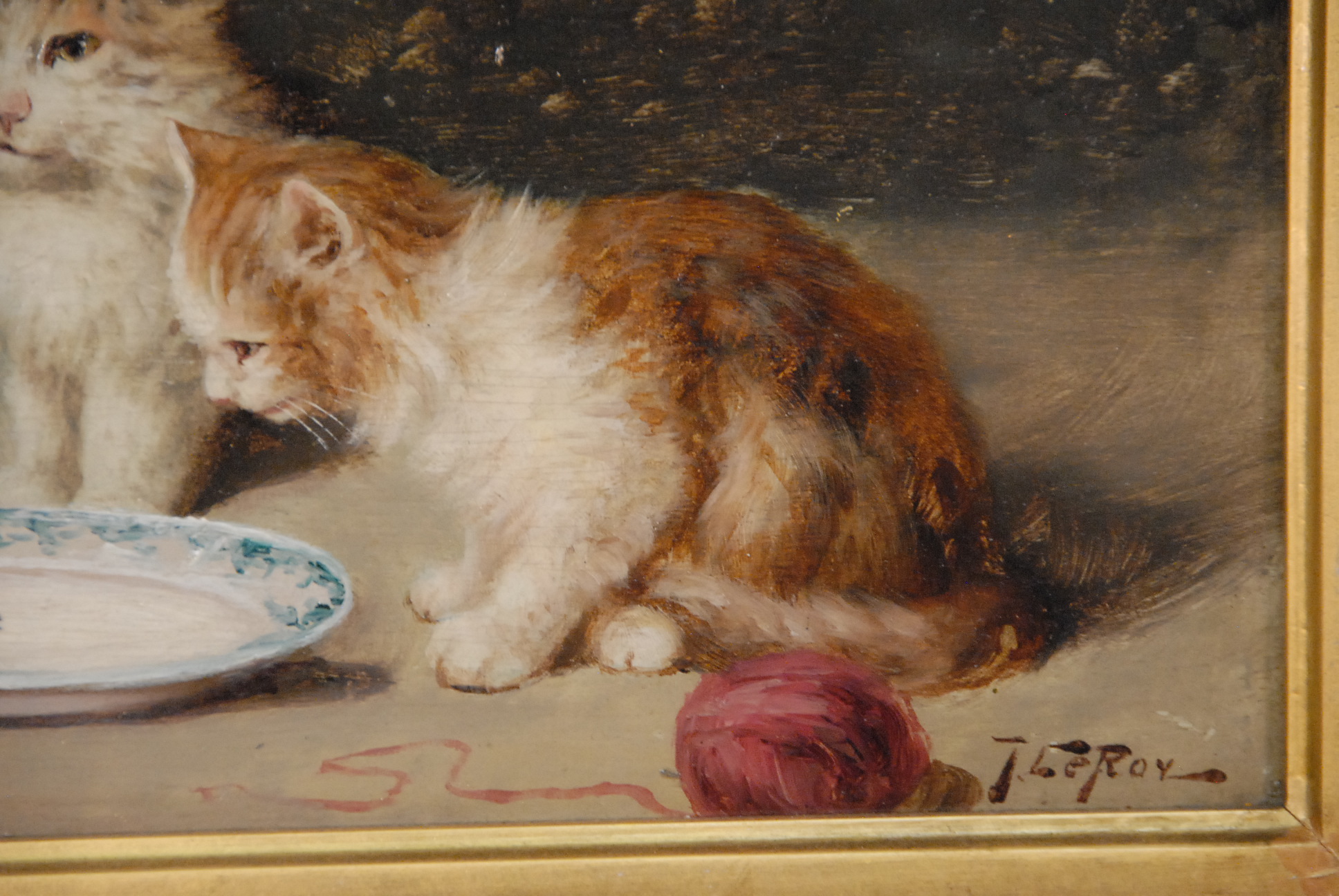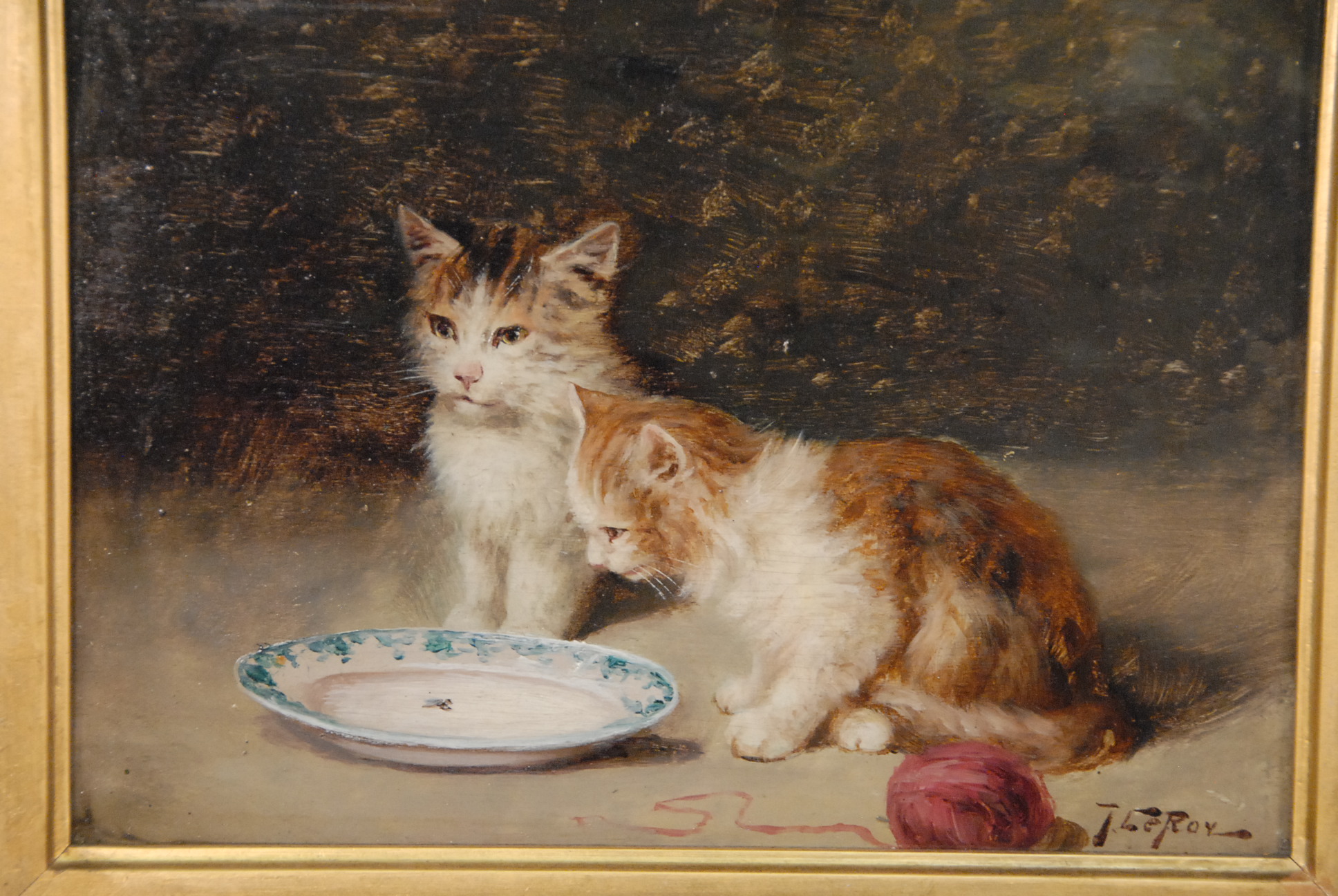 Lot 122: Jules Gustave Leroy 1856-1921 THIRSTY KITTENS oil on panel signed lower right J. LeRoy 7 1/2 x 9 1/2