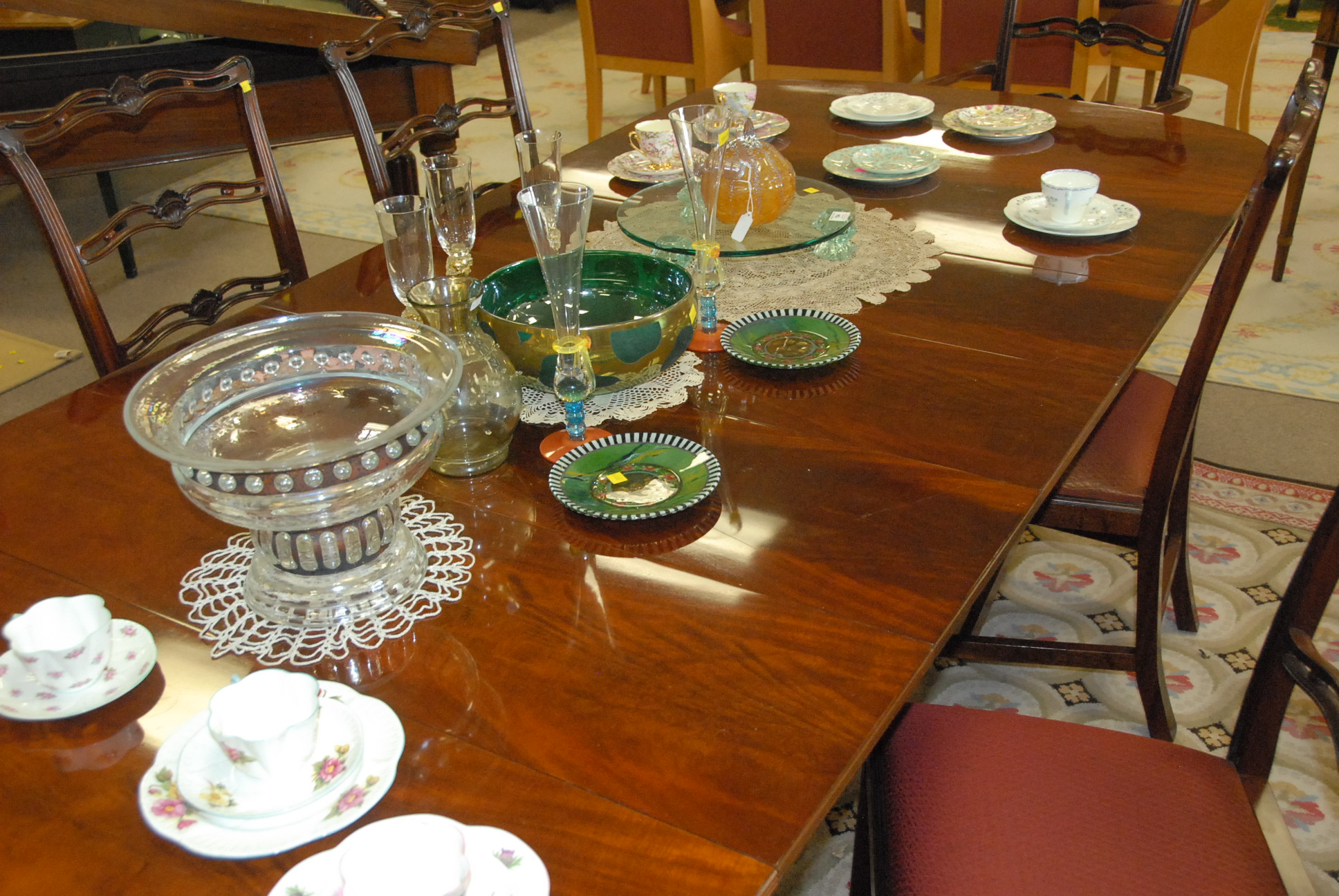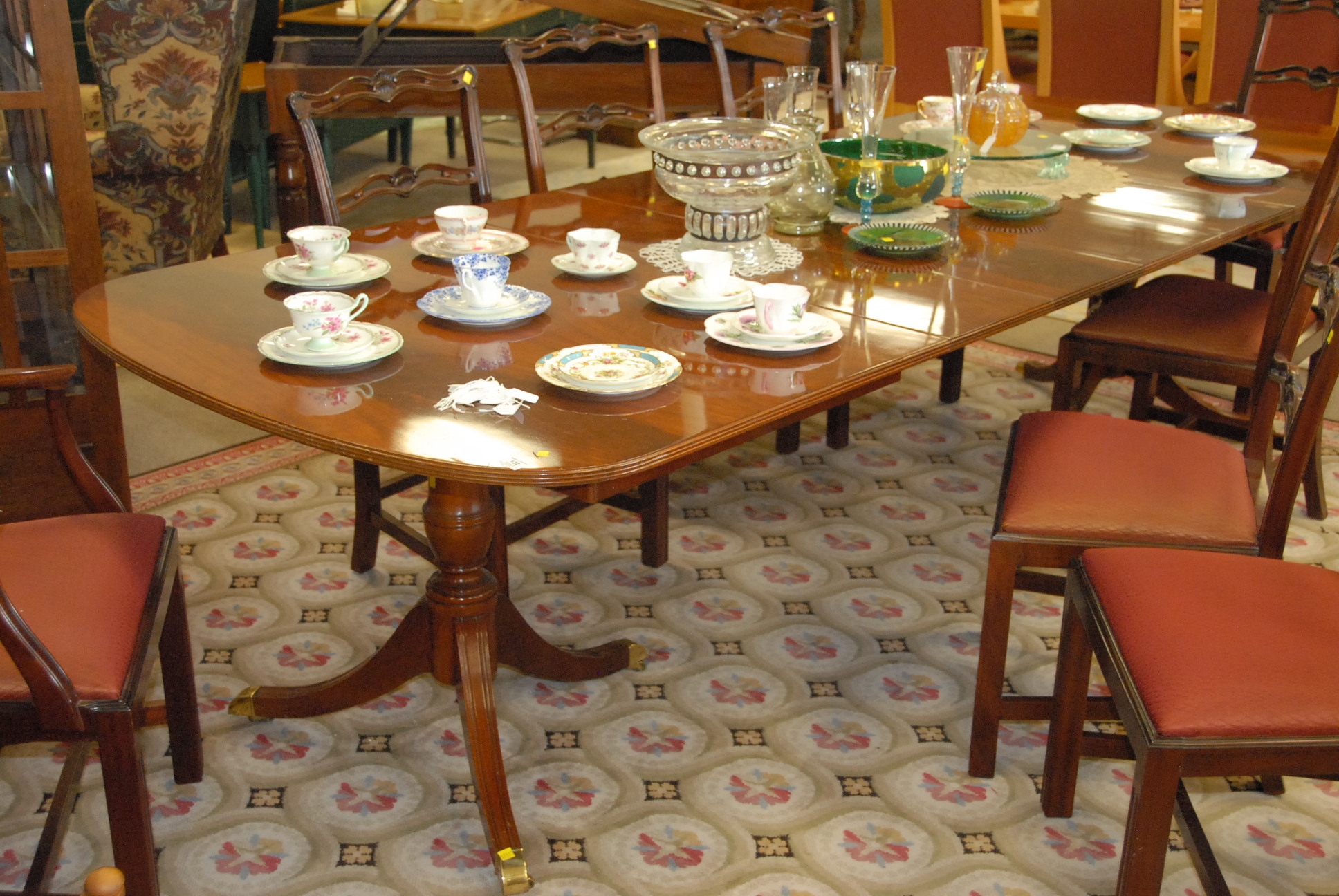 Lot 122: Kindel custom mahogany dining table with crotch mahogany top, four 12 leaves, and pads, signed Kindel, top: 46 x 72, opens to 120…
