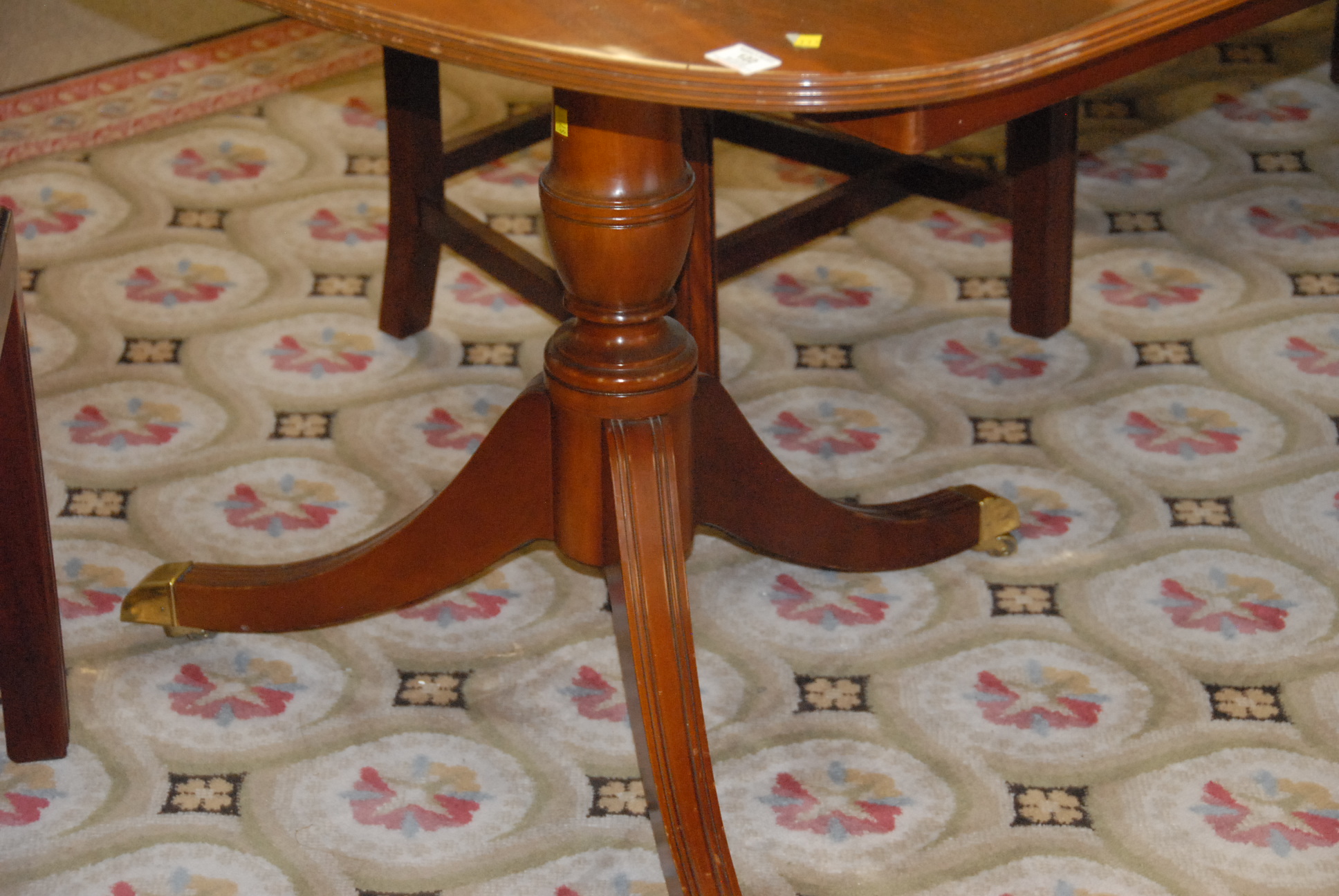 Kindel custom mahogany dining table with crotch mahogany top, four 12 leaves, and pads, signed Kindel, top: 46 x 72, opens to 120 in.
