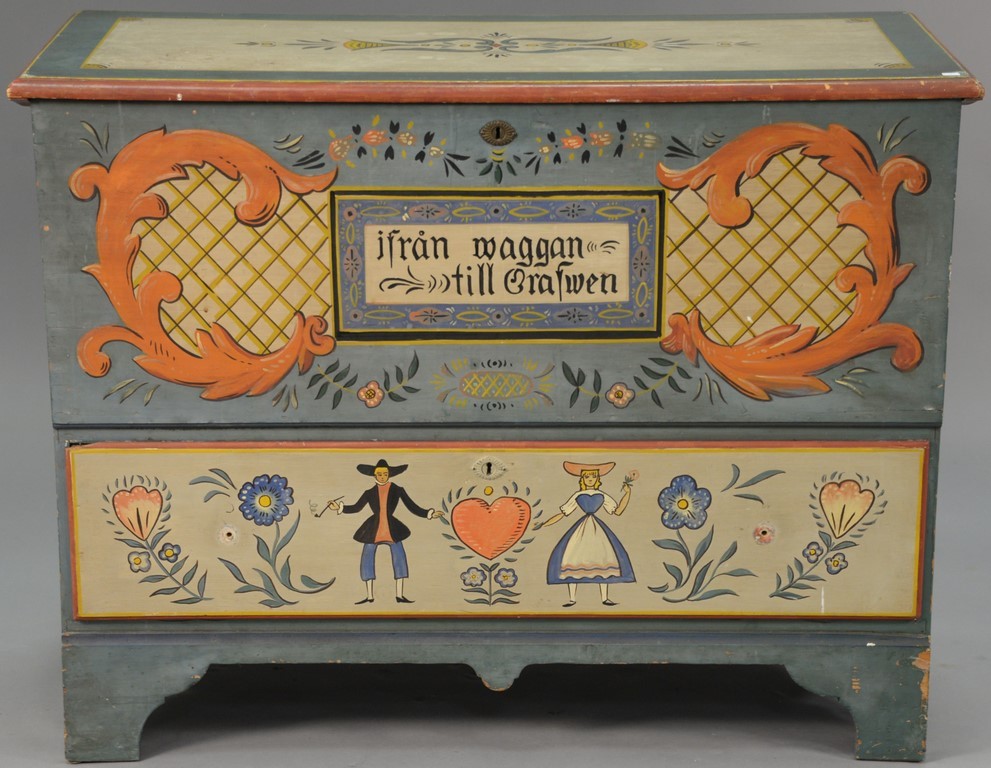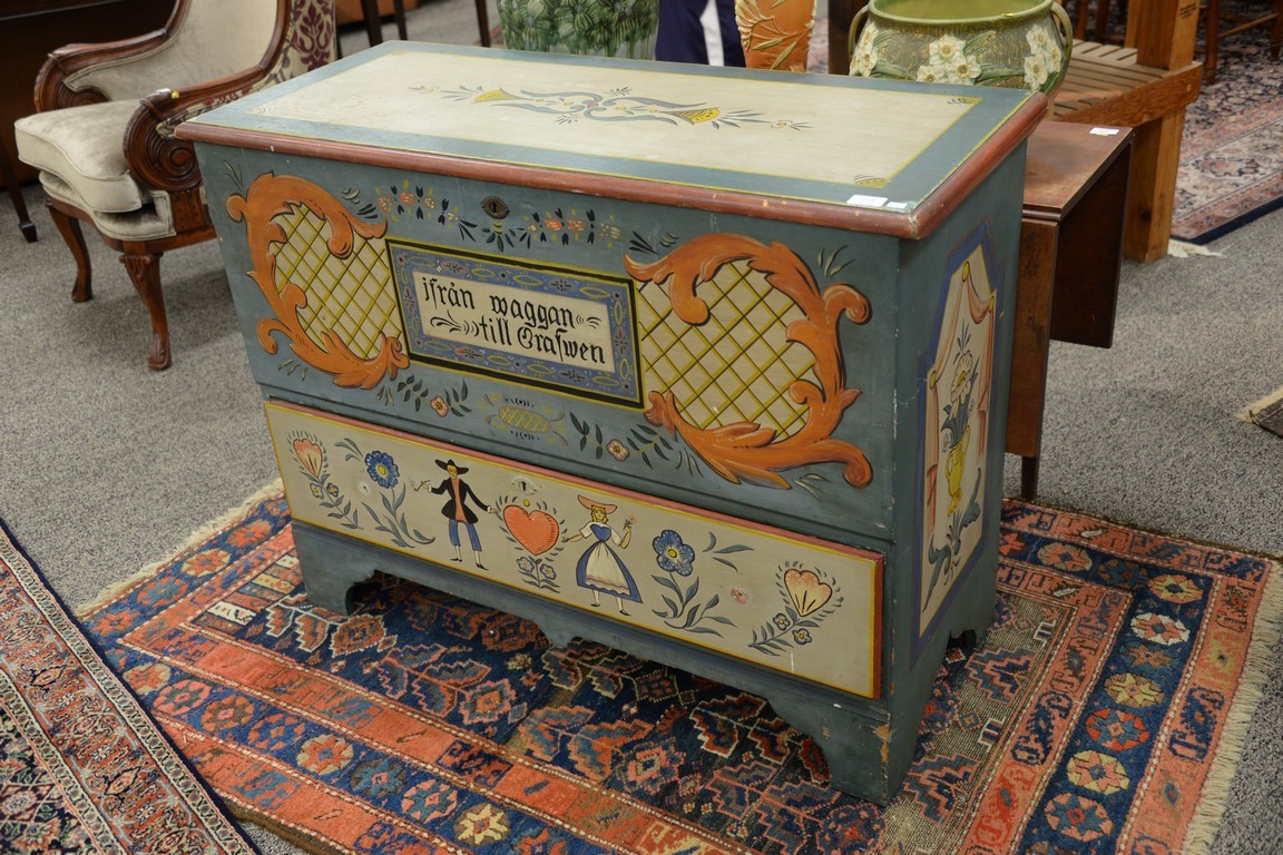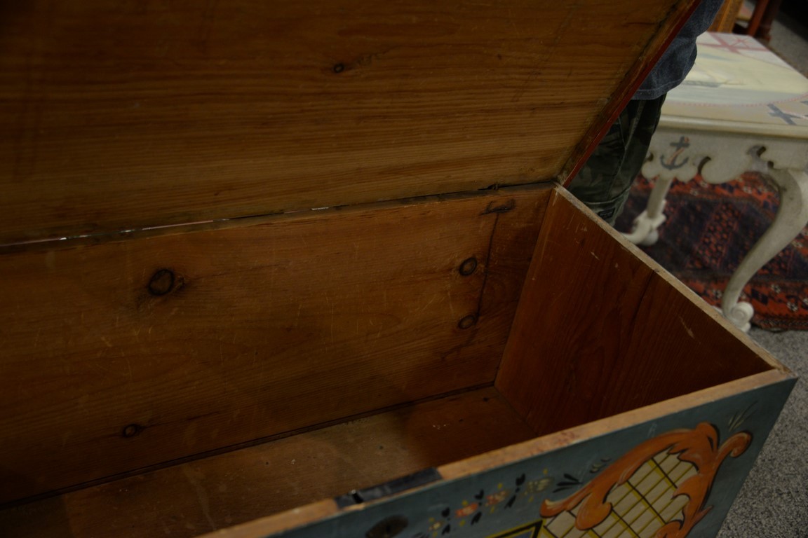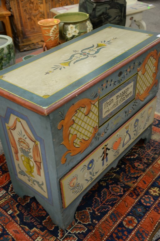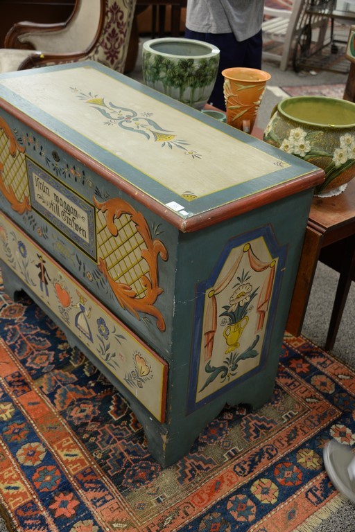 Lot 122: Lift top blanket chest with drawer on cut out bracket base, late 18th to early 19th century repainted. ht. 33in., wd. 44in., dp. 1…