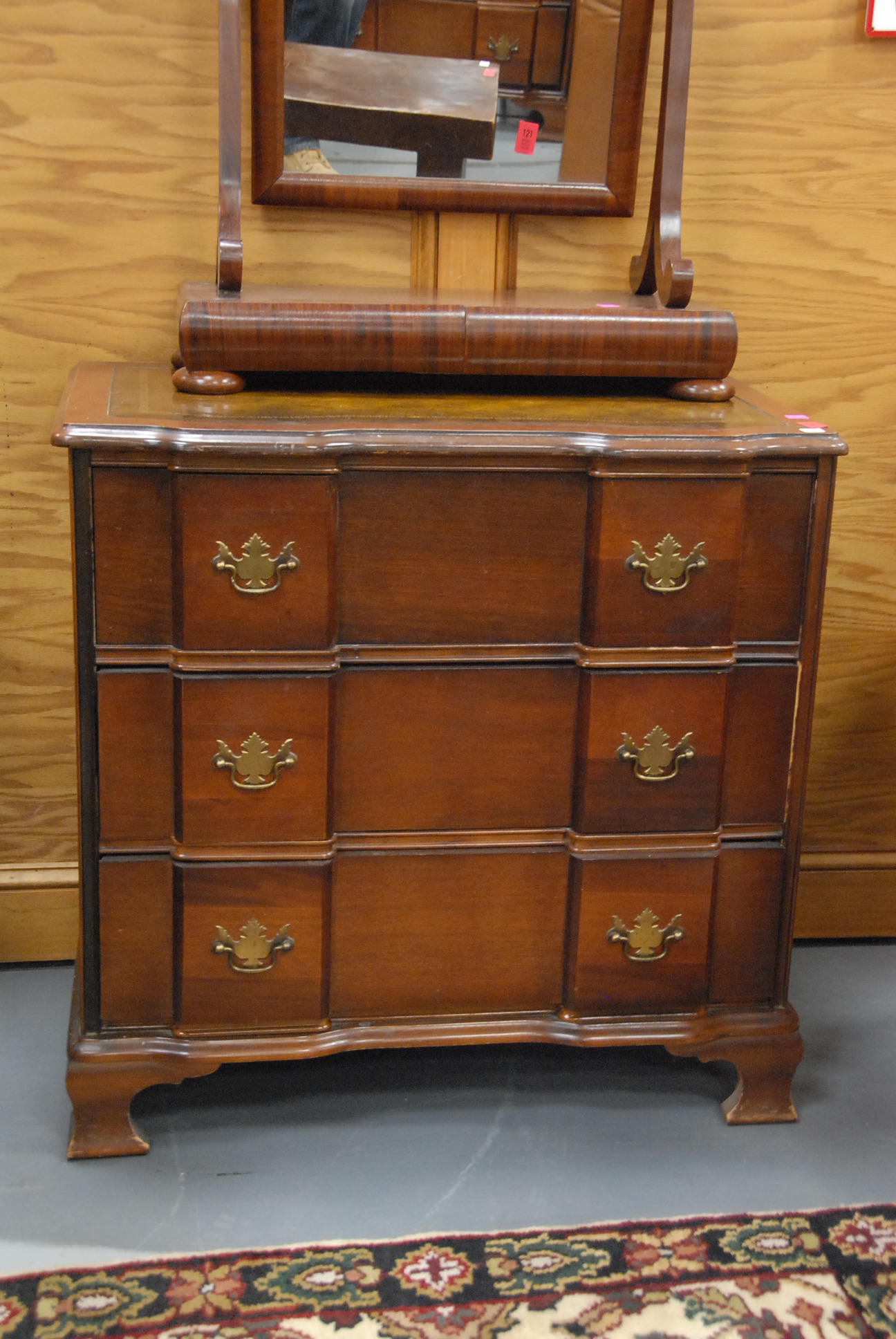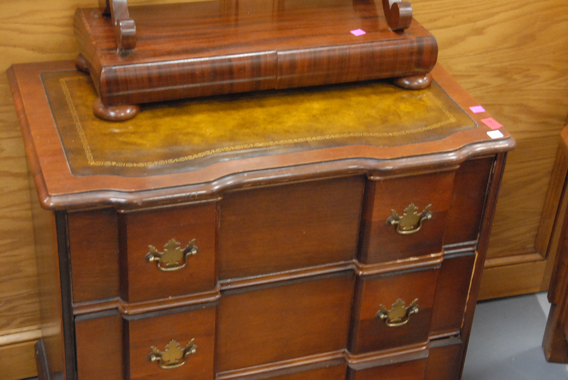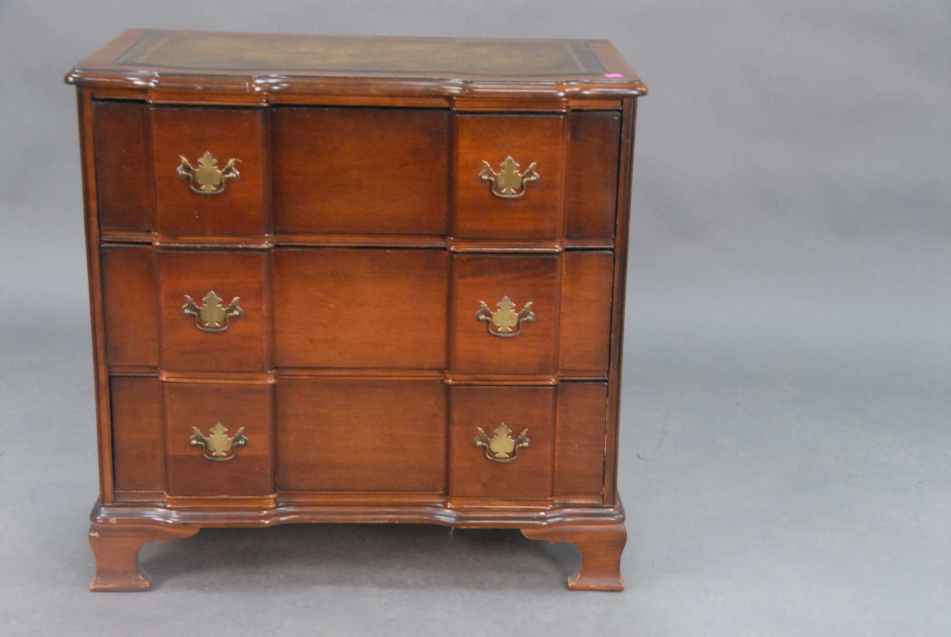 Lot 122: Pair of custom mahogany three drawer block front chests with inset leather tops, ht. 28 1/2in. wd. 29in.