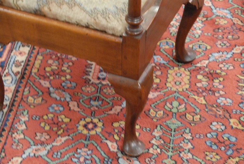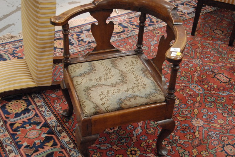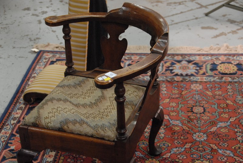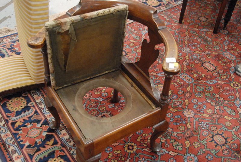 Queen Anne round about chair on four cabriole legs ending in pad feet, seat was once cut out for potty, ht. 29in. wd. 26in. seat ht. 15in.