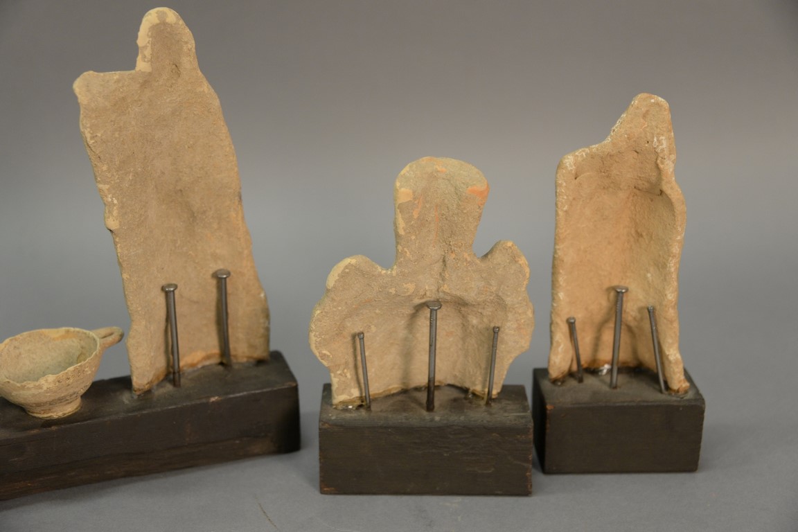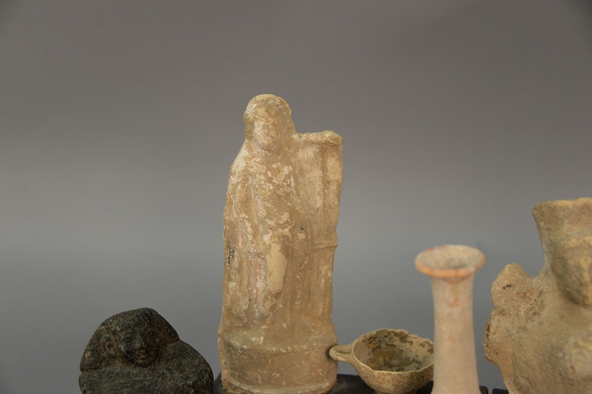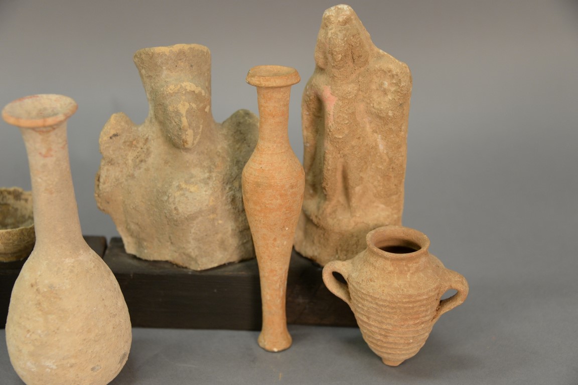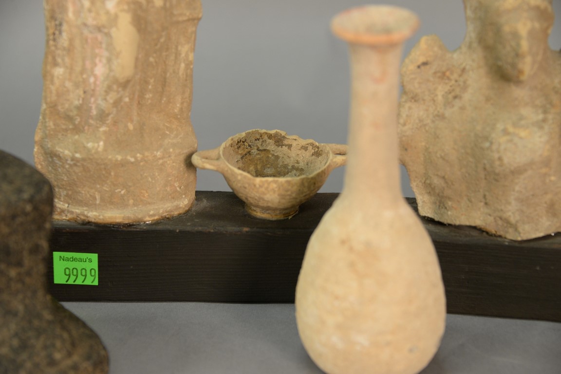 Lot 122: Seven Egyptian pieces to include a carved stone Pharaoh, three clay figural tomb tablets, and three clay vases. ht. 3in. to 6in.