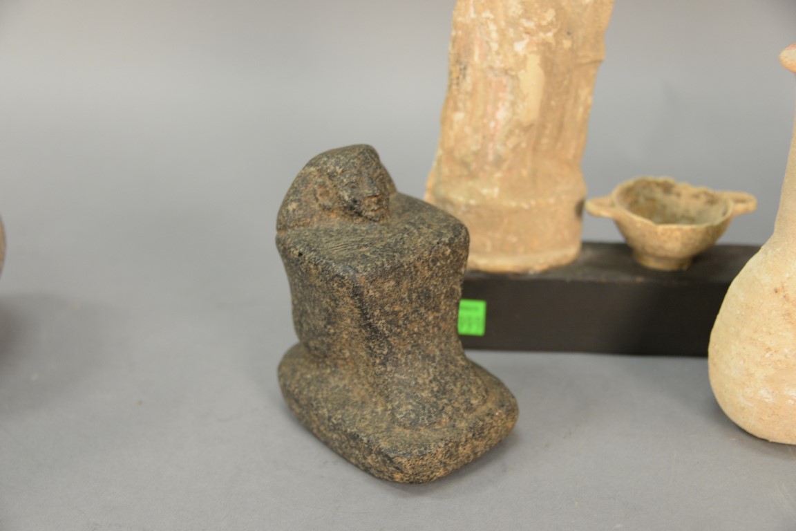 Seven Egyptian pieces to include a carved stone Pharaoh, three clay figural tomb tablets, and three clay vases. ht. 3in. to 6in.